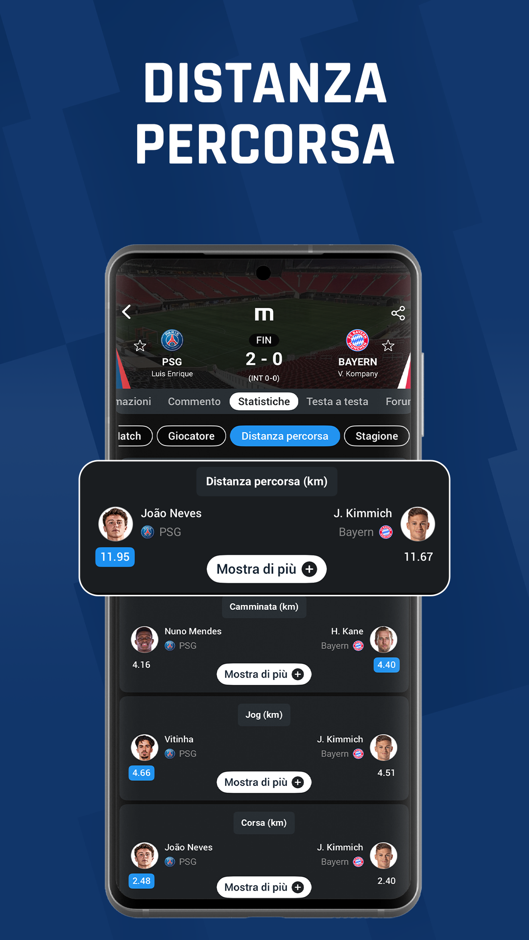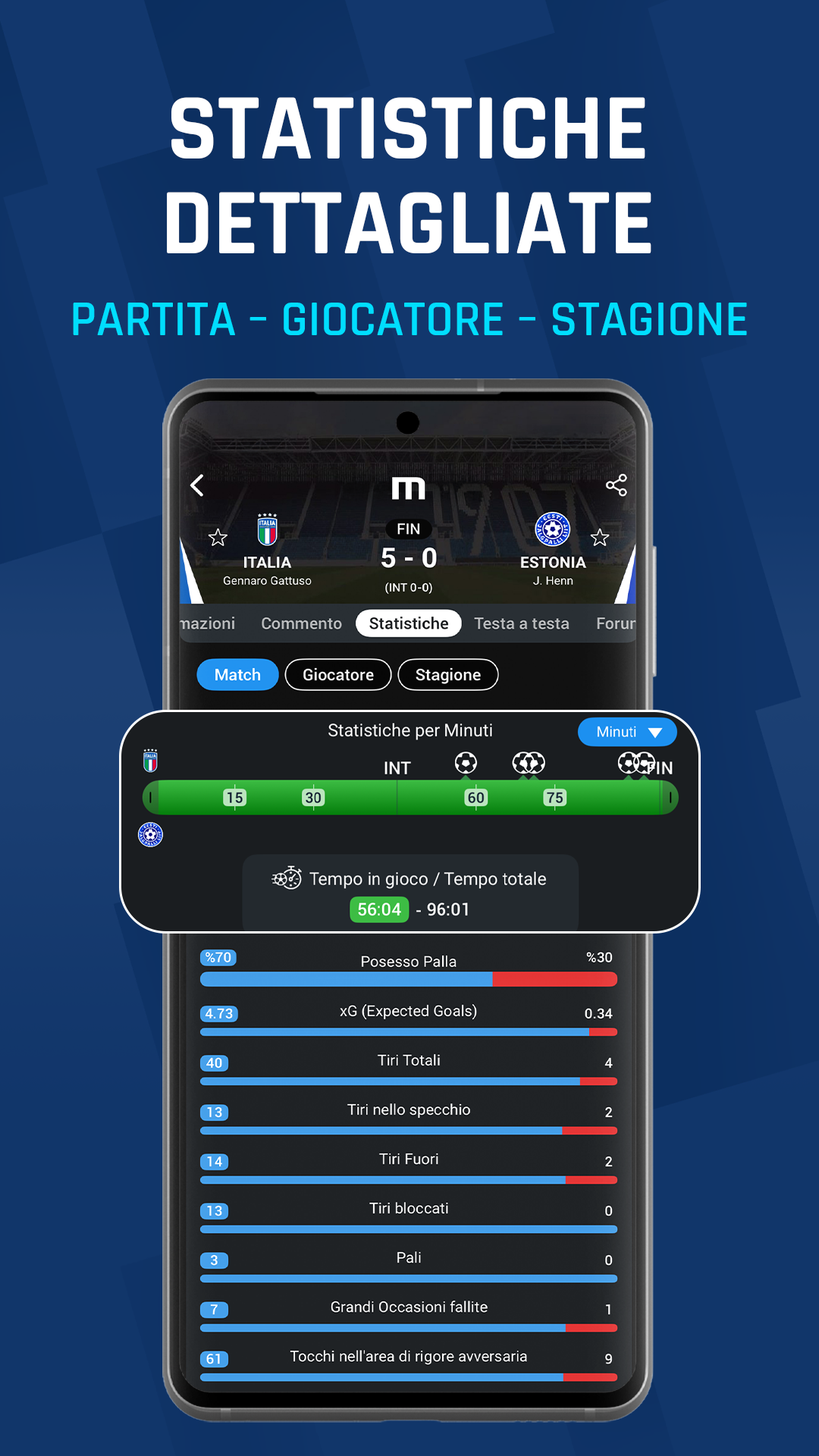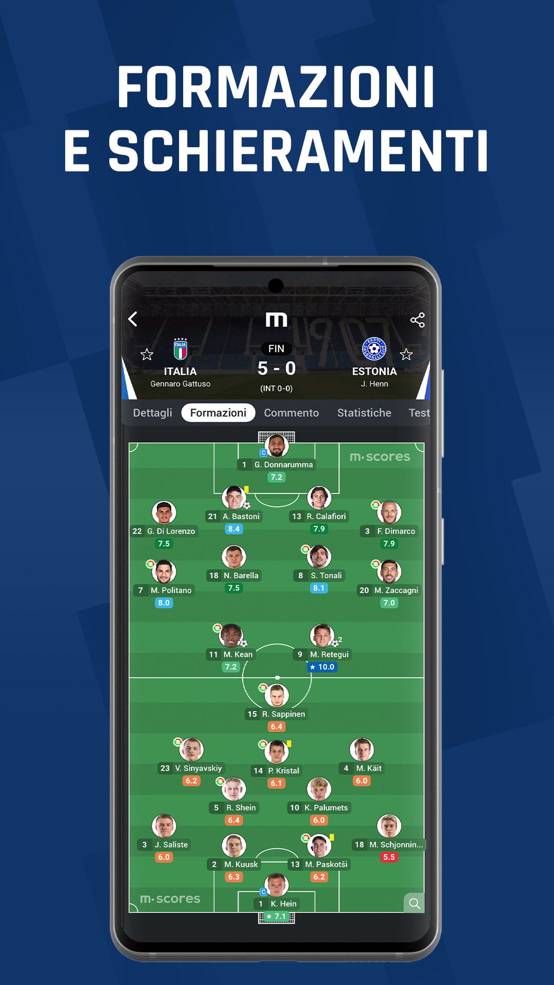 SCHEDA FORMAZIONI AGGIORNATA Le pagine delle partite su M Scores sono ora più complete. Nella scheda Formazioni puoi vedere età, altezza e nazionalità dei giocatori, oltre a statistiche come valutazioni, tiri, xG, falli e distanza percorsa, prima, durante o dopo la partita. Tutte le informazioni sono accessibili su un’unica schermata passando tra i segmenti. Un nuovo modo di vivere le formazioni, a portata di mano!