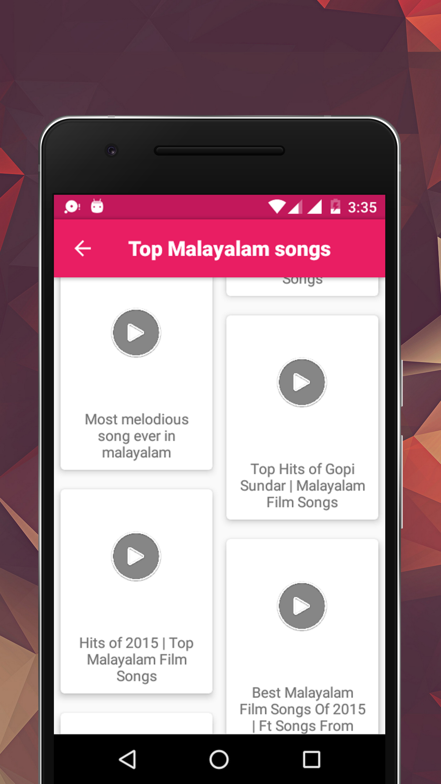 In this app you will get Malayalam video songs. Exceptional indian music along with highly creative lyrics add to mesmerizing voices of yesteryears' famous malayalam singers. I hope you will have fun using this app by watching malayalam lovely songs.