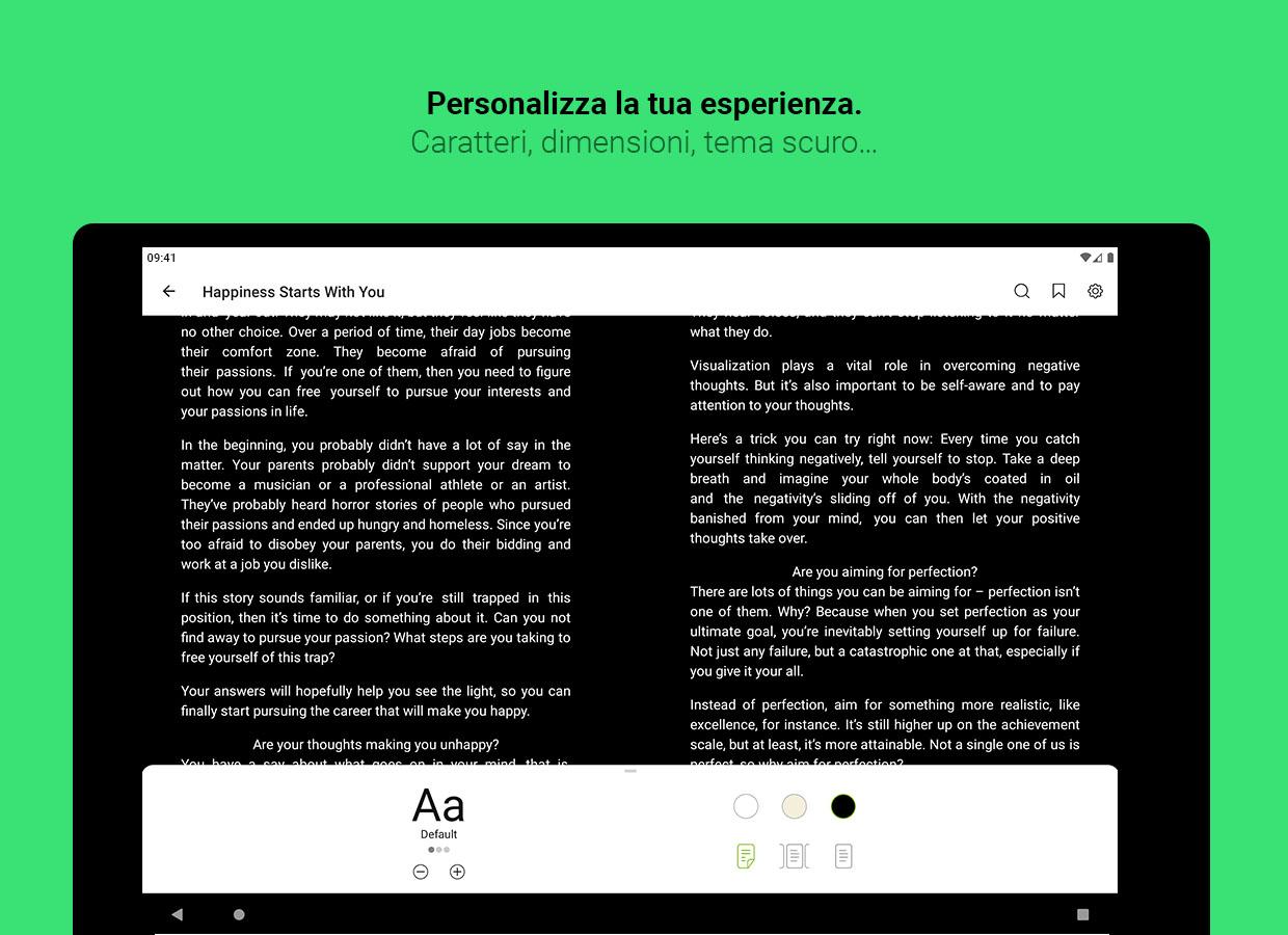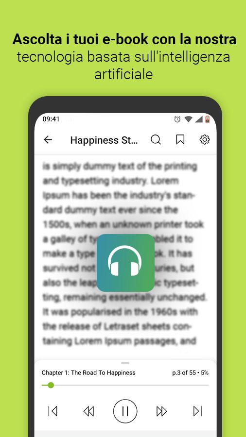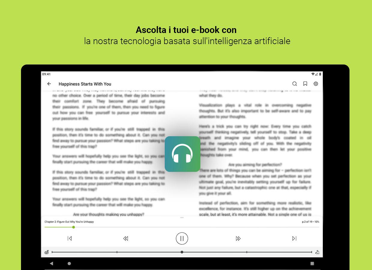 • Leggi ad alta voce: con la nostra tecnologia di sintesi vocale basata sull'intelligenza artificiale ogni e-book diventa un audiolibro.