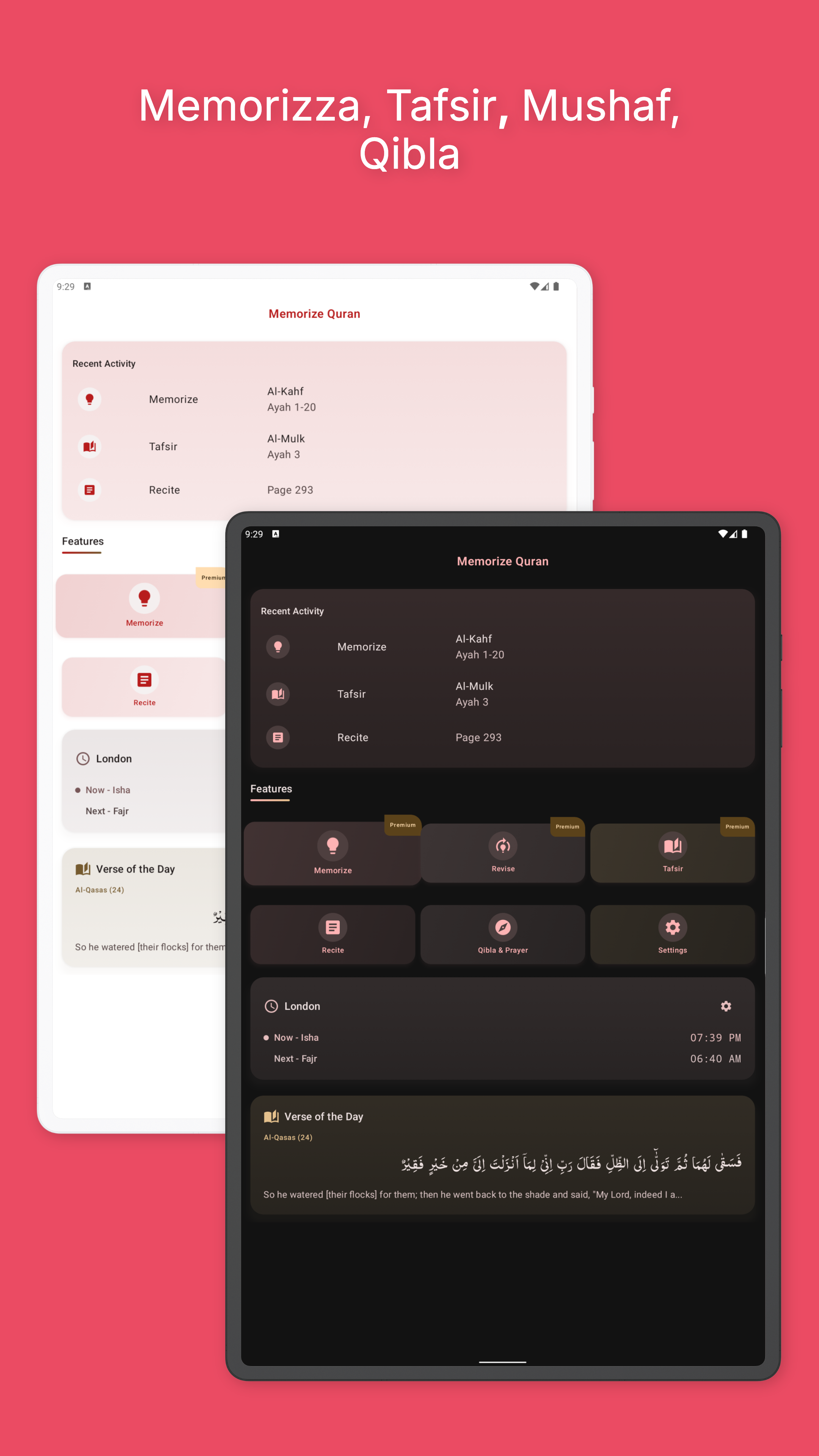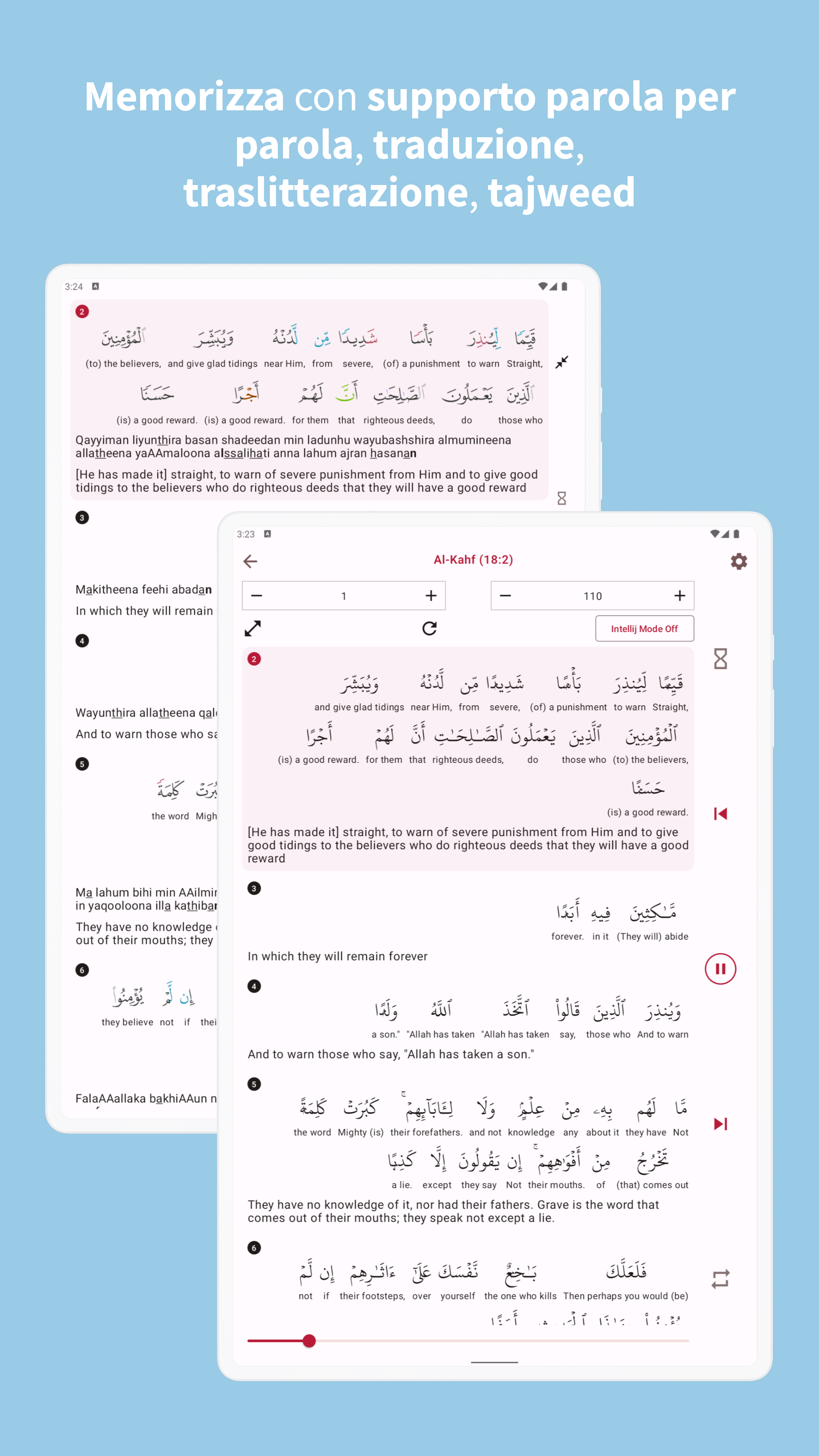 • Strumenti di studio: Tafsir Ibn Kathir, traduzione parola per parola e evidenziazione del Tajweed.