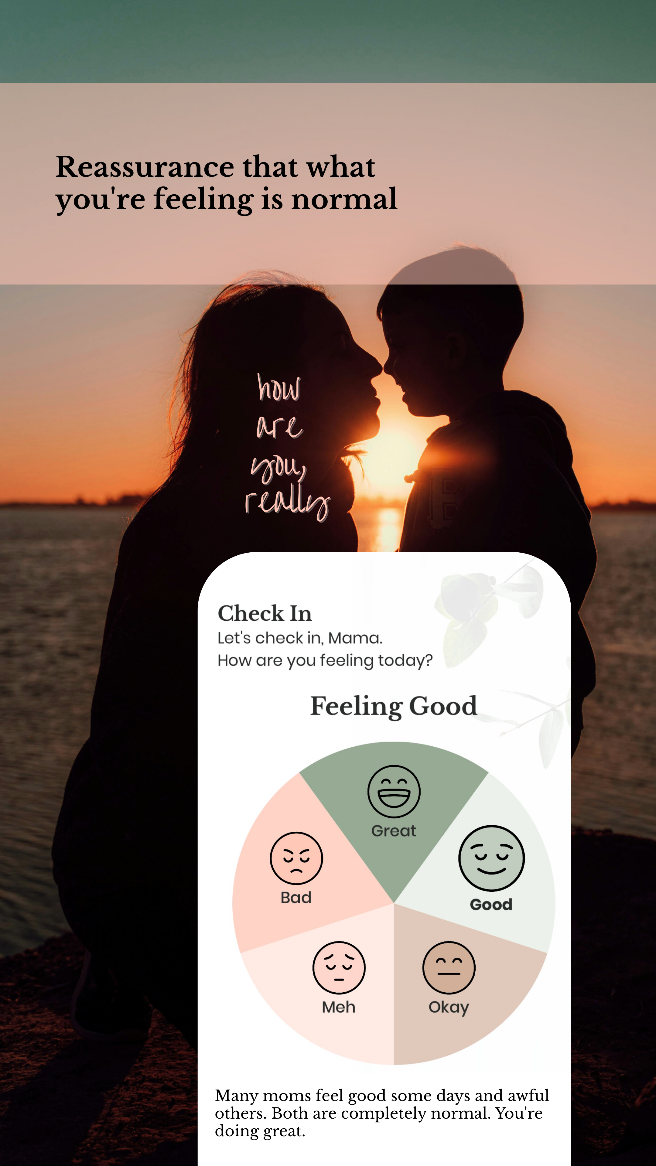 Let's check-in, Mama. How are you feeling today? In this update, we've added a safe and private place to "Check In" with your emotions, feelings, and sleep with a daily mood tracker. Did you know mood tracking is a powerful tool for moms to learn healthy ways to identify and express emotions while creating daily habits to help improve overall mental health? We hope you 'Check In' daily with us! You are doing great, Mama.