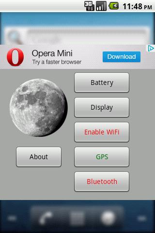 Moon Battery Widget shows the exact battery level as the phases of the moon. Pressing this widget allows to change Battery, Display, WiFi, GPS and Bluetooth Settings. If you find an error or have any questions, write me an email. After installation, you must manually add the widget to the home screen. How to add widget to the home screen: 1.On your home screen of your Android device, tap any blank or "empty" area and hold down your finger. 2.The "Add to Home screen" window will appear. Tap on "Widgets". 3.List of all the installed Widgets on your Android device will appear. 4.Select the widget to add to your home screen. Note: On Android Ice Cream Sandwich add widget by selecting icon widgets menu near apps menu.