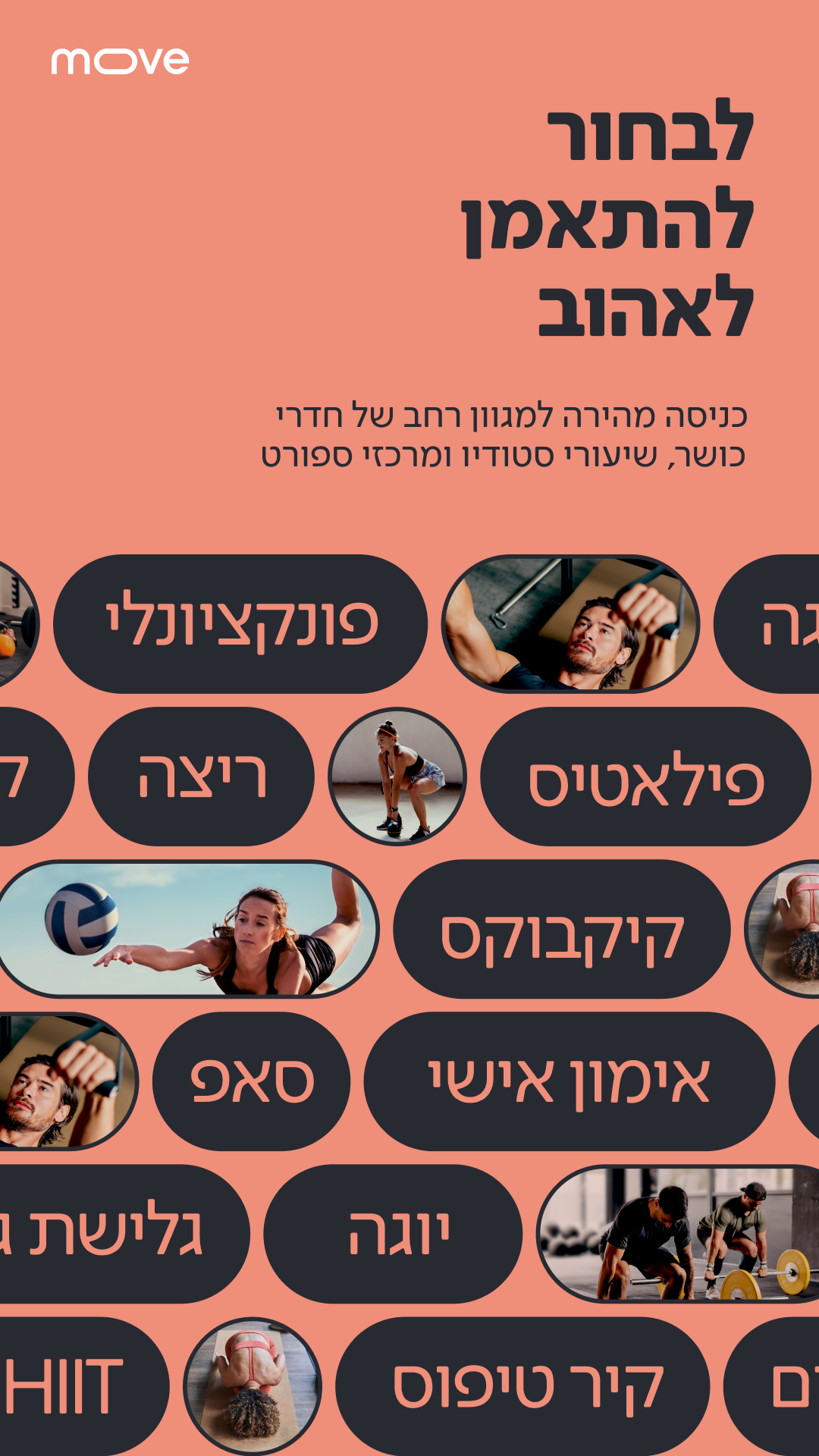 Benvenuto a trasferirti, L'app di fitness e benessere di Israele. La libertà di entrare in tutti i complessi sportivi di allenamento e cura, dove, quando e quanto vuoi. Infinite attività di fitness, sport e benessere a livello nazionale e tutto in un unico abbonamento. Da ora in poi scegli le attività più adatte a te, all'orario che ti è più comodo e nel luogo che ti è più comodo! Con un abbonamento all'applicazione, puoi inserire più di 1.800 complessi nell'applicazione che includono una grande varietà di attività: fitness club grandi e attraenti, country club coccolanti, uno studio di pilates e yoga per flessibilità e forza, un duro allenamento funzionale o una partita di tennis e un'altra grande varietà di attività di fitness insieme a dozzine di trattamenti alternativi che includono Altro: agopuntura, massaggio tissutale, camere a pressione, pietre calde, Tuina e altro ancora a livello nazionale. Quindi, come funziona? Ti iscrivi all'applicazione, scegli il percorso di credito appropriato per la quantità di attività che desideri e inizi a diversificare in modo semplice e flessibile dove, quando e quanto vuoi. Ogni mese riceverai un importo di crediti in base al percorso che hai scelto. Se non hai utilizzato tutti i crediti in un determinato mese, nessun problema! Manterrai i crediti per il mese successivo. È possibile accumulare 2 volte l'altezza del percorso. Dove puoi entrare con move? Che tu abbia voglia di concederti un massaggio o un trattamento dei tessuti, di praticare yoga o di preferire l'HIIT e l'allenamento funzionale duro, su move troverai un'enorme varietà di attività adatte a tutti. Da ora in poi potrai scegliere se andare ad allenarti ogni volta in un posto nuovo, oppure frequentare nuovi corsi e palestre che non hai mai visitato senza sottoscrivere un abbonamento in un solo posto. L'app move ti consente di provare diverse lezioni sportive e attività di benessere, anche se hai già un abbonamento esistente presso una palestra, un club o un country club. Se hai voglia di andare a nuotare o giocare a tennis solo occasionalmente e nel luogo attuale in cui sei iscritto la possibilità non esiste, con move puoi goderti tutti i mondi! Come funzionano i crediti? Scegli il percorso di crediti adatto a te e ogni mese riceverai un importo aggiuntivo di crediti in base al percorso che hai scelto. Ogni attività presente nell'applicazione ha un diverso valore di crediti determinato in base al luogo, al tipo di allenamento e al suo tempo (praticare la meditazione, ad esempio, non equivale ad allenarsi in palestra, e una lezione di yoga al mattino non equivale entrare in piscina o in campagna durante lo Shabbat). Come faccio a sapere quale percorso di credito è giusto per me? È molto semplice. Inserisci le attività che fanno per te e scopri quanti crediti valgono. Esempi illustrativi di cosa si può fare con i crediti in ogni percorso possono essere visti nelle nostre storie nell'applicazione. Naturalmente il tipo di tracciato può essere cambiato in qualsiasi momento! Confuso su quale percorso di credito scegliere? Inizia con il percorso più piccolo da 20 crediti al mese e puoi sempre effettuare l'upgrade in base alle tue esigenze o annullare il percorso in qualsiasi momento senza fare domande e senza parlare con un rappresentante, premendo un pulsante direttamente dall'app. E se non ho utilizzato tutti i miei crediti? Il sistema dei crediti ti permette di fare quello che vuoi con il tuo abbonamento! Non dovrai più chiedere di bloccare l'abbonamento prima di viaggiare all'estero o perché sei sotto pressione sul lavoro, e se non hai utilizzato tutti i crediti dell'abbonamento questo mese, i crediti verranno automaticamente trasferiti al mese successivo in modo che siano accumulerà sul conto fino a 2 volte l'importo dei crediti del percorso. Se hai acquistato un abbonamento da 100 crediti, potrai accumulare fino a 200 crediti non utilizzati nei mesi precedenti. Finché l'abbonamento sarà attivo e valido, i crediti che hai accumulato saranno conservati per te per sempre. nessun obbligo - Puoi annullare l'abbonamento in qualsiasi momento e ottenere il rimborso della parte proporzionale non utilizzata fino al momento della cancellazione. Il calcolo verrà effettuato in base alla percentuale di giorni rimanenti fino alla fine del mese di abbonamento o all'importo dei crediti utilizzati fino a tale data, a seconda di quale sia inferiore. Cambio percorso - Puoi modificare facilmente il corso di crediti che hai scelto in ogni momento: l'upgrade del corso avrà effetto immediato, così potrai entrare adesso dove vuoi e ti verranno addebitati in questo momento solo i crediti aggiunti. Più basso è il percorso, avrà effetto nel prossimo ciclo di fatturazione. Ho visto che ci sono anche lezioni LIVE e VOD, quanto mi costerà? Le nostre lezioni online sono completamente gratuite! Chiedi perché? Perché sappiamo che sei impegnato e siamo qui per aiutarti ad adottare facilmente uno stile di vita sano. A volte, in una giornata piovosa, non abbiamo nemmeno l'energia per uscire di casa per una lezione di yoga (ma non dirlo). Tutti i nostri video VOD ti aspettano nell'app. Allora, cosa stai aspettando? Scarica l'app e inizia a diversificare: dove, quando e quanto vuoi!