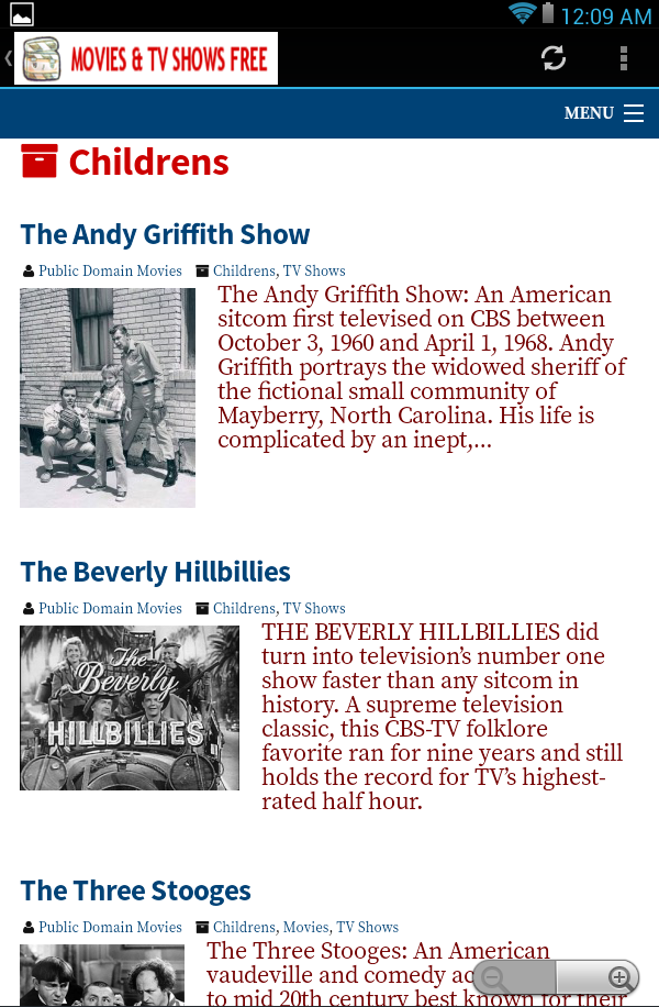 A robust app featuring ALL FREE Public Domain Movies, TV Shows with Commercials, Children's Movies, Television Shows, Classic Movies, Kids TV, MEGA SEARCH and More! ★ Cool New Look for Summer ★ Over 28,000 Results in our Search Database ★ Very Small Download Size (2.5mb) All in the convenience of a simple app that has all kinds of features being added daily. Plus, it's FREE! ★ Top Free Movie Downloads All-Time ★ Top TV Shows All-Time with Commercials ★ Search All Movies and TV Shows in Database ★ Millions of Free Movies and TV Episodes ★ Children's Movies and TV Shows ★ Classic Movies in Public Domain ★ Classic Commercials in Public Domain As a small market app developer we appreciate your taking the time to get to know us. We welcome any and all suggestions, feedback or questions so please feel free to reach out to us directly. You can find us at our http://publicdomainmovies.org website and on Google+ via http://plus.google.com/+briandanielyoung Thank you so much! Check out our other highly rated apps as well. Disclaimer: All content provided or linked via our apps is DMCA compliant and licensed under Creative Commons or in the Public Domain. Please notify us immediately if you have any questions regarding this issue.