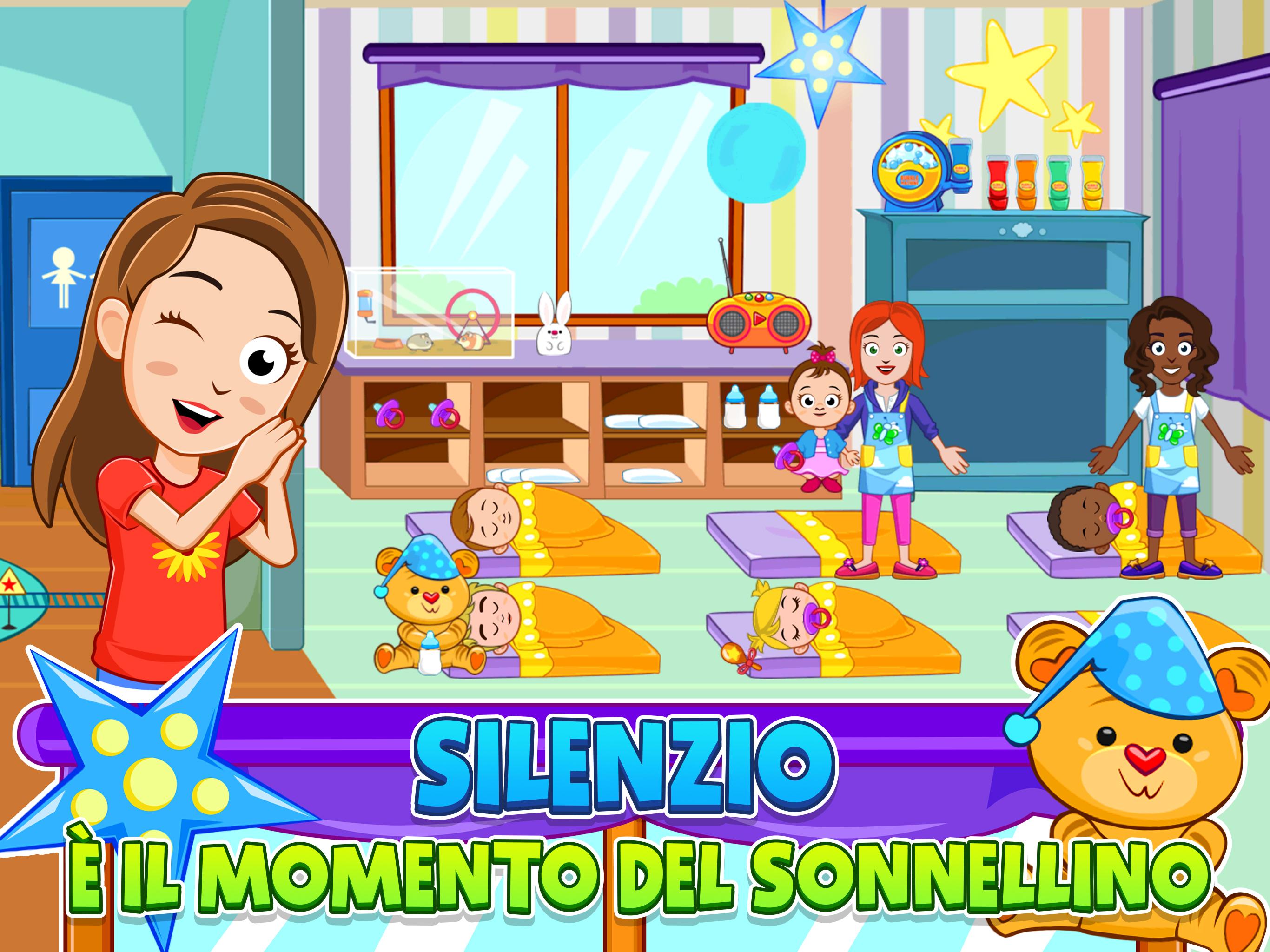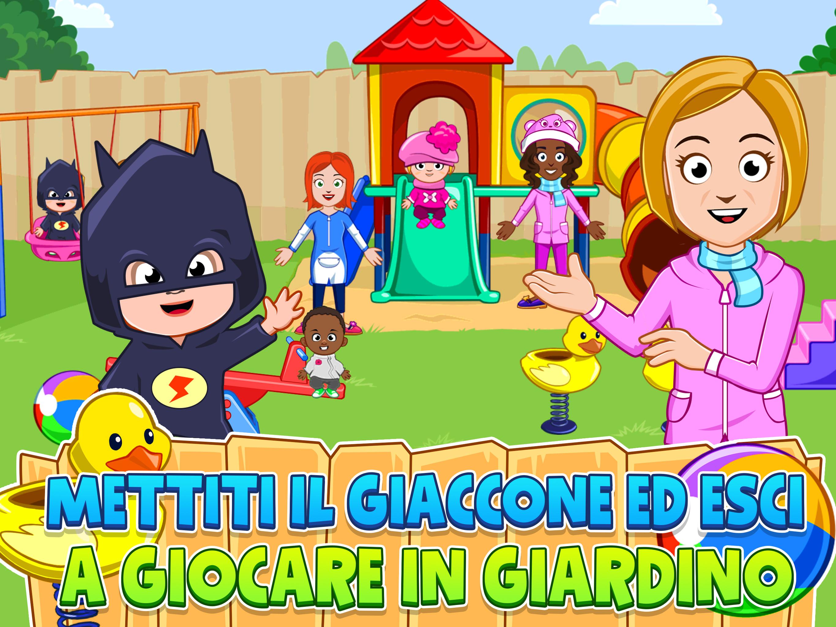 Nella nuova app My Town - Daycare puoi divertirti portando 6 graziosi bimbi all'asilo. Fagli fare la nanna, vestili per farli giocare in giardino, e divertiti con tutte le 4 stagioni! NUOVA CARATTERISTICA AGGIUNTA – LE STAGIONI Preferisci l'estate? O forse l'inverno? Imposta la stagione che vuoi con il dispositivo sopra la porta, ed esci: per ogni stagione hai a disposizione una collezione speciale di vestiti, cappelli e giacconi per tutti i bimbi! GIOCA, IMMAGINA, SCOPRI Con così tante stanze, attività e articoli di abbigliamento, questo gioco catturerà l'immaginazione di ogni bambino, regalando ore e ore di gioco creativo, ogni volta sempre diverso. CHE COSA SONO I GIOCHI MY TOWN? I nostri giochi consistono in luoghi virtuali in “My Town”, come - ad esempio – la stazione di Polizia, la casa, l'ospedale, la spiaggia e l'ultimo arrivato: l'asilo. Offriamo ai bambini un mondo virtuale in cui possono giocare con creatività in completa sicurezza, senza annunci pubblicitari né acquisti In-App! IN ARRIVO UN NUOVO AGGIORNAMENTO Per realizzare i nostri fantastici giochi, forniamo continuamente aggiornamenti con nuovi contenuti, modifiche e - se necessario - correzioni di errori. Il nostro prossimo aggiornamento includerà ancora più giocattoli e articoli alimentari per la cucina dell'asilo. CARATTERISTICHE DI GIOCO: - 12 personaggi, inclusi 6 adorabili bimbi, 2 maestre d'asilo, mamma, papà, sorella e fratello - 6 diversi ambienti da scoprire e in cui giocare - Più di 900 suoni ed elementi diversi! - Quattro stagioni: estate, inverno, autunno e primavera, e l'abbigliamento adatto per ognuna! - La più bella gabbietta per criceti, da ingrandire e decorare! - Nessun annuncio pubblicitario né acquisti In-App - Nessun limite di tempo, nessuno stress point, né punteggi da battere - Ogni partita è sempre diversa * App consigliata da insegnanti di scuola dell'infanzia, logopedisti e genitori di tutto il mondo! * App creata sotto la guida di psicologi infantili * App progettata per far giocare i bambini da soli o insieme agli amici e alla famiglia NON ESSERE TIMIDO! Puoi contattarci facilmente su Facebook o su Twitter per farci sapere cosa ritieni possa essere modificato, aggiunto o inventato, anche soltanto per te. Ci impegniamo a leggere ogni messaggio e a rispondere a tutti. Scrivici quale parte di My Town vorresti che realizzassimo in futuro, cosa ritieni manchi nell'app, e cosa vorresti suggerire. Per condividere i tuoi pensieri con noi vai su: Facebook - https://www.facebook.com/mytowngames Twitter - https://twitter.com/mytowngames