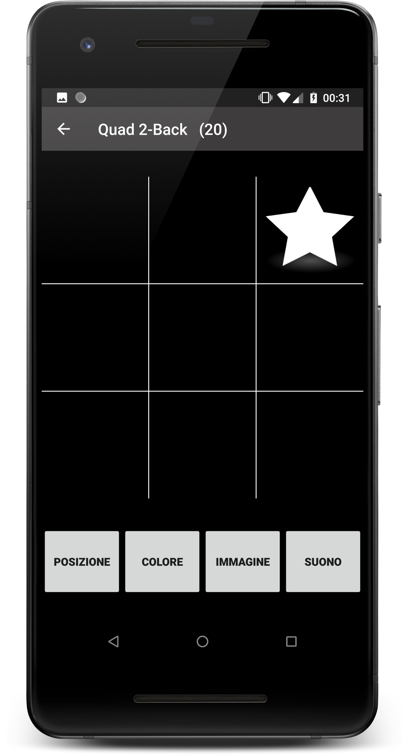 Istruzioni / Informazioni aggiuntive:Lo scopo del gioco è quello di tenere diversi oggetti nella memoria di lavoro e aggiornare attivamente questi elementi man mano che il gioco procede. Ad ogni nuovo tentativo, premi il pulsante di corrispondenza se l'elemento corrente corrisponde all'elemento che si è verificato un determinato numero di prove nel passato. Il termine "n-back" indica semplicemente quante prove (