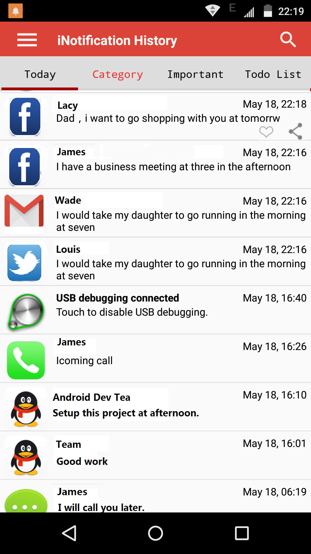 iNotification History records notifications, SMS, incoming call, social media, app installation, This can be used to: