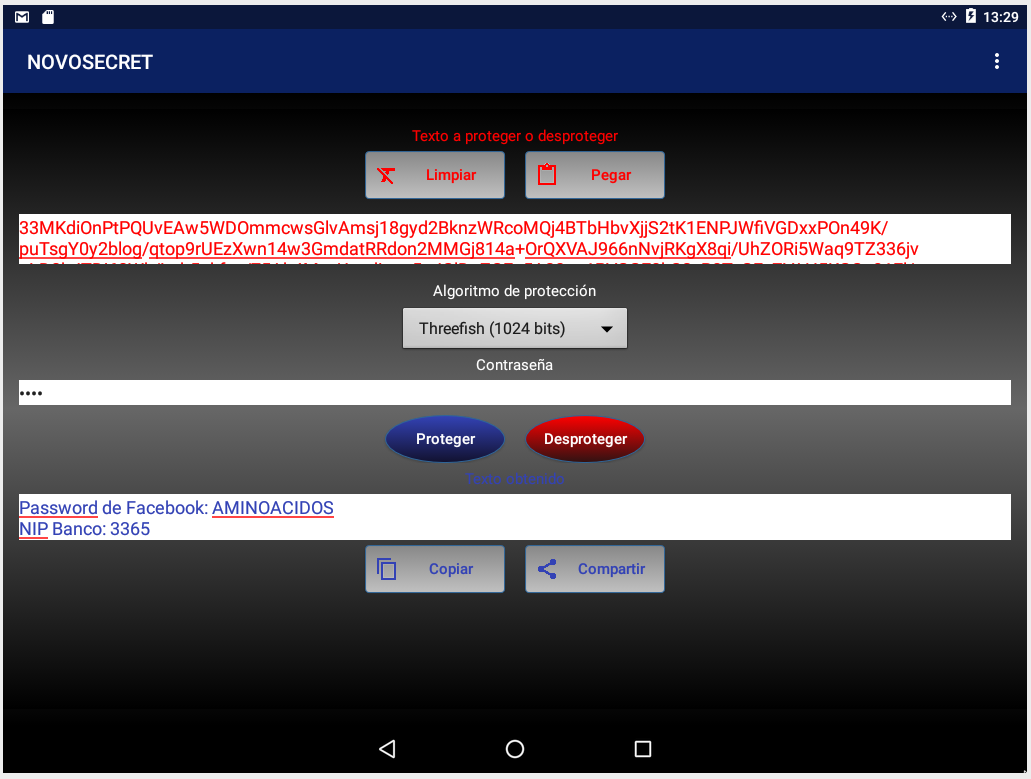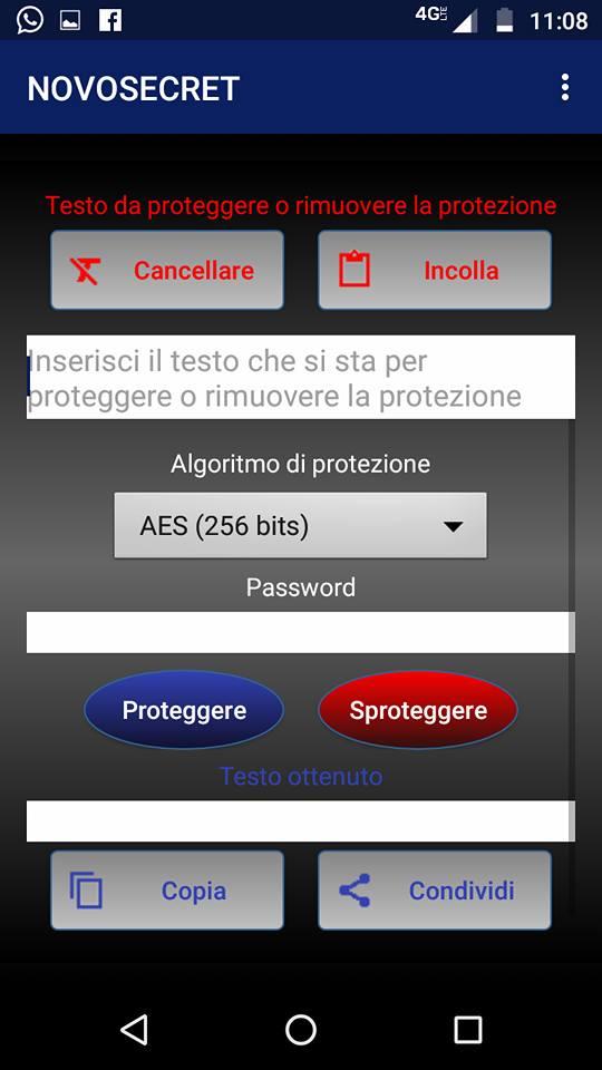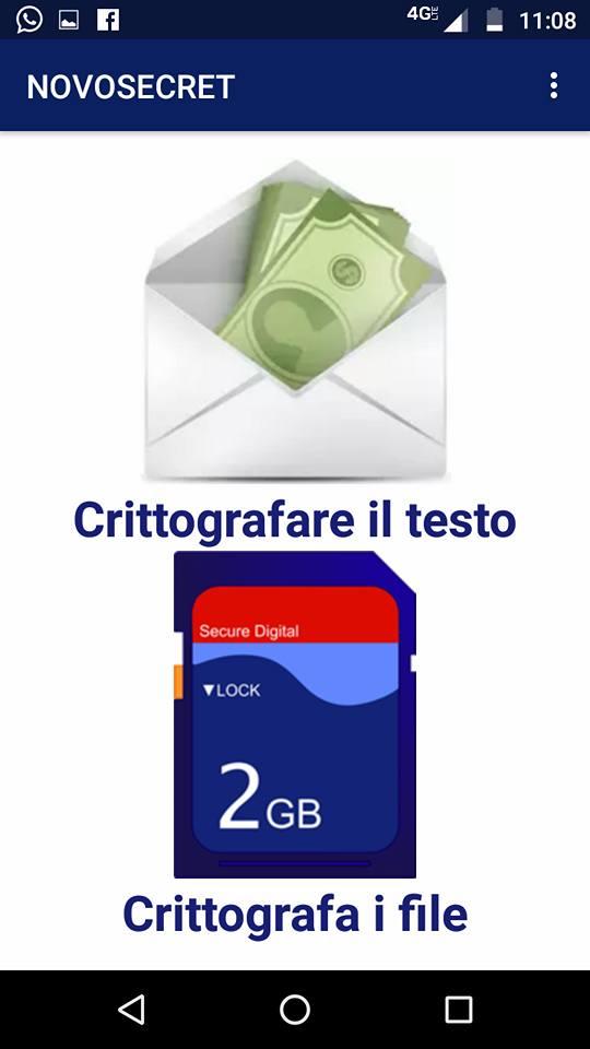 Vantaggi di NOVOSECRET 1.- Privacy assoluta nelle conversazioni: nessuno può leggere i tuoi messaggi protetti da questo sistema, anche se rubano il tuo cellulare. 2.- Protezione dei tuoi file riservati: nessun utente può visualizzare il contenuto delle tue immagini, video, documenti o qualsiasi altro file senza la tua autorizzazione. 3.- Gratuito: non ha costi. 4.- Nessuna pubblicità intrusiva: pop-up o banner pubblicitari non compaiono. 5.- Facile da usare: in pochi minuti puoi imparare come funziona. Importante NOVOSECRET crittograferà i file e le cartelle compatte presenti sulla scheda SD, dopo aver scelto la cartella principale della scheda SD in modalità SAF. In caso di domande su questa situazione, è possibile inserire il collegamento alla fine di questa pagina per richiedere ulteriori informazioni. Inoltre, sebbene la lingua in cui viene visualizzata l'applicazione possa essere modificata tramite il menu, abbiamo aggiunto un rilevatore di lingua per facilitare il processo per gli utenti. Descrizione È un'applicazione che include i seguenti strumenti: 1.- Crittografia testo: consente di proteggere il testo confidenziale da condividere e / o facilmente archiviare da WhatsApp, Facebook, Telegram, Natural Notes, tra molte altre applicazioni Android. 2.- Crittografa file: consente di proteggere i file memorizzati nel dispositivo e di condividerli facilmente con le applicazioni citate nel paragrafo precedente. Supporta i seguenti algoritmi: AES (256 bit), Blowfish (448 bit), GOST28147 (256 bit), RC6 (256 bit), Serpent (256 bit), Twofish (256 bit), Shacal-2 (512 bit) e Threefish (1024 bit). Gli ultimi due non sono inclusi nella crittografia dei file gratuitamente. Funzioni importanti 1.- Applicazione tradotta in tedesco, arabo, cinese tradizionale, spagnolo, francese, inglese, italiano, giapponese, portoghese, russo e svedese. 2.- È possibile ricevere un testo condiviso da un'altra applicazione. 3.- Condividi facilmente testo e file con altre applicazioni. 4.- È utile cancellare e aprire i file dal menu contestuale. Per appare tale menù, si dovrebbe smettere e tenere premuto un file. 5.- Include un manuale di aiuto per ogni strumento. 6.- Consente di inserire una directory specifica in cui si desidera ottenere il permesso di scrivere tramite SAF (Storage Access Framework). 7.- Applicazione leggera. Consuma poca RAM e poco spazio di archiviazione. Eventuali osservazioni per migliorare l'applicazione, è possibile farlo a: http://novoteknia.com/comentariosnovosecret.php Per maggiori informazioni: http://novoteknia.com/novosecretother.html