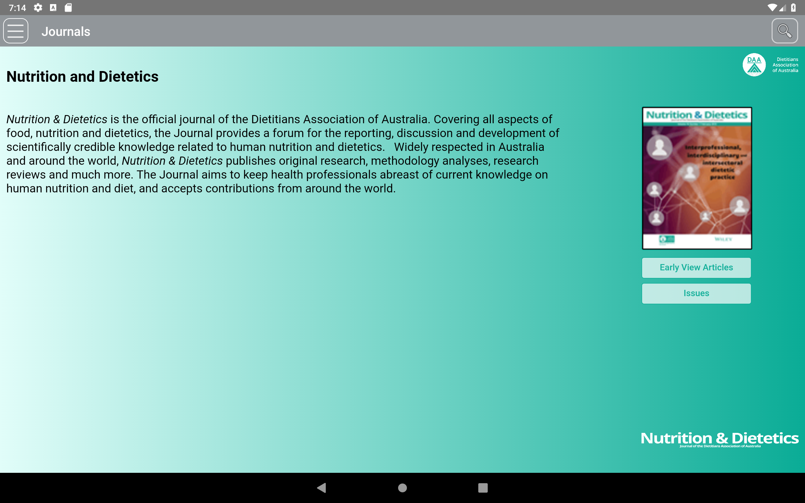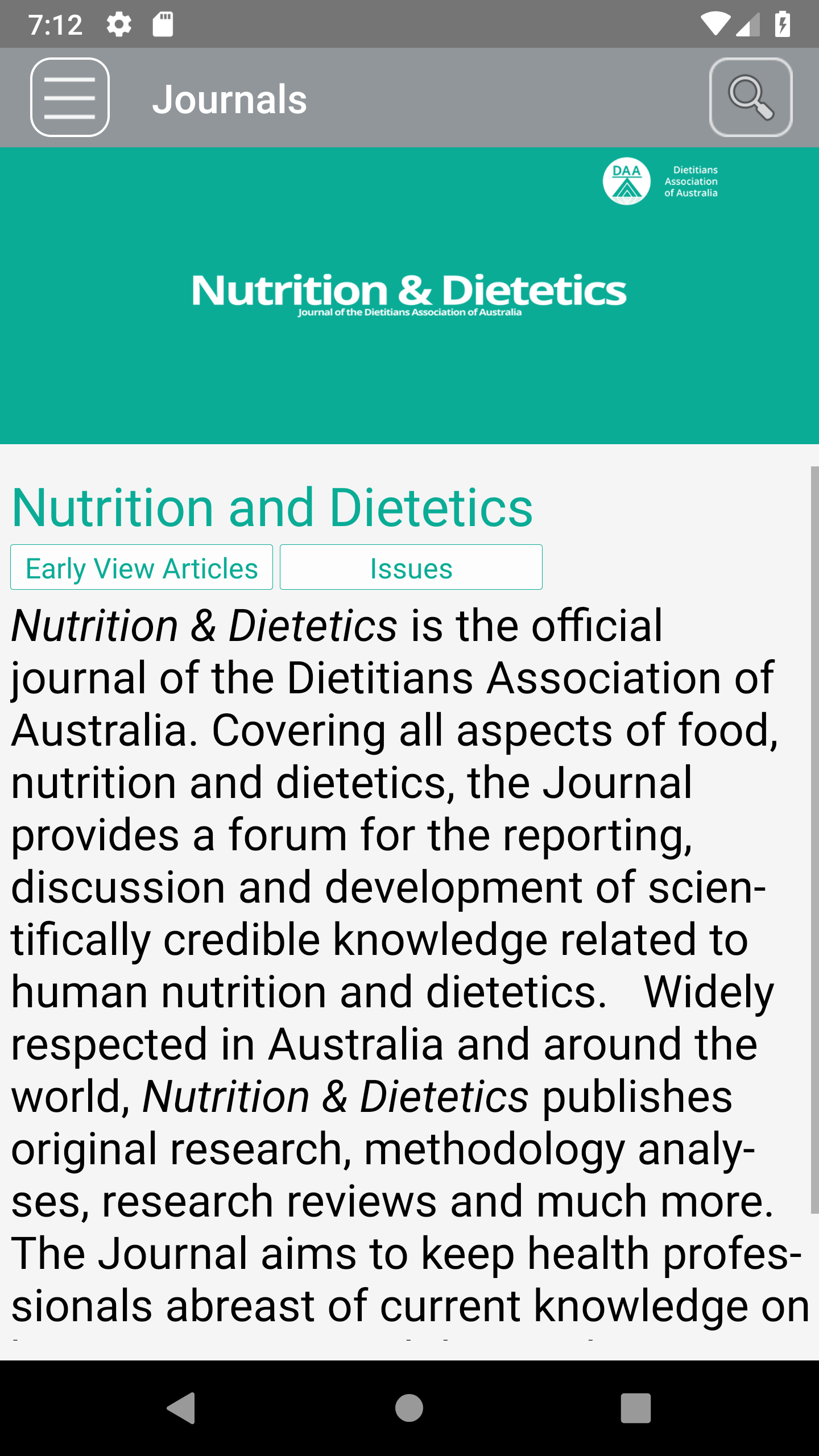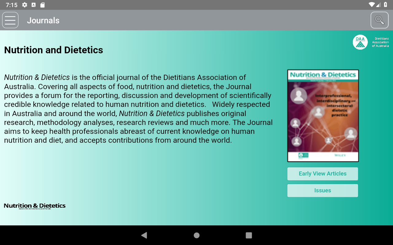 Nutrition & Dietetics is the official journal of the Dietitians Association of Australia. Covering all aspects of food, nutrition and dietetics, the Journal provides a basic forum for the reporting, discussion and development of scientifically credible knowledge related to human nutrition and dietetics. Widely respected in Australia and around the world, Nutrition & Dietetics is Australia's leading peer-reviewed journal in its field. The Journal publishes original research, review papers, insights – short papers on findings from demonstrating practice, letters, book reviews and conference reports.