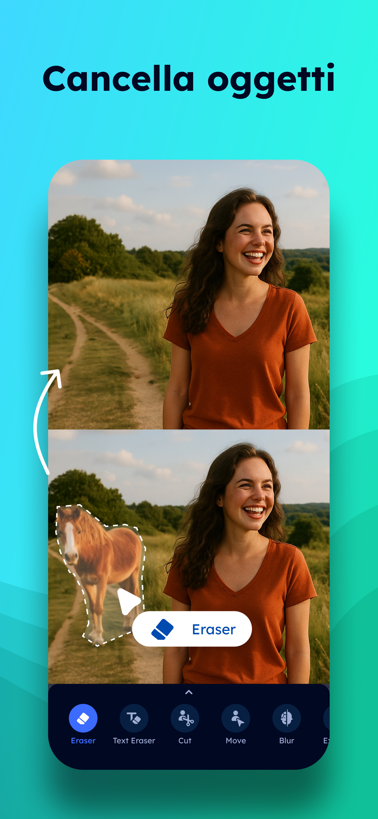 La gomma magica cancella oggetti e elimina persone dalle foto. Cancella foto, togli scritte e rimuovi oggetti. Ogni elemento eliminato scompare con cancellazione intelligente e riempimento automatico. La gomma rimuove tutto: cancellare difetti, cancellato e cancellati. Rimuovi oggetti foto ritocco avanzato, rimuovere oggetti con correzione automatica e pulizia intelligente per eliminare ogetti. App per cancellare oggetti, ritoccare foto e ritocca foto.