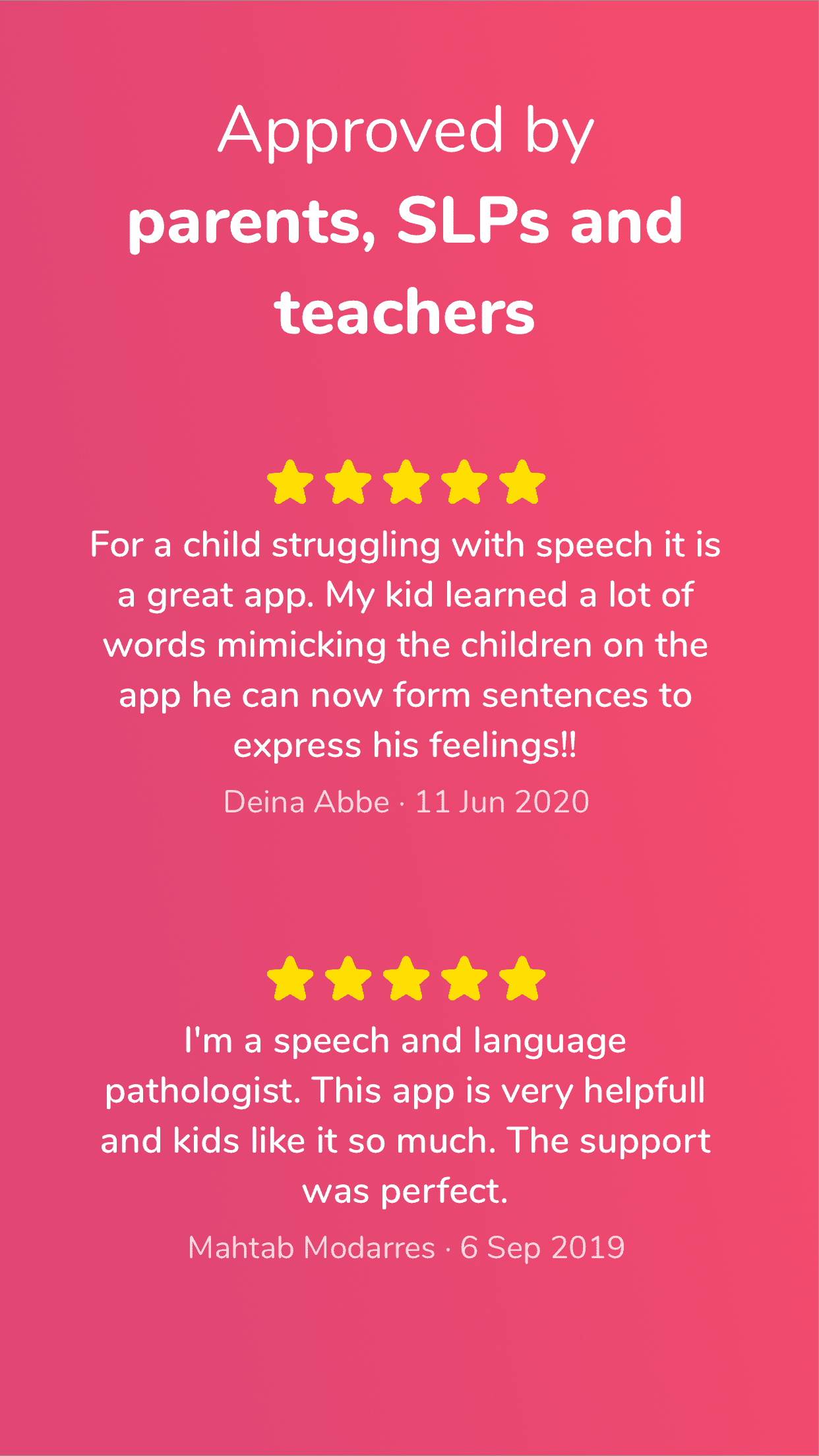 Otsimo | Logopedia Pronuncia Articulation è orgogliosa di essere l'unica app di logopedia che utilizza la tecnologia di riconoscimento vocale e vocale e l'apprendimento automatico; capisce esattamente quello che stai cercando di dire! Per coloro che sperimentano problemi legati al linguaggio come: - Discorso ritardato (chi parla tardi), - Autismo non verbale e sindrome di Down che influenzano la parola, - Difficoltà ad articolarsi ed enunciare, - Aprassia, -Afasia, - Balbuzie - Problemi di articolazione, Può usare Otsimo | Articolazione della pronuncia della logopedia per gli sforzi di pratica del linguaggio e per migliorare il proprio linguaggio. I giochi vocali progettati specificamente per gli individui, sono creati sotto la guida di genitori, patologi del linguaggio del linguaggio (SLP) ed esperti di attività terapeutiche. I giochi assistivi a Otsimo | L'articolazione della pronuncia della logopedia mira a migliorare le capacità di parola e comunicazione. Tutti i motivi per provare Otsimo | Logoterapia: - Usiamo la tecnologia di riconoscimento vocale e vocale per valutare ciò che viene detto per ottenere risultati accurati, migliorando l'esperienza della logopedia. - Con la tecnologia ricettiva e di apprendimento automatico, l'app rileva se l'articolazione e la pronuncia vengono migliorate o meno. - Ogni esercizio vocale è seguito da filtri divertenti, con cappelli e maschere come ricompensa, per rendere l'apprendimento più divertente. - Ogni esercizio di linguaggio ha anche più di 200 adesivi da raccogliere, incoraggiando l'individuo a essere più coinvolto nella logopedia. Gli esercizi prevedono la ripetizione, un metodo popolare di logopedia aba, che aiuta con lo sviluppo della persona con disturbi del linguaggio. Come parte della terapia professionale certificata, utilizziamo la modellazione video che consente di apprendere dai coetanei attraverso la simulazione. Le nostre app vengono aggiornate settimanalmente con contenuti entusiasmanti e attività vocali, così non ti annoierai mai di imparare nuove parole. Ai fini dell'apprendimento e dello sviluppo, Otsimo | L'articolazione della pronuncia della logopedia insegnerà come articolare il suono corretto di vocali e consonanti e altro ancora, in modo che possano imparare a comunicare oralmente in modo migliore. Otsimo | Logopedia Pronuncia Articulation è un SLP tascabile che puoi usare come logopedia a casa. Premiata come la migliore app per attività terapeutiche, mira a ridurre qualsiasi tipo di problema di linguaggio e linguaggio, in modo divertente! L'Otsimo | L'app di logopedia è composta da oltre 15 categorie, tra cui Prime parole, Forme di base, Parti del corpo, Safari Club, Tongue Acrobatics, Rainbow Splash! Ogni categoria è progettata per stimolare la produzione del suono del bambino. Otsimo | Il viaggio di Logopedia SLP inizia con una prova gratuita di 7 giorni o un abbonamento mensile. Offriamo abbonamenti mensili, annuali ea vita. L'abbonamento mensile è $ 6,99 / mese, l'abbonamento annuale è $ 4,49 / mese e a vita è $ 119,99. Gli addebiti effettivi potrebbero essere convertiti nella valuta locale a seconda del Paese di residenza. Alla conferma dell'acquisto, il pagamento verrà addebitato sul tuo account Google Play. Gli abbonamenti si rinnovano automaticamente a meno che il rinnovo automatico non venga disattivato almeno 24 ore prima della fine del periodo di abbonamento corrente. Il nostro account verrà addebitato per il rinnovo entro 24 ore prima della fine del periodo corrente e verrà identificato il costo del rinnovo. Gli abbonamenti possono essere gestiti dall'utente. Il rinnovo automatico può essere disattivato accedendo alle Impostazioni account dell'utente dopo l'acquisto. Qualsiasi porzione inutilizzata di un periodo di prova gratuito, se offerto, verrà annullata quando l'utente acquista un abbonamento a tale pubblicazione. Dichiarazione di non responsabilità: Otsimo | L'articolazione della pronuncia della logopedia è sviluppata in un modo che può essere utilizzato con un tutore. Qualsiasi individuo può beneficiare del servizio senza limiti di età. Per maggiori informazioni: Informativa sulla privacy e termini di utilizzo - https://otsimo.com/legal/privacy-en.html Politica di pagamento: https://otsimo.com/legal/payment.html