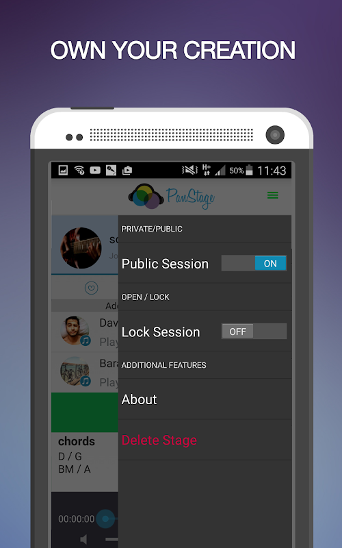 With PanStage you can sing & play your musical instrument and create a multilayer song in a people studio app with Musicians; vocalists & players playing: guitars, bass, sax drums, piano and bow instruments and many more different musical instruments together in your song.