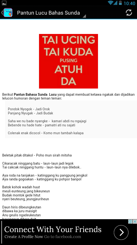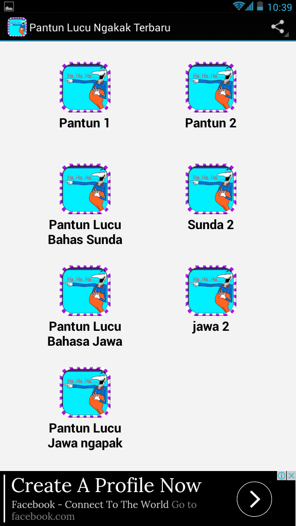 Aplikasi ini Berisi Pantun Lucu banget dan siap siap ngakak bareng bareng. -Pantun Lucu Ngakak Terbaru.Pantun Lucu.berisi pantun: -pantun B.indonesia -Bahasa Sunda -Bahasa Jawa -Bahasa Jawa Ngkak Salam Ngakak.kwkwkwkwkwkw.. Jangan Lupa Kasih Rating Bintang 5 yaaaa..Makasih