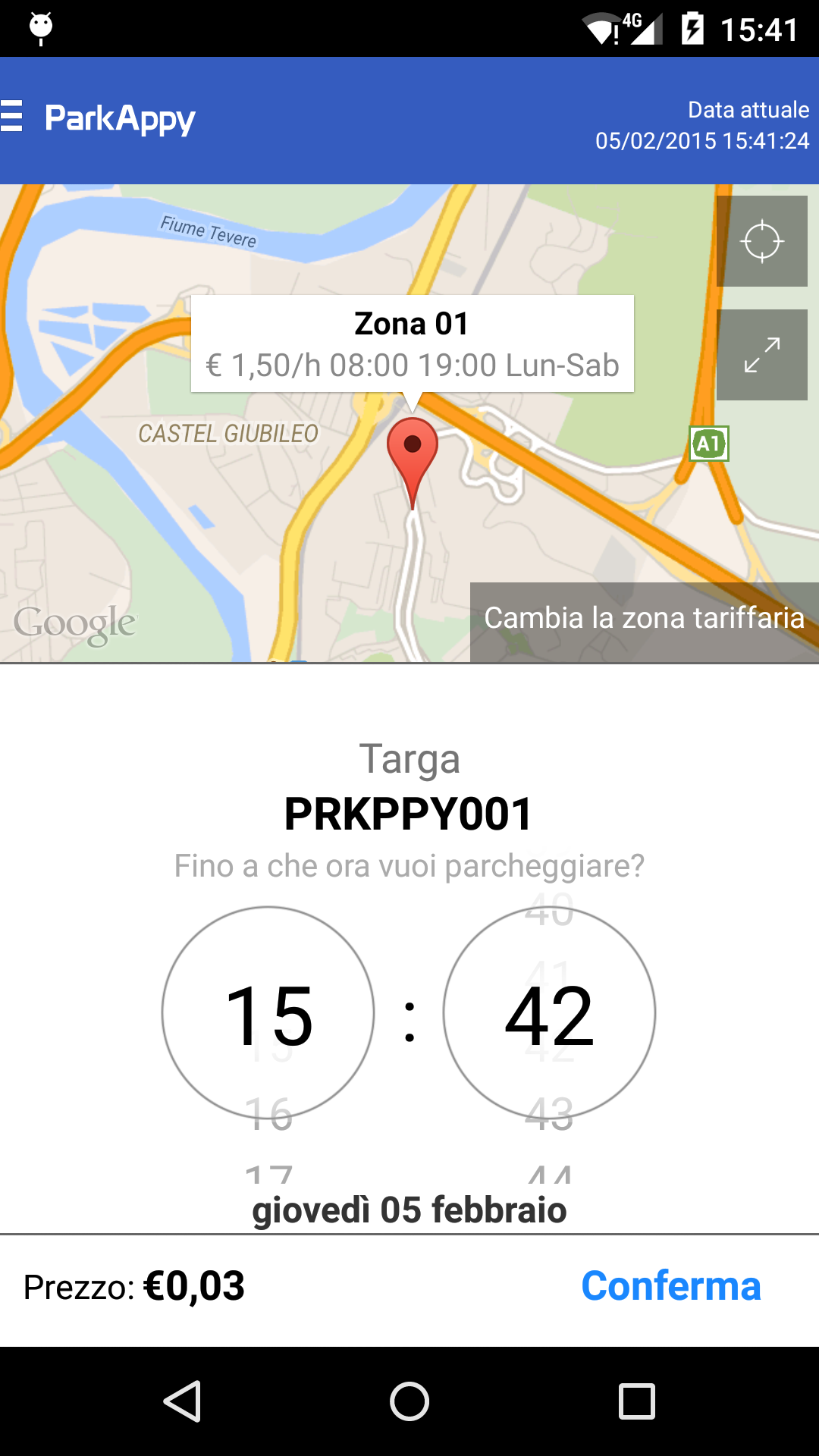 Attendi che l'app ti localizzi, inserisci la tua targa e scegli l'orario di fine sosta. Paga con carta di credito e... vai!