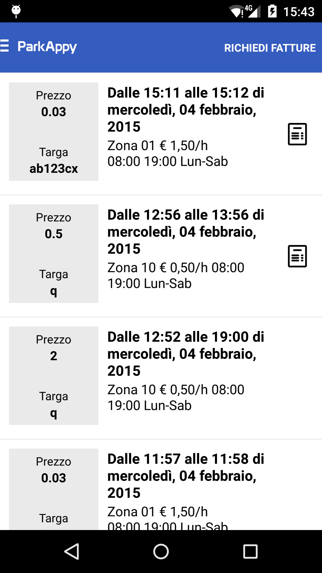 - Possibilità di richiedere le fatture per le soste eseguite