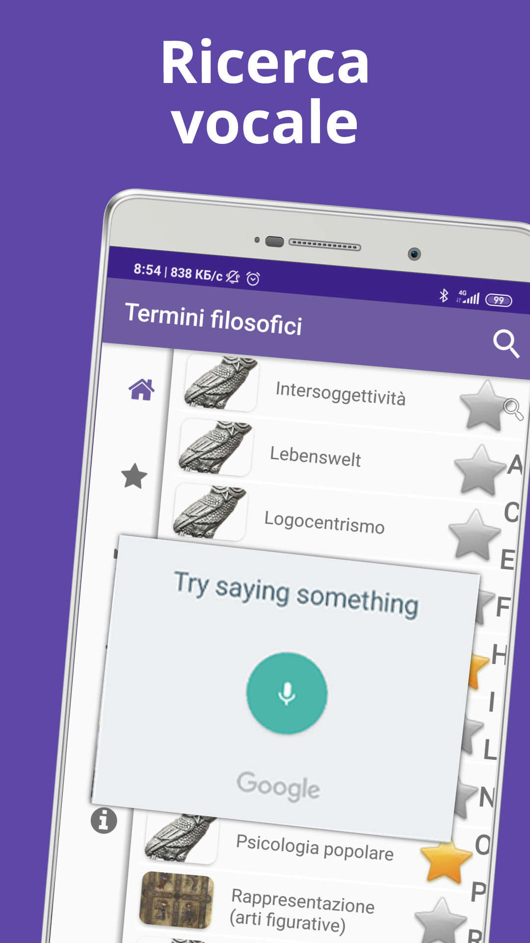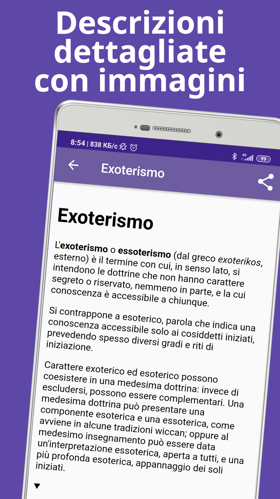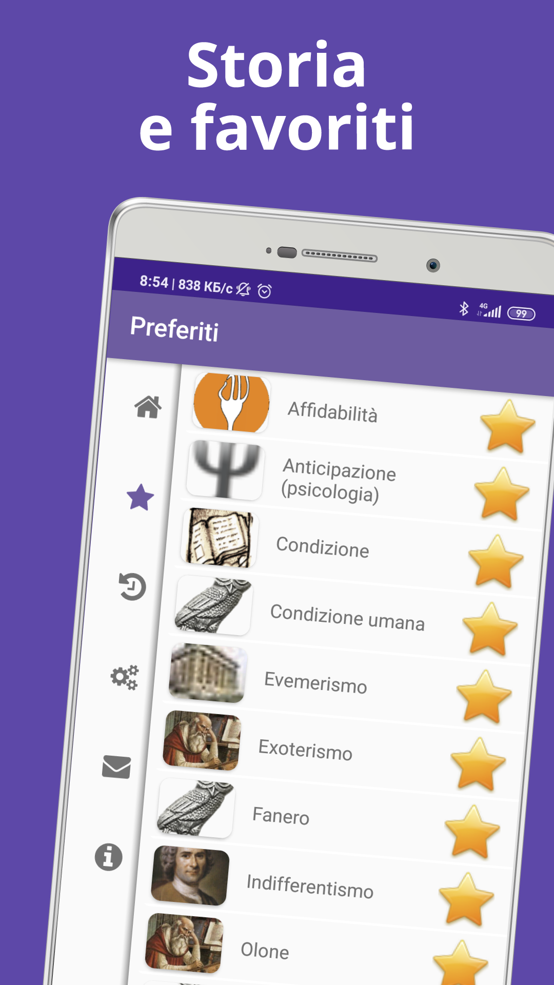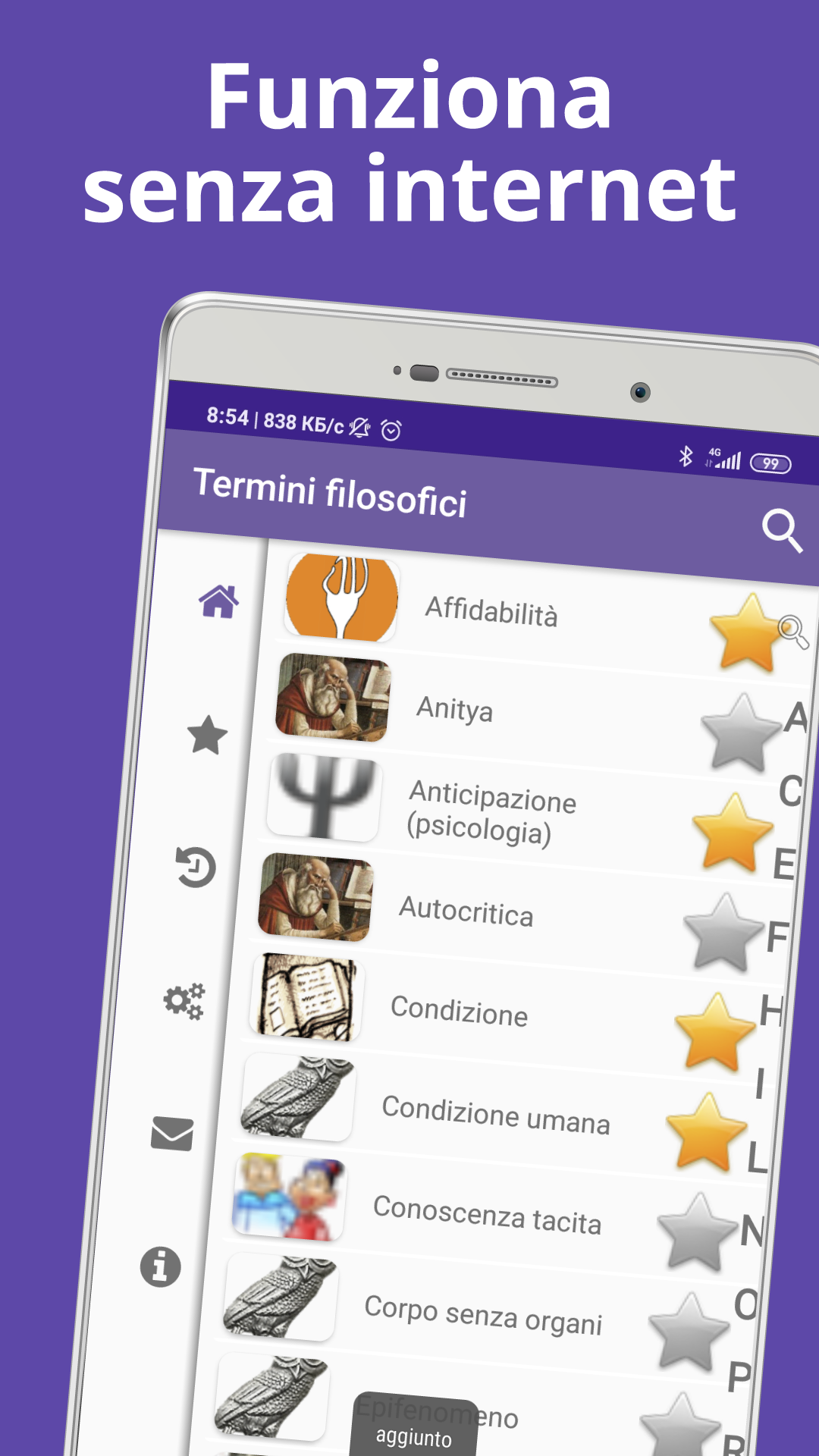 Una grande enciclopedia "Termini filosofici" è un manuale completo e gratuito di terminologia, che copre i termini e i concetti più importanti. Questo è un dizionario molto utile per studenti o professionisti che hanno bisogno di un libro offline per coprire i concetti fondamentali delle discipline filosofiche. Possono usarlo come materiale di riferimento e libro digitale gratuito per la terminologia professionale. Le informazioni dettagliate sono molto utili per legare tutte le aree relative al concetto. La filosofia è lo studio di questioni generali e fondamentali sull'esistenza, la conoscenza, i valori, la ragione, la mente e il linguaggio. Tali domande sono spesso poste come problemi da studiare o risolvere. Il termine fu probabilmente coniato da Pitagora. I metodi filosofici includono domande, discussioni critiche, argomentazioni razionali e presentazioni sistematiche. Le domande classiche includono: è possibile sapere qualcosa e dimostrarlo? Qual è la cosa più reale? Tradizionalmente, il termine "filosofia" riferito a qualsiasi corpo di conoscenza, è strettamente correlato alla religione, alla matematica, alle scienze naturali, all'educazione e alla politica. La tradizionale divisione dell'indagine filosofica stabilita in tre parti: 1) La filosofia naturale ("fisica, cose che hanno a che fare con la natura") era lo studio della costituzione e dei processi di trasformazione nel mondo fisico, si è scissa nelle varie scienze naturali, in particolare astronomia, fisica, chimica, biologia e cosmologia; 2) La filosofia morale ("etica, che ha a che fare con il carattere, l'indole, i modi") era lo studio del bene, del giusto e dell'ingiusto, del bene e del male, della virtù e del vizio, della giustizia e del crimine. Ha dato vita alle scienze sociali, ma include ancora la teoria del valore (compresa l'estetica, l'etica, ecc.); 3) La filosofia metafisica ("logica") era lo studio dell'esistenza, della causalità, di Dio, della logica, della teologia e di altri oggetti astratti. Ha dato vita a scienze formali come la logica, la matematica, ma include ancora l'epistemologia, la cosmologia e altre. Il dizionario contiene migliaia dei significati, espressioni e frasi idiomatiche più utili ma comunque più difficili da trovare usati dai filosofi con definizioni cristalline, facile accesso offline, senza Wi-Fi o connessioni. Questo glossario di tminologia è molto intuitivo, in quanto offre una funzione di ricerca semplice, un'opzione di salvataggio dei segnalibri, un elenco di tutta la terminologia nella funzione dalla A alla Z in modo da poter fare clic su qualsiasi alfabeto e ottenere un significato immediato. Questo dizionario offline gratuito: • contiene oltre 4000 definizioni di termini professionali; • ideale per professionisti e studenti; • funzione di ricerca avanzata con completamento automatico: la ricerca inizierà e prevederà la parola durante la digitazione; • ricerca vocale; • lavorare offline - database confezionato con l'app, nessun costo per i dati sostenuto durante la ricerca; • include centinaia di esempi per illustrare le definizioni; • è un'applicazione ideale per una rapida consultazione o per saperne di più sulla filosofia. Il glossario è molto dettagliato e di facile comprensione. È il modo migliore per non dimenticare nulla. Può essere utilizzato come introduzione alle discipline filosofiche.