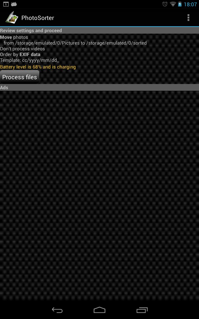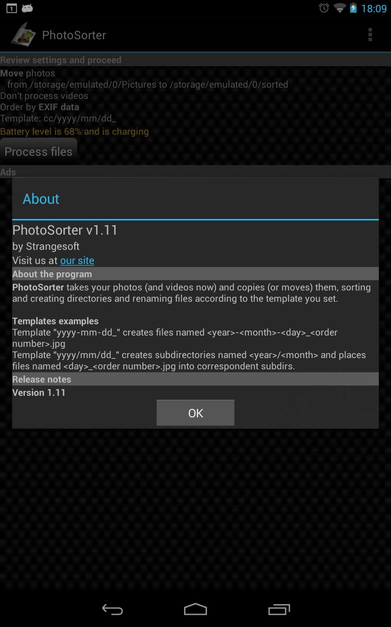 If you stuck with the problem, that the program is not running on you device, then PLEASE don't rate it 1star with comment "It doesn't work on my ...." or at least state your problem more precisely (it crashes, it doesn't sort, it hangs or else). I am physically unable to test the program on each and every device in the world, so please, be more specific. Or it would be even better, if you'll leave such comments on my site (http://strangesoft.weebly.com/photosorter.html), using the feedback form.