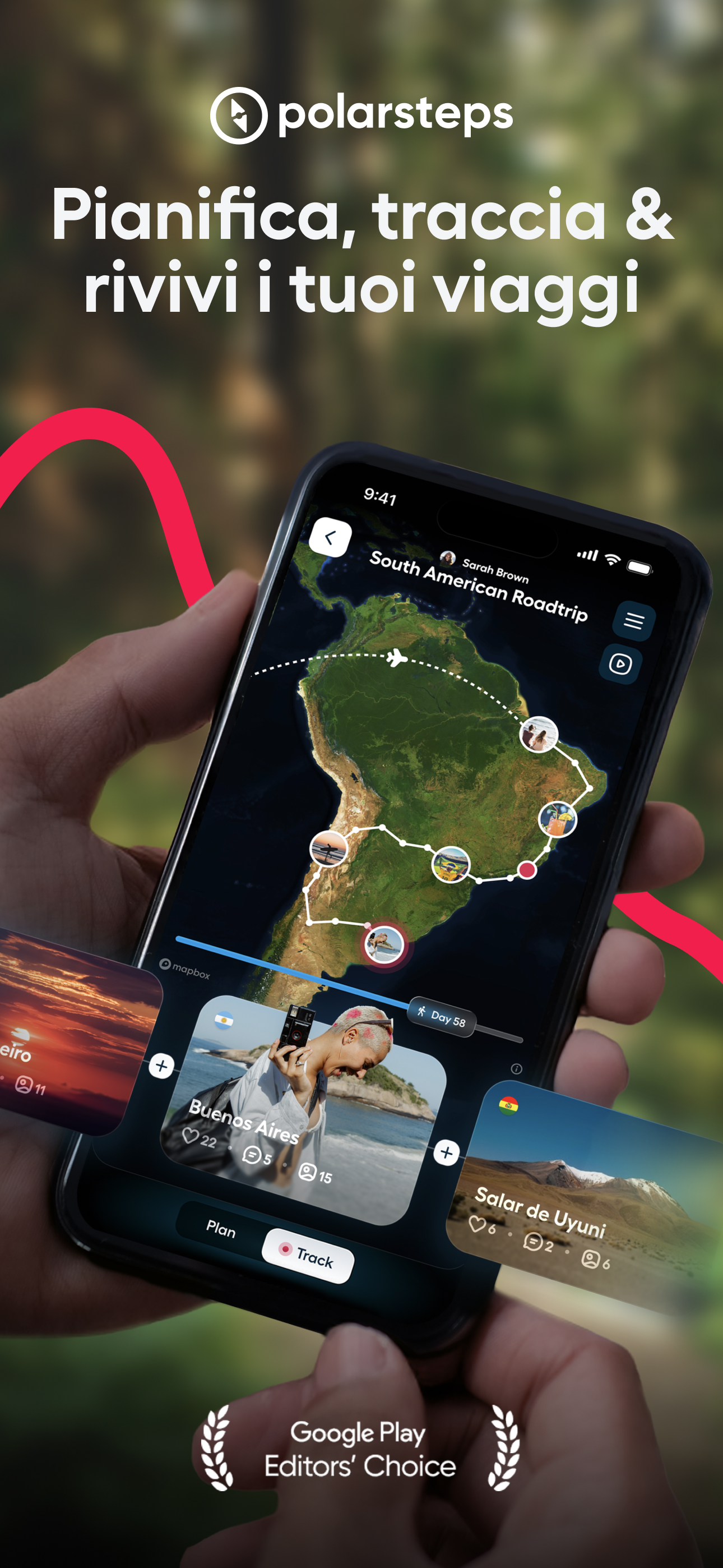 Oltre 18 milioni di esploratori hanno scelto Polarsteps per creare e immortalare le loro avventure. Quest'app di viaggio all-in-one ti mostra le mete più incantevoli, ti dà consigli preziosi e traccia il tuo percorso, le località e le foto mentre sei in viaggio. Il risultato? Una bellissima mappa digitale del mondo tutta tua! E, quando termina il viaggio, puoi anche trasformare il tutto in un libro con copertina rigida. E non è finita qui... Registra automaticamente il tuo percorso tenendo il telefono in tasca e gli occhi sul mondo. Non consuma la batteria, funziona offline e hai il pieno controllo della privacy. PIANIFICA ■ Guide Polarsteps, create dai nostri editor appassionati viaggiatori e altri esploratori come te, ti mostrano il meglio del mondo (oltre a darti consigli per quando arrivi lì). ■ Planner dell'itinerario per costruire il percorso dei tuoi sogni (editabile). ■ Planner per spostamenti ti aiuta ad andare da A a B con chiare opzioni di trasporto tra le destinazioni. TIENI TRACCIA ■ Tieni traccia automaticamente e disegna il tuo percorso su una mappa digitale del mondo (che cresce insieme al tuo passaporto). ■ Aggiungi foto, video e pensieri al tuo viaggio, per rendere i ricordi ancora più vividi. ■ Salva i luoghi che ami per ritrovarli anche in futuro. CONDIVIDI ■ Lascia consigli per la community su dove andare e cosa vedere. ■ Condividi il tuo viaggio con amici e parenti, se ti va. Oppure tienili per te. Hai il totale controllo della privacy. ■ Segui altre persone e le loro avventure. RIVIVI ■ Rintraccia i tuoi passi scorrendo luoghi, foto e stati di viaggio. ■ Crea un libro di viaggio unico con tutte le tue foto e storie premendo un solo pulsante. CHE COSA DICE LA STAMPA DI POLARSTEPS "L'app Polarsteps sostituisce il diario di viaggio, rendendolo più bello e semplice." - National Geographic "Polarsteps ti aiuta a tenere traccia e a condividere i tuoi viaggi in modo semplice e accattivante a livello visivo." - The Next Web "Il log di viaggio di Polarsteps è impressionante, e scatena un grave caso di 'prurito ai piedi' in chi lo guarda" - TechCrunch FEEDBACK Domande, pensieri o feedback? Ci piacerebbe conoscere la tua opinione su Polarsteps. Contattaci scrivendo a support.polarsteps.com/contact