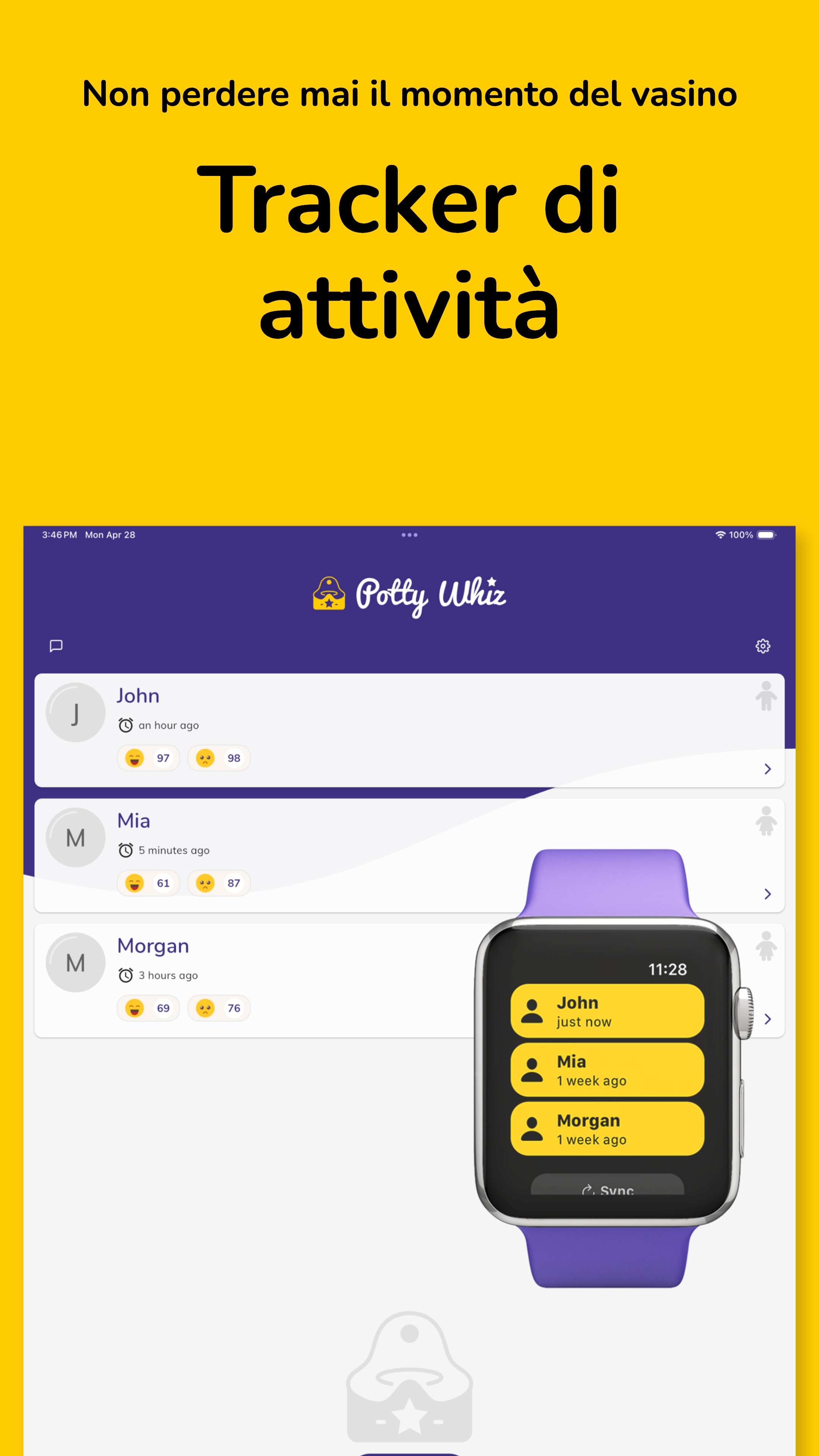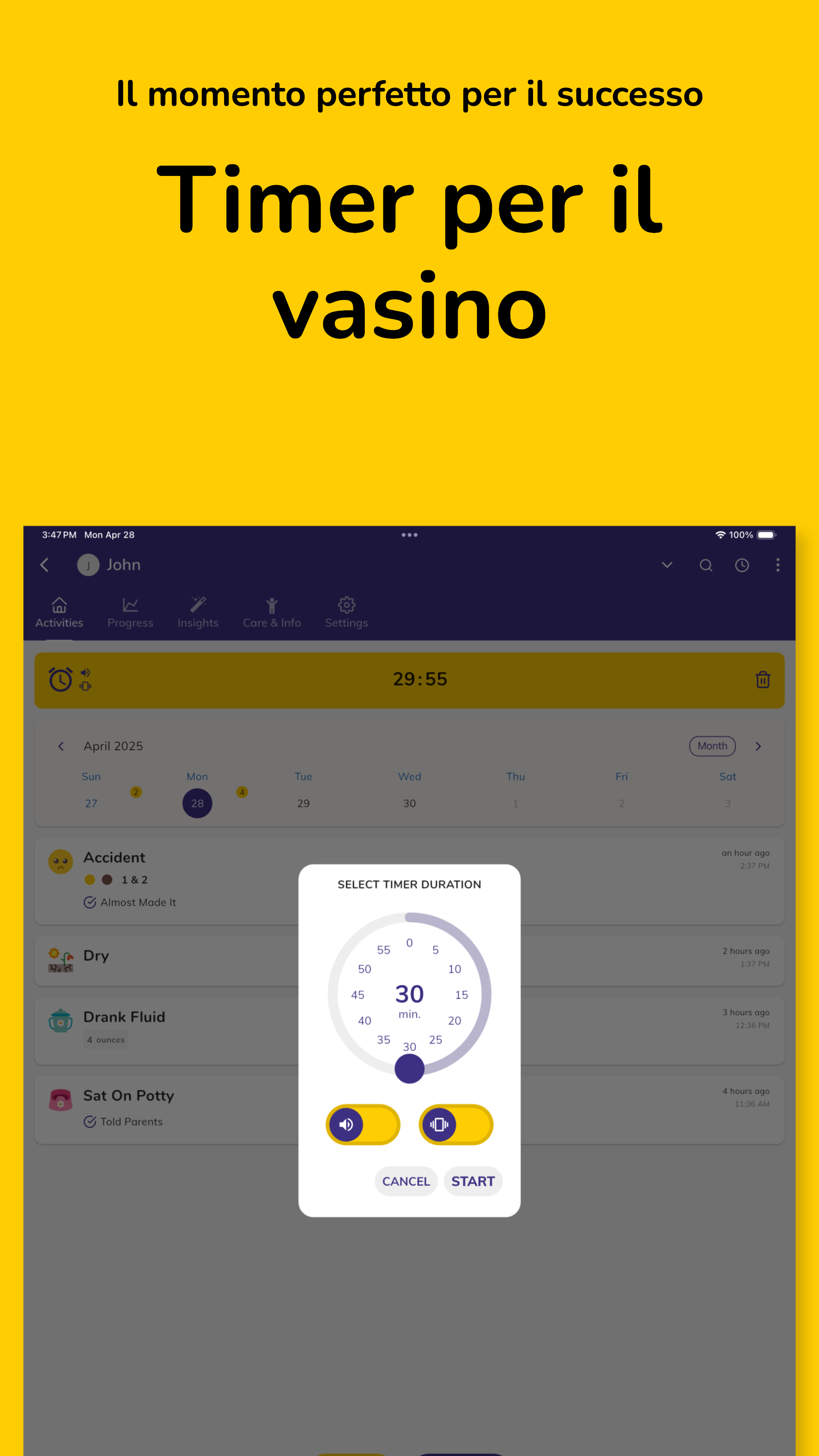 ● Registro Attività: Tieni traccia dei progressi del tuo bambino registrando attività importanti, come sedersi sul vasino, usare il vasino, incidenti e assunzione di liquidi.