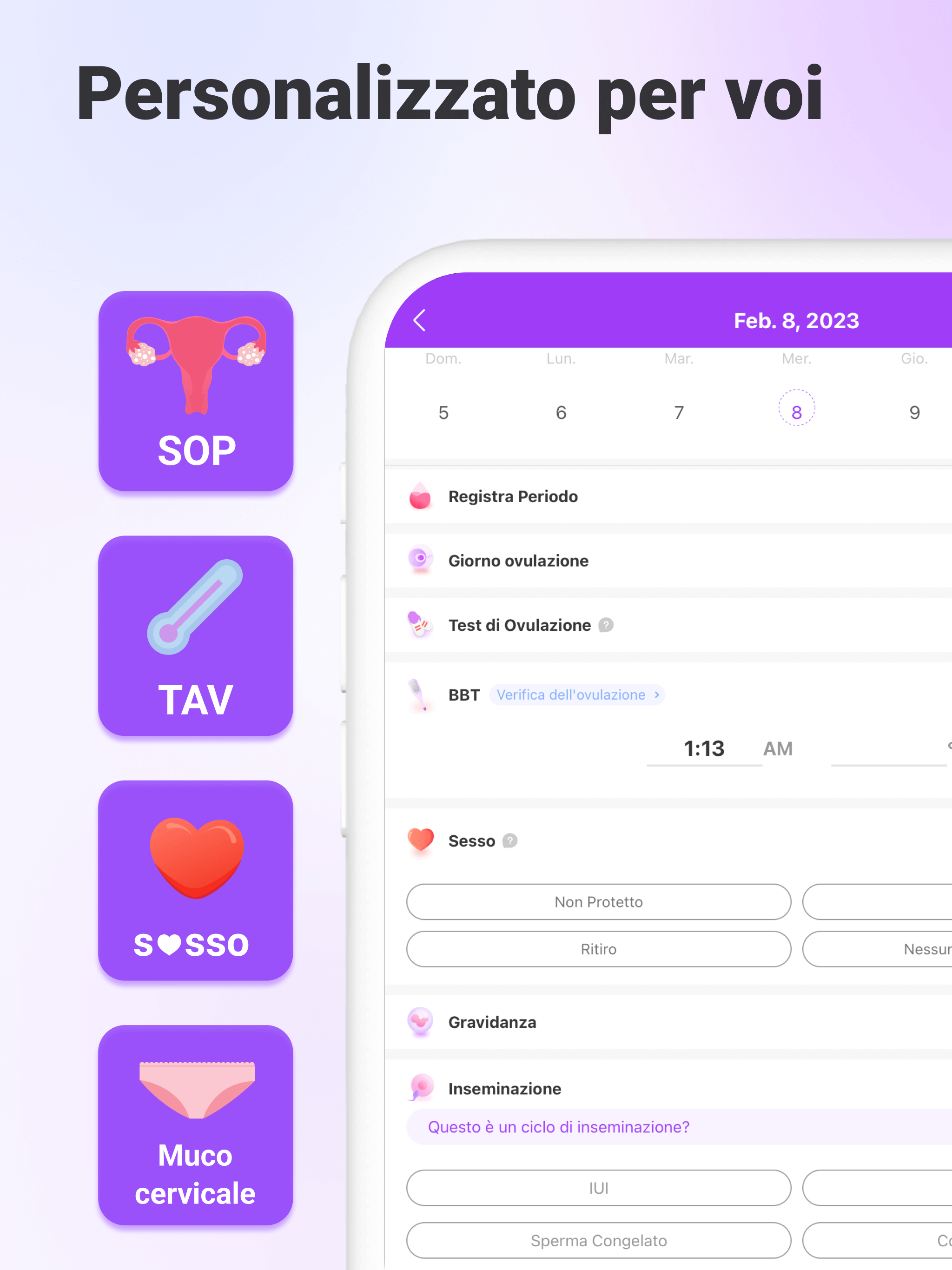 + Imposta dei pro memoria per tracciare ovulazione, attività sessuale, BBT e farmaci