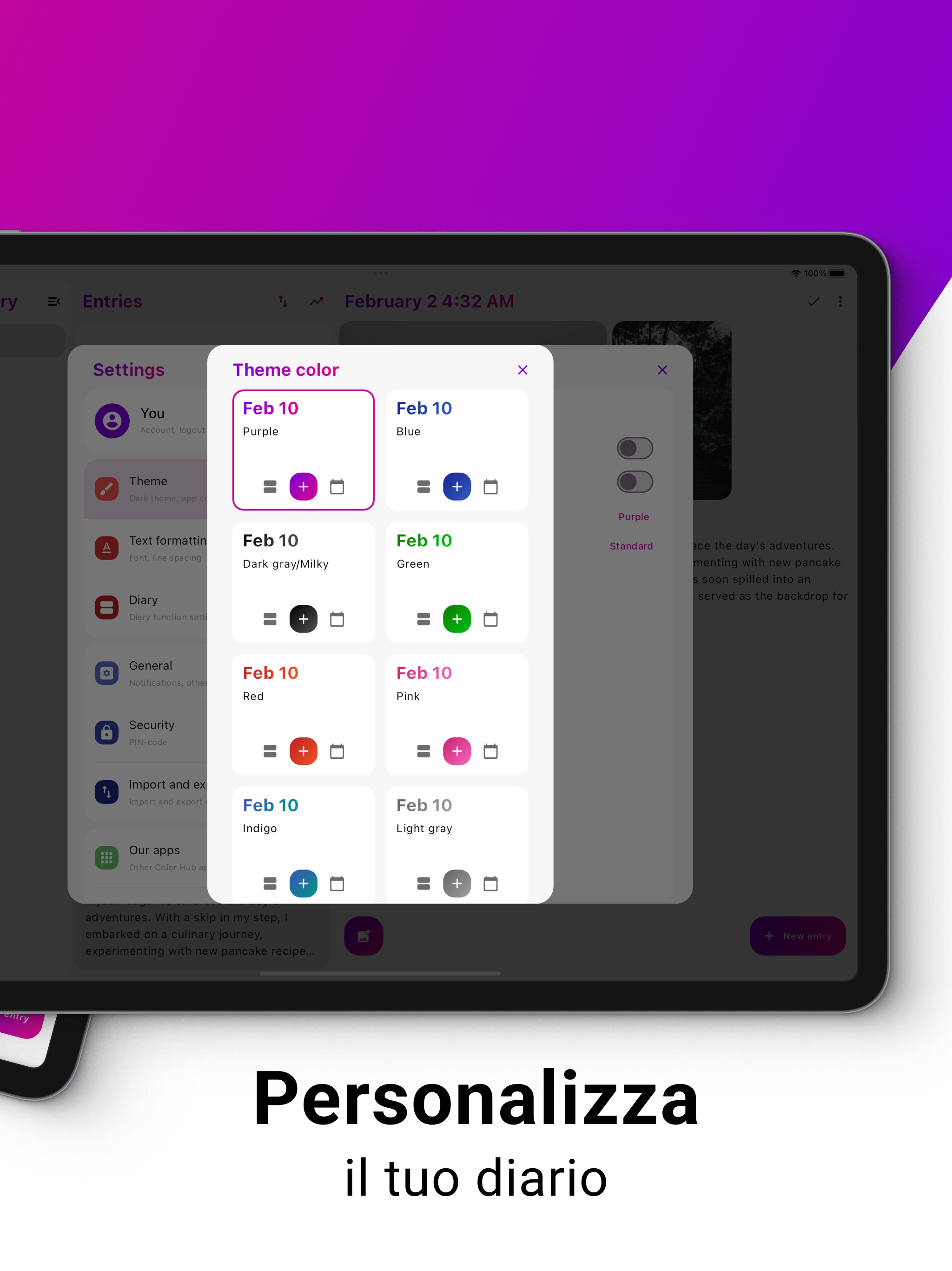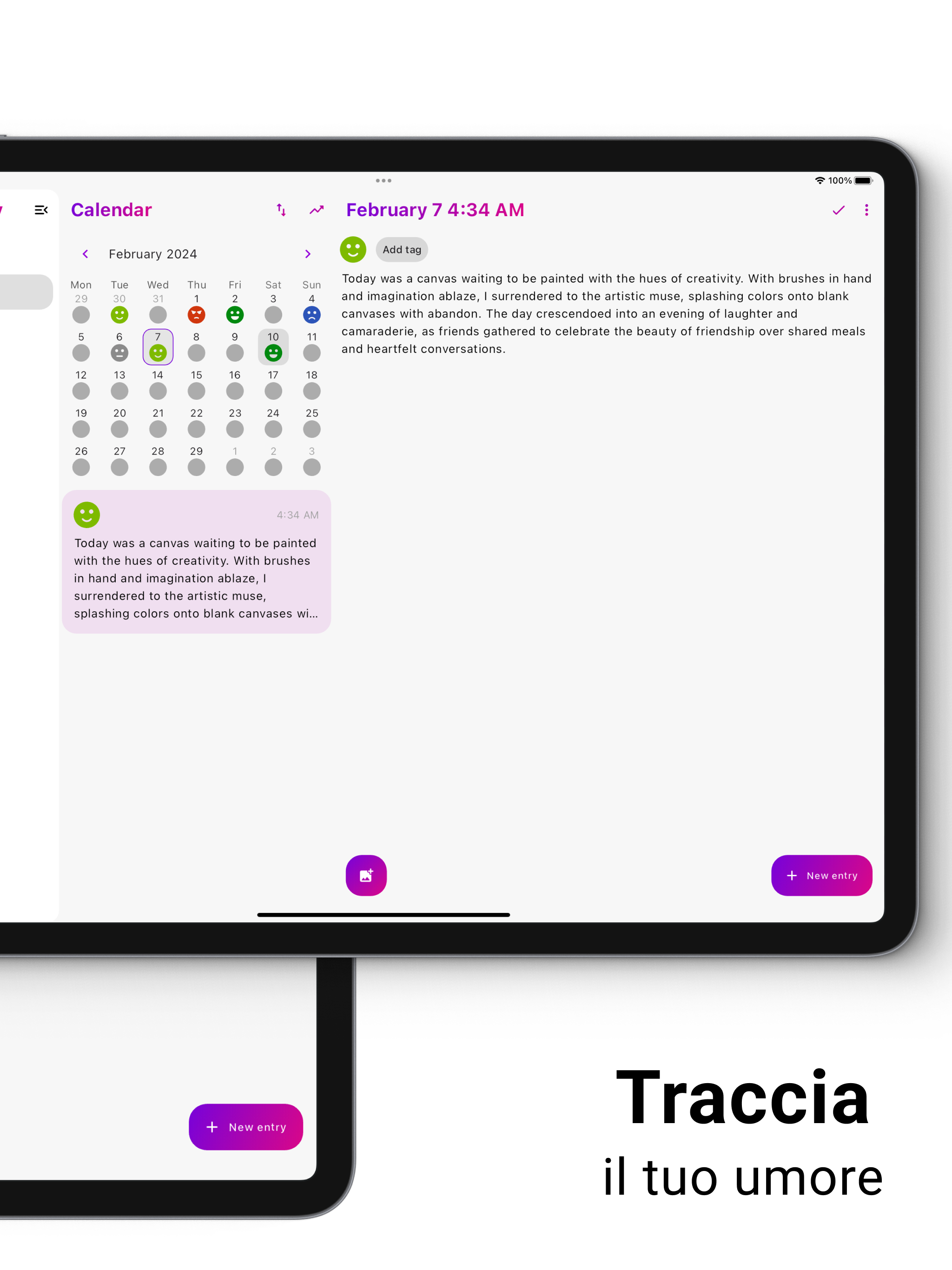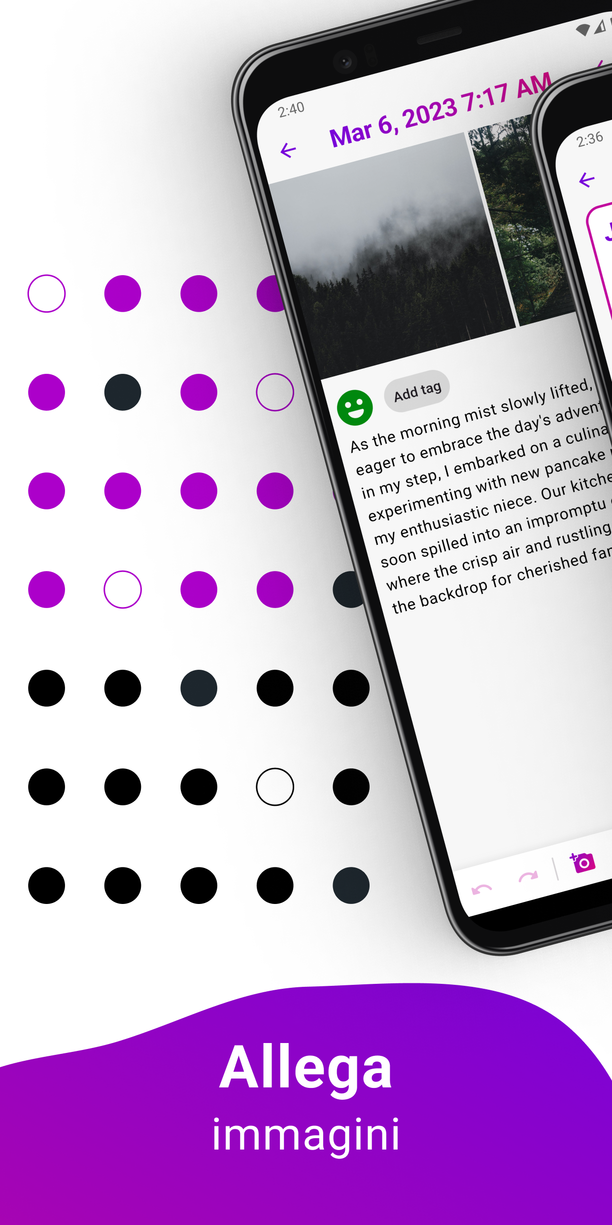 Purple Diary: Il Tuo Compagno di Diario Personale Benvenuto a Purple Diary, l'app definitiva per il diario progettata per migliorare la tua esperienza di scrittura e trasformare il modo in cui documenti la tua vita. Libera la tua creatività, esprimi i tuoi pensieri e cattura momenti preziosi con la nostra piattaforma di diario intuitiva e ricca di funzionalità. Caratteristiche Principali: Scrittura del Diario Semplice 📝 Immergiti in un'interfaccia fluida e facile da usare che rende scrivere nel diario un gioco da ragazzi. Registrare i tuoi pensieri e riflessioni quotidiane non è mai stato così intuitivo. Sicuro e Privato 🔒 I tuoi pensieri sono personali e comprendiamo l'importanza della privacy. Purple Diary garantisce la massima sicurezza con protezione tramite password e autenticazione biometrica, mantenendo le tue voci di diario al sicuro da occhi indiscreti. Opzioni di Personalizzazione 🎨 Personalizza il tuo diario per riflettere il tuo stile unico. Scegli tra una varietà di temi, caratteri e colori per creare uno spazio di scrittura personalizzato che risuoni con te. Integrazione Multimediale 📷 Vai oltre le parole aggiungendo immagini alle tue voci di diario. Cattura l'intero spettro delle tue esperienze con il supporto multimediale di Purple Diary. Tracciamento dell'Umore 😊 Ottieni informazioni sul tuo benessere emotivo con la nostra funzione di tracciamento dell'umore. Sincronizzazione e Backup Cloud ☁️ Il tuo diario è prezioso e ci assicuriamo che non venga mai perso. Purple Diary sincronizza le tue voci senza problemi tra dispositivi diversi e i backup automatici garantiscono che i tuoi ricordi siano sempre al sicuro. Ricerca e Organizzazione 🔍 Trova facilmente le voci passate con una potente funzione di ricerca. Organizza il tuo diario con tag per rivisitare e riflettere sul tuo viaggio in qualsiasi momento. Perché Purple Diary? - 🌟 Purple Diary non è solo un'app per il diario; è un compagno nel tuo viaggio di scoperta personale. - 🖋️ Che tu sia uno scrittore di diario esperto o che tu stia iniziando, la nostra app ti dà il potere di documentare, riflettere e crescere. - 🔒 Massima sicurezza e privacy. - 🎨 Ampie opzioni di personalizzazione. Scarica Purple Diary oggi e inizia a catturare l'essenza della tua vita un'entrata alla volta. Scrivere nel diario non è mai stato così personale, sicuro e bello. Disponibile anche su Wear OS.