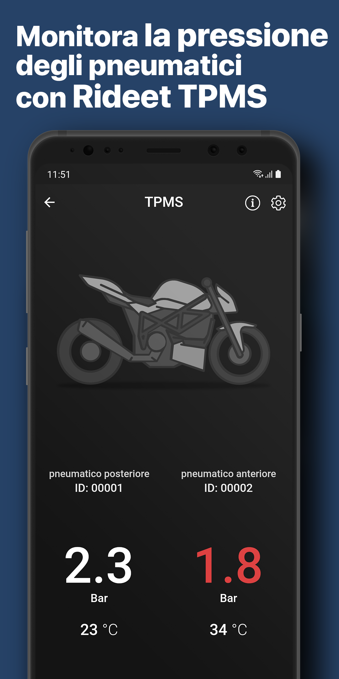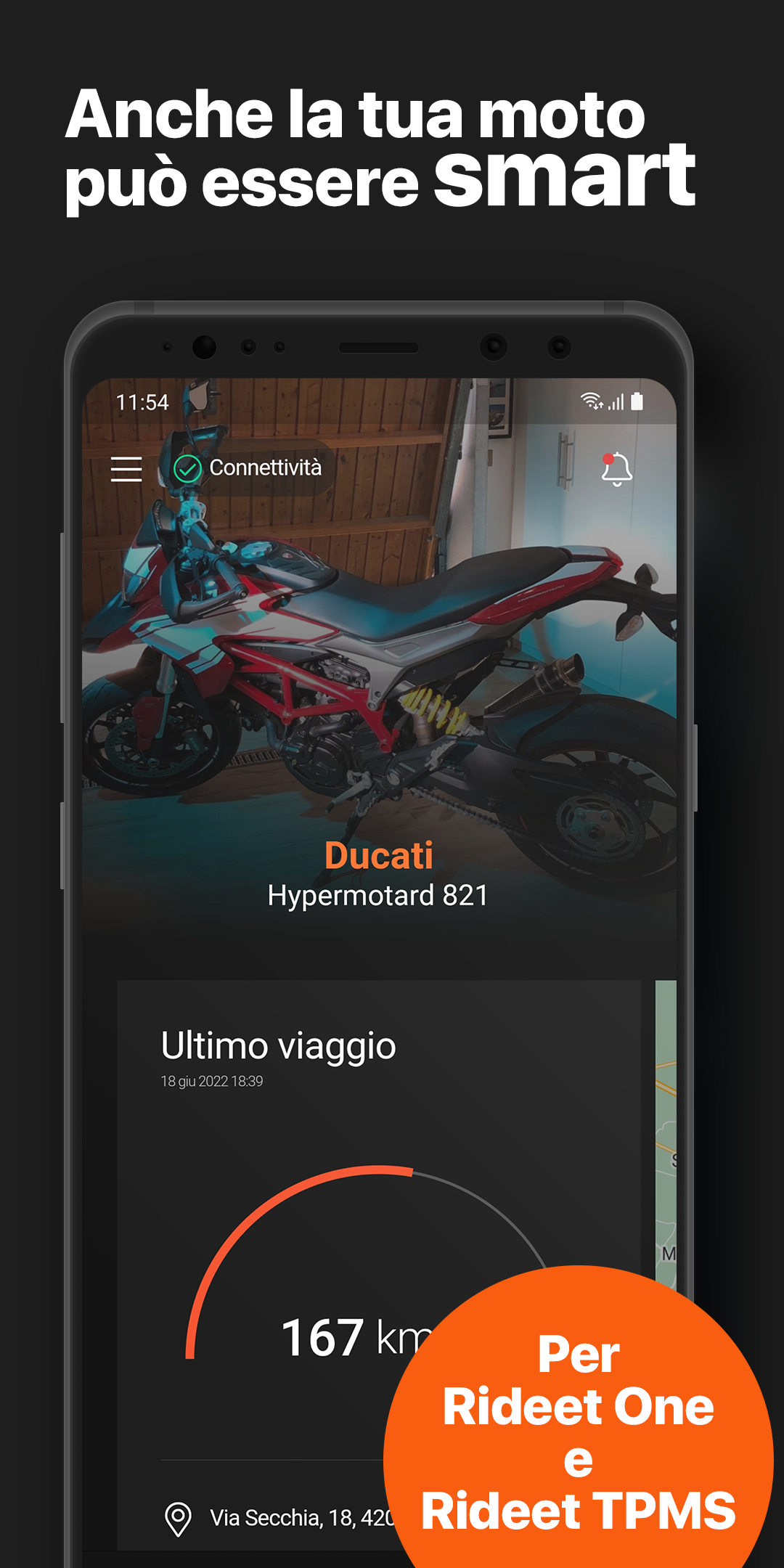 Entra nel mondo Rideet e trasforma la tua moto in un veicolo smart! L'app Rideet è stata ridisegnata da zero, con una nuova incredibile interfaccia e tanti aggiornamenti per rendere sempre più piacevole l'esperienza del mondo Rideet. Rideet è l'app ufficiale per gestire Rideet One e Rideet TPMS, l'assistente intelligente per tutte le moto e i nuovi sensori di pressione smart per gli pneumatici. Rideet One è il primo dispositivo al mondo, interamente Made in Italy, in grado di trasformare ogni moto in un veicolo intelligente. Dovrai solo collegare Rideet One all'alimentazione, senza toccare la centralina della tua moto. Installa Rideet One sulla tua moto e avrai accesso a: - Analisi delle prestazioni con telemetria ad alta precisione (angolo di piega, velocità, accelerazione, 0-100, etc.) - Sicurezza della moto (antifurto satellitare, streaming della posizione, geofencing, etc.) - Assistenza al pilota (rilevamento incidenti, contatti di emergenza, condivisione info mediche, etc.) - Assistenza per la manutenzione (monitor della batteria, avvisi di manutenzione specifici per il tuo modello di moto, scadenze burocratiche, etc.) - Gestione viaggi (riconoscimento automatico viaggi, gestione automatizzata, etc.) e molto altro! Rideet One viene costantemente aggiornato con nuove funzionalità esclusive. Installa sulla tua moto anche i Rideet TPMS, il nuovo sistema smart di monitoraggio della pressione degli pneumatici! Li monti in pochi secondi al posto dei coprivalvola e ricevi sull'app le misure di pressione e temperatura. Ti avvisa in caso di perdita improvvisa, sia a moto ferma che in movimento. E se hai anche Rideet One non serve il telefono: hai tutto in automatico anche sul cloud! Il funzionamento di questa applicazione richiede la presenza di un Rideet One o di Rideet TPMS installato sulla tua moto. Rideet One e Rideet TPMS sono acquistabili direttamente dall'app e sul sito www.rideet.com. (Rideet One è sempre connesso alla rete e richiede un abbonamento attivo. Sono inclusi 12 mesi gratuiti dal momento dell'attivazione del Rideet One. Rideet TPMS funziona senza connettività remota e non richiede abbonamenti.)