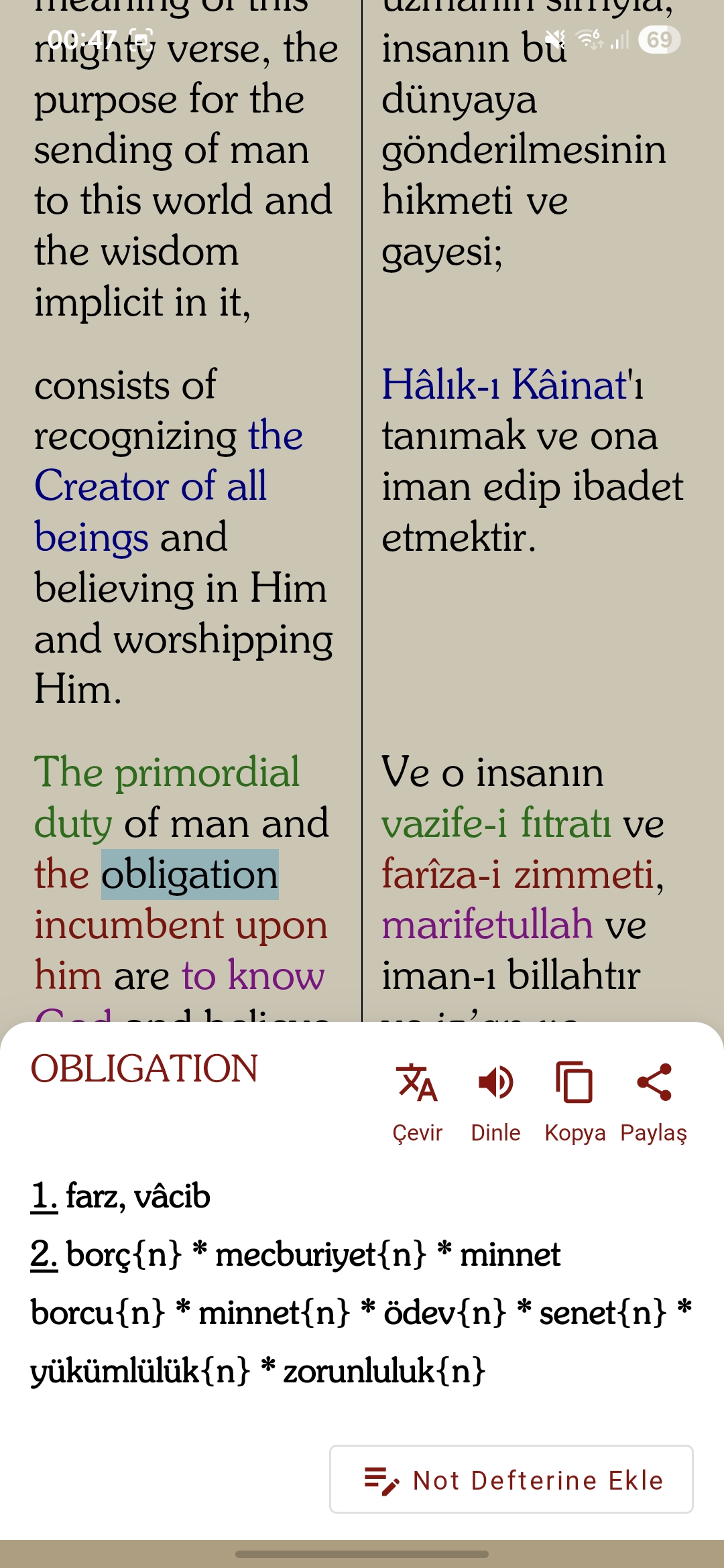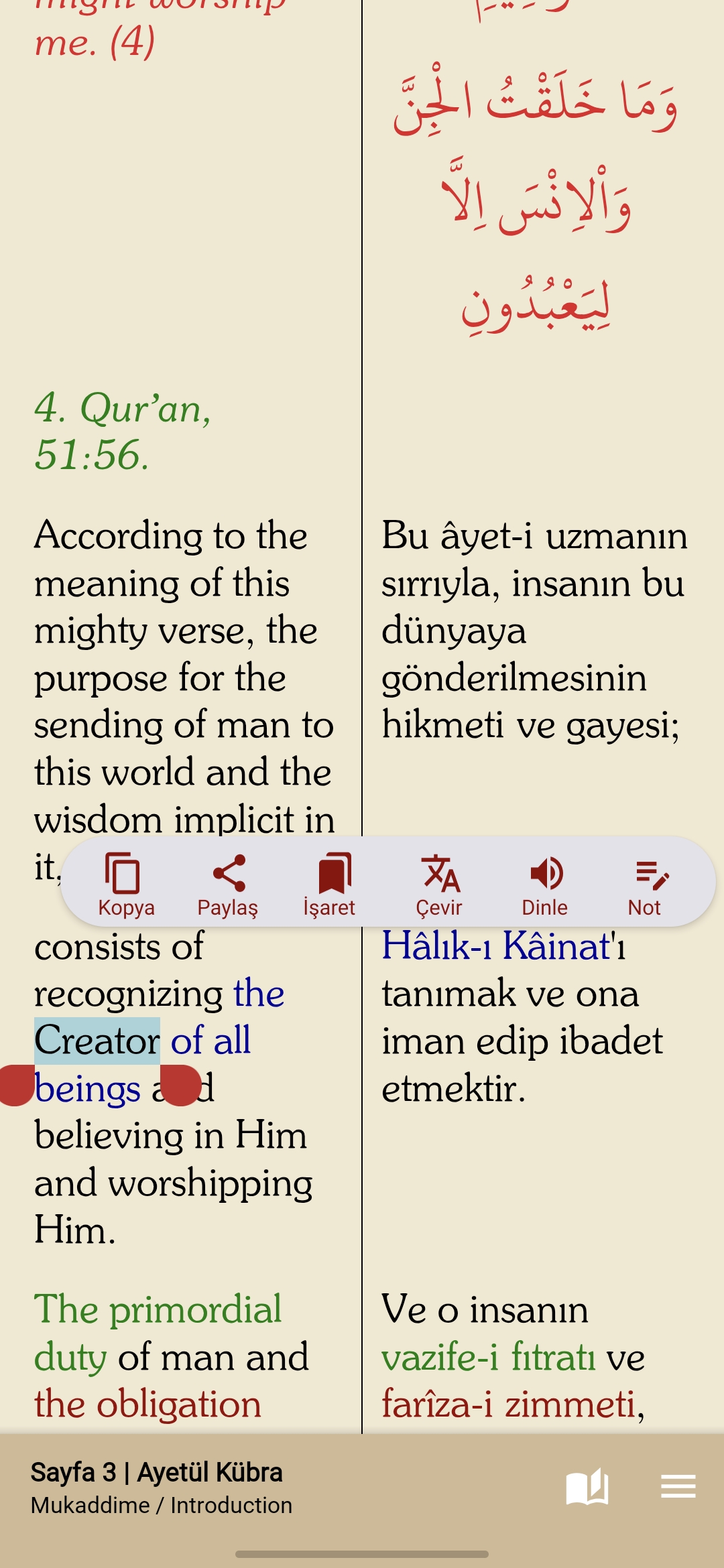 Puoi vedere contemporaneamente sullo schermo sia il turco che la sua traduzione in diverse lingue, paragrafo per paragrafo in inglese, arabo ecc. Puoi seguire le pronunce nelle lingue ascoltando. .