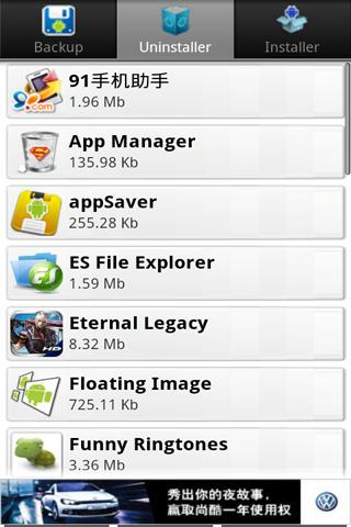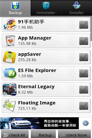 Save Master Download the software can not be saved to SD card and extract the worry ? Will you not because there is no ROOT permissions extraction system procedures and depressed ! Now the problem solved , please download the "Save Master" ! Save Master a special extract the installation directly from the electronic market to your phone software program , very easy to use , just select the files you want to extract , click Save you can save directly to .Save Master is in full accordance with the principles of data backup designed to comply with a set of backup software , without human intervention , the software will perform according to set automatic backups timely manner .Save Master is a very powerful application that can backup or restore all applications and a few other things on your phone installed. You can do it with a Save Master put your MMS, SMS , bookmarks , call logs, system settings, alarm clock, all access points and applications are backed up. Speed Save Master work very fast and easy, you just press a few buttons , it will start working. When the Save Master work is done , you do not belong to reboot your phone.( When the Save Master boot time , what it will be able to make a backup list , and then let you to choose what you want to back up. Preparing backup Save Master Here are three buttons , one is to select all , one does not choose All third is to start the backup when the same master as the backup ready to restore the following also has three buttons, one is to select all , one does not choose all , and the third is to start the restore .Masters of the backup set which you can see there is a button on the view and management, where you can watch your backup files . There is an automatic reminder backup settings, you can set how often to remind you to go back up again. The third is to uninstall the Save Master, the master is not backed up when you feel that you want the software , you can select this to uninstall it.Thank you for your support. )