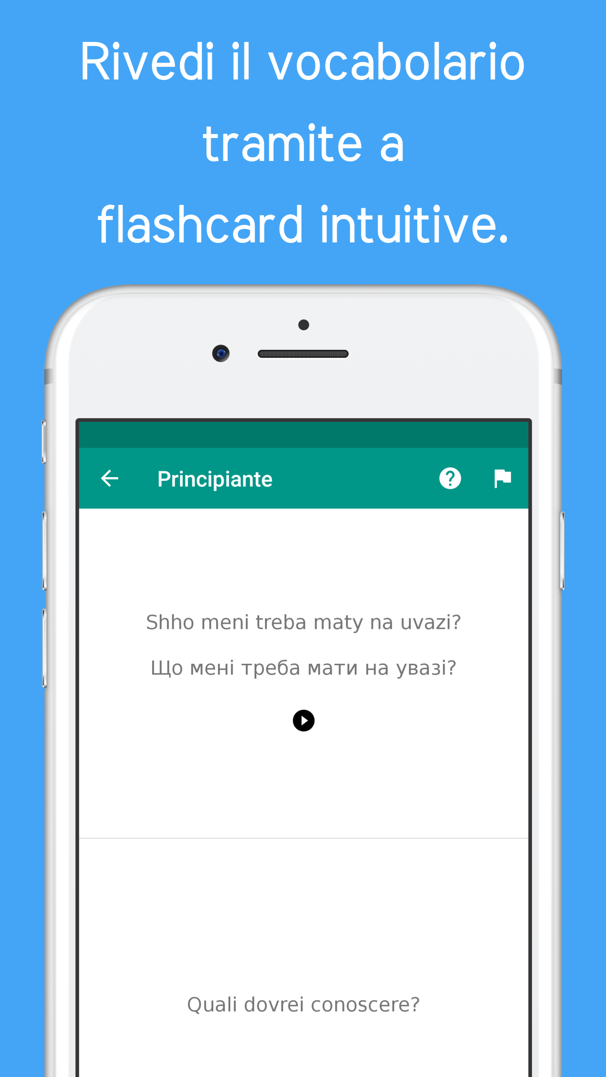 ★★★ Impara il Ucraino per quando visiti la Ucraina ★★★ Impara il Frasario Ucraino in maniera Semplice è un app sulla lingua Ucraino che ti fa imparare il Ucraino in maniera rapida e semplice. Tutte le frasi e le parole in Thailandese ti verranno presentate sia in scrittura fonetica che in Ucraino originale. Vengono tutte registrate da ragazze bellissime e originarie della Ucraina. Una visione dettagliata ti permette di imparare ogni frase in Ucraino con la corrispondente traduzione in Italiano parola per parolo. Salva le tue frasi preferite e le parole da rivedere senza fare molta confusione. Studia il tuo vocabolario tramite le flashcard utilizzando la tecnica delle ripetizioni a distanza. Testa le tue conoscenze divertendoti con la lingua Ucraino tramite quiz e rivedendo il tuo risultato.