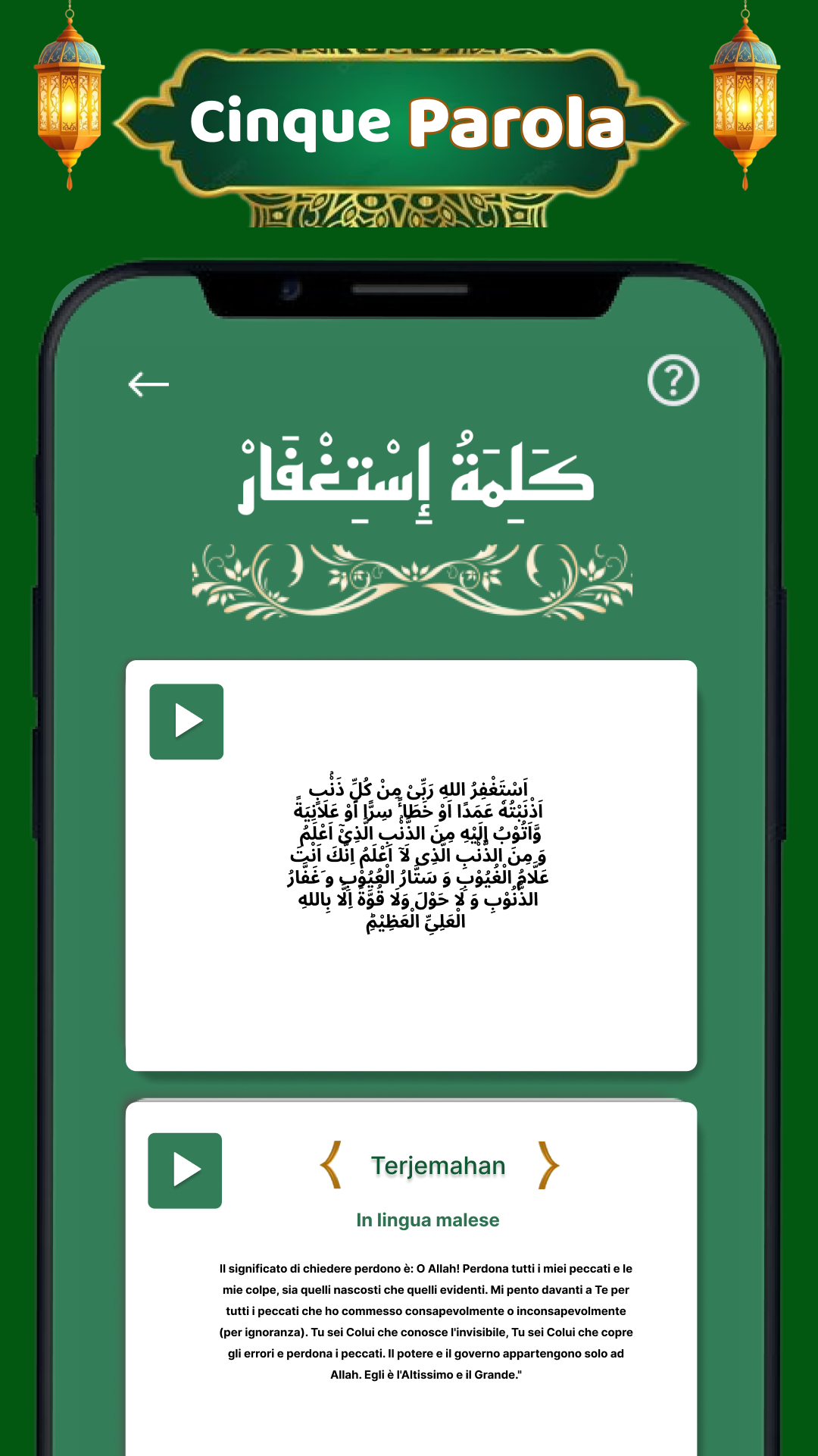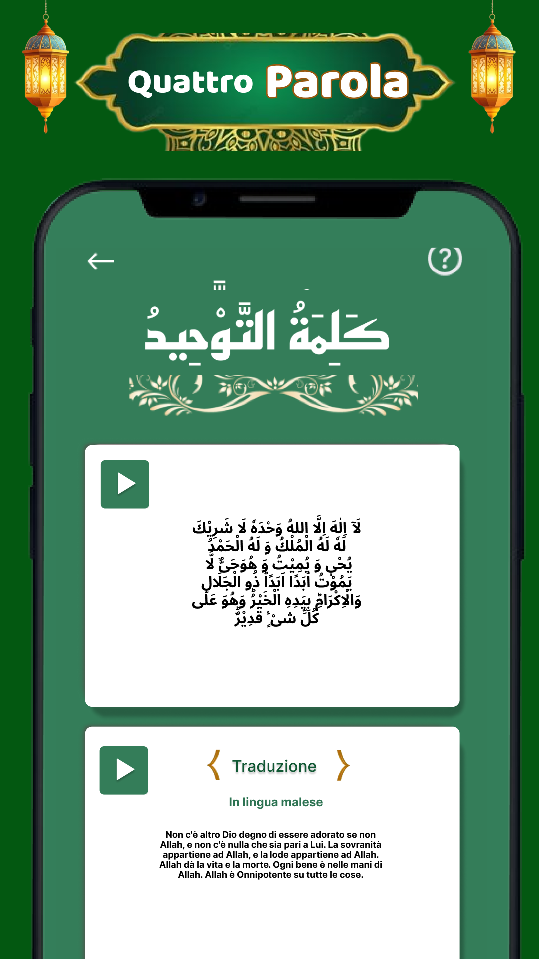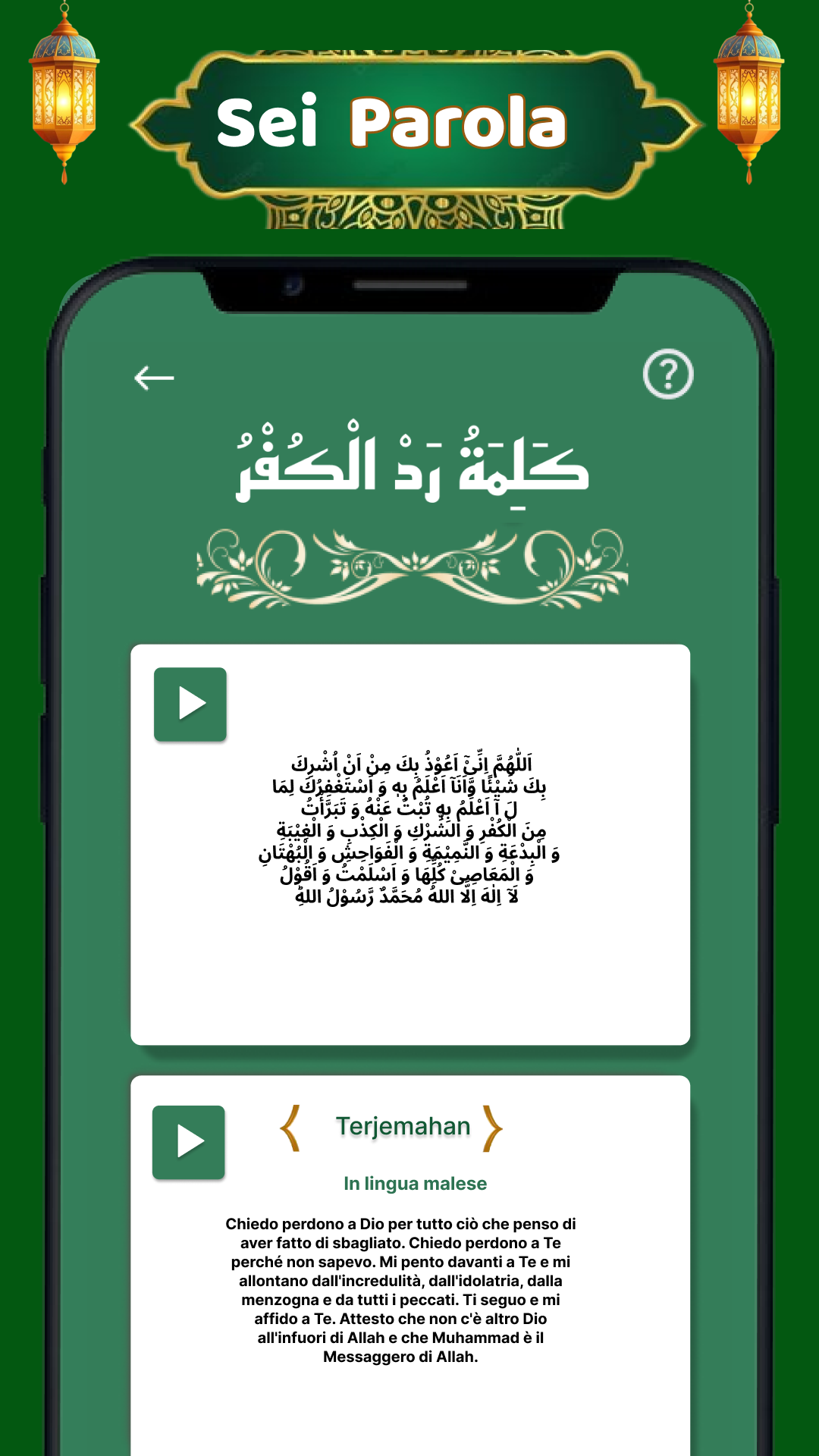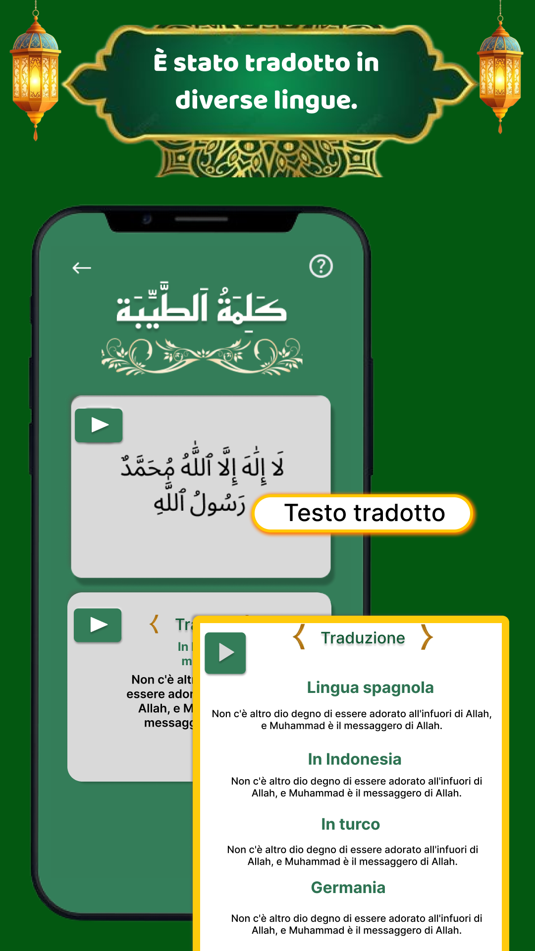 Milioni di musulmani in tutto il mondo praticano regolarmente la recitazione dei 6 Kalima dell'Islam. Cerchi un'app offline per i 6 kalma autentica, facile da usare, da ascoltare e imparare? Unisciti a noi in un viaggio profondo per esplorare il potere trasformativo dell'ascolto e della recitazione dei Sei Kalima dell'Islam. L'app 6 Kalma è un'applicazione Android semplice ma accattivante che inculca i Sei Kalima con la recitazione audio, coinvolgendoti nell'ascolto e nell'apprendimento dei sei kalma dell'Islam. I Sei Kalima dell'Islam sono: Primo Kalima (Tayyab), Secondo Kalima (Shahadat), Terzo Kalima (Tamjeed), Quarto Kalima (Touheed), Quinto Kalima (Astaghfar), Sesto Kalima (Radd-e-Kufar). Inoltre, l'app 6 Kalima include anche traduzioni con audio in oltre 18 lingue, tra cui inglese, urdu, arabo e hindi. L'audio offline dei 6 Kalma semplifica l'apprendimento a memoria dei sei Kalima dell'Islam, senza bisogno di internet. Tutti i Sei Kalma e i dua per bambini sono disponibili con audio con pronuncia corretta (Tajweed) e traduzioni autentiche nella tua lingua madre. Star 🕋 Scoprire l'essenza dei 6 Kalima dell'Islam I 6 Kalma e i dua per bambini sono le preghiere obbligatorie dell'Islam, registrate in diversi libri. Esplora questi insegnamenti dei 6 Kalima dell'Islam da ascoltare, imparare e recitare con audio, traduzioni e traslitterazioni in oltre 18 lingue. • Il primo Kalma "Tayyibah" si concentra sulla purezza • Il secondo Kalma "Shahadah" è una dichiarazione di fede • Il terzo Kalma "Tamjeed" loda la gloria di Allah • Il quarto Kalma "Tawheed" enfatizza l'unicità di Allah • Il quinto Kalma "Istighfar" chiede perdono • Il sesto Kalma "Radde Kufar" rifiuta la miscredenza 🕋 Comprendere i 6 Kalma con traduzioni in oltre 18 lingue In questa esplorazione completa, intraprendiamo un viaggio per svelare l'essenza dei sei Kalima dell'Islam, comprendendone il significato e la corretta pronuncia con traduzioni in oltre 18 lingue, tra cui inglese, urdu, hindi, persiano, spagnolo, francese, olandese e portoghese. Ci sono persone diverse che vivono in paesi diversi come Pakistan, India, Arabia Saudita, Dubai, Inghilterra, Iran, Russia ecc. che parlano e capiscono lingue diverse. 6 Kalma "Impara, ascolta e recita" offre la traduzione insieme alla recitazione in arabo. Basta toccare il testo per ascoltare con l'aiuto di Google Traduttore. 🕋 Ascolta, impara e recita con il Tajweed audio dei 6 Kalma L'obiettivo principale di questa app islamica è condividere la conoscenza dei sei kalima con chiunque desideri ascoltare, imparare e recitare i 6 kalma in audio offline, offrendo anche una funzione per condividere con amici e familiari. In questa app le persone recitano i kalma in arabo e li comprendono grazie alla traduzione. Il traduttore vocale di Google è stato utilizzato per le persone che hanno difficoltà a leggere e tradurre. 🕋 Memorizza e recita i 6 Kalma offline ogni giorno Nel tessuto della fede islamica, i 6 Kalma occupano un posto di profondo significato. Conosciuti come Shahada, costituiscono la dichiarazione di fede fondamentale per i musulmani di tutto il mondo. Grazie al significato che riveste nei cuori e nelle vite di milioni di musulmani devoti, offriamo 6 Kalma offline, così che possiate ascoltarli, impararli e recitarli senza internet, sempre e ovunque. Questa app è utile ai musulmani di ogni età per imparare e conoscere i 6 Kalma fondamentali dell'Islam. 🕋 Caratteristiche salienti • Ascolta, recita e impara i sei Kalma dell'Islam in arabo • Tutte le traduzioni dei 6 Kalma in oltre 18 lingue, tra cui inglese, urdu, hindi, persiano, spagnolo, francese, olandese e portoghese • Audio dei 6 Kalma in arabo e traduzioni con 1 clic • Applicazione Android offline dei 6 Kalma per l'uso senza internet • Condividi con i tuoi cari, amici e familiari • Facile da usare e da memorizzare
