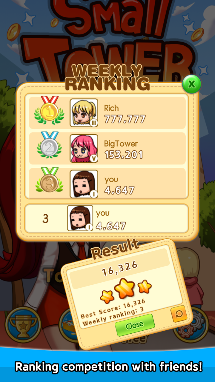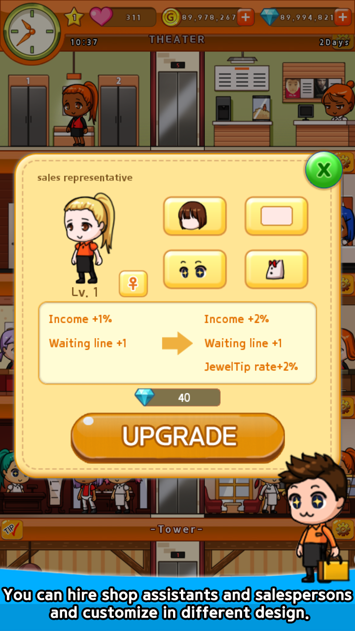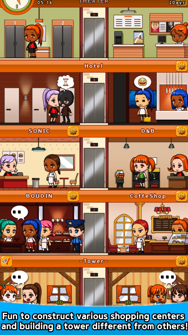 ◇◆Construct a tower of your dream!◆◇ Build diverse shopping centers from bakery to hotel and develop into a famous, luxurious high-rise tower filled with customers~ ☞Excitement of building with every effort Fun to build a tower different from others with my sense! ☞Customize You can hire shop assistants and salespersons and customize in different design. ☞Catch a thief! Find a thief breaking into the mall and get rid of the thief quickly! ☞Ranking competition with friends What is the ranking of my tower? Once daily schedule is done, you can view the score and stars for the day. Develop your tower to the best tower!
