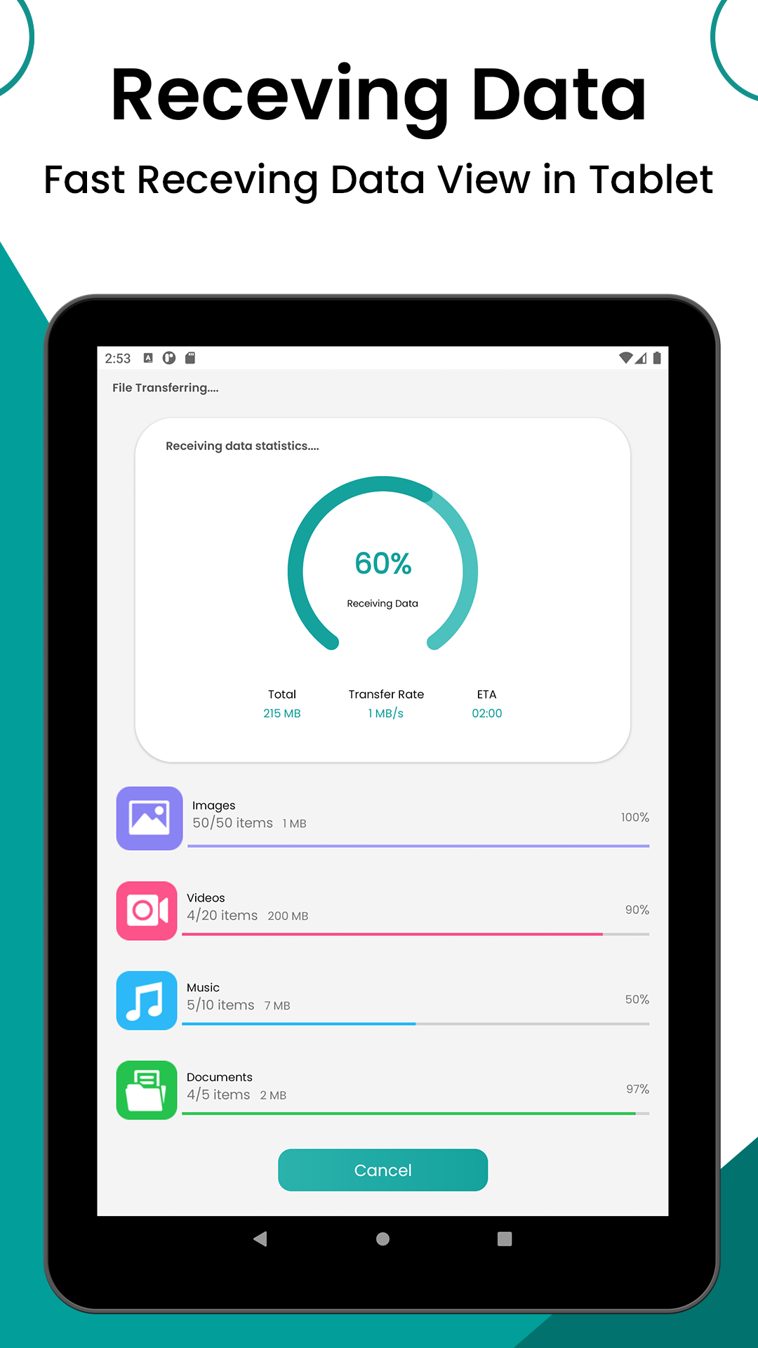 Condivisione di foto, musica, video, app, documenti e qualsiasi altro tipo di file di dimensioni illimitate. Non preoccuparti se il tuo trasferimento è stato interrotto a causa di un errore tecnico. Puoi riprenderlo con un semplice tap senza ricominciare da capo.