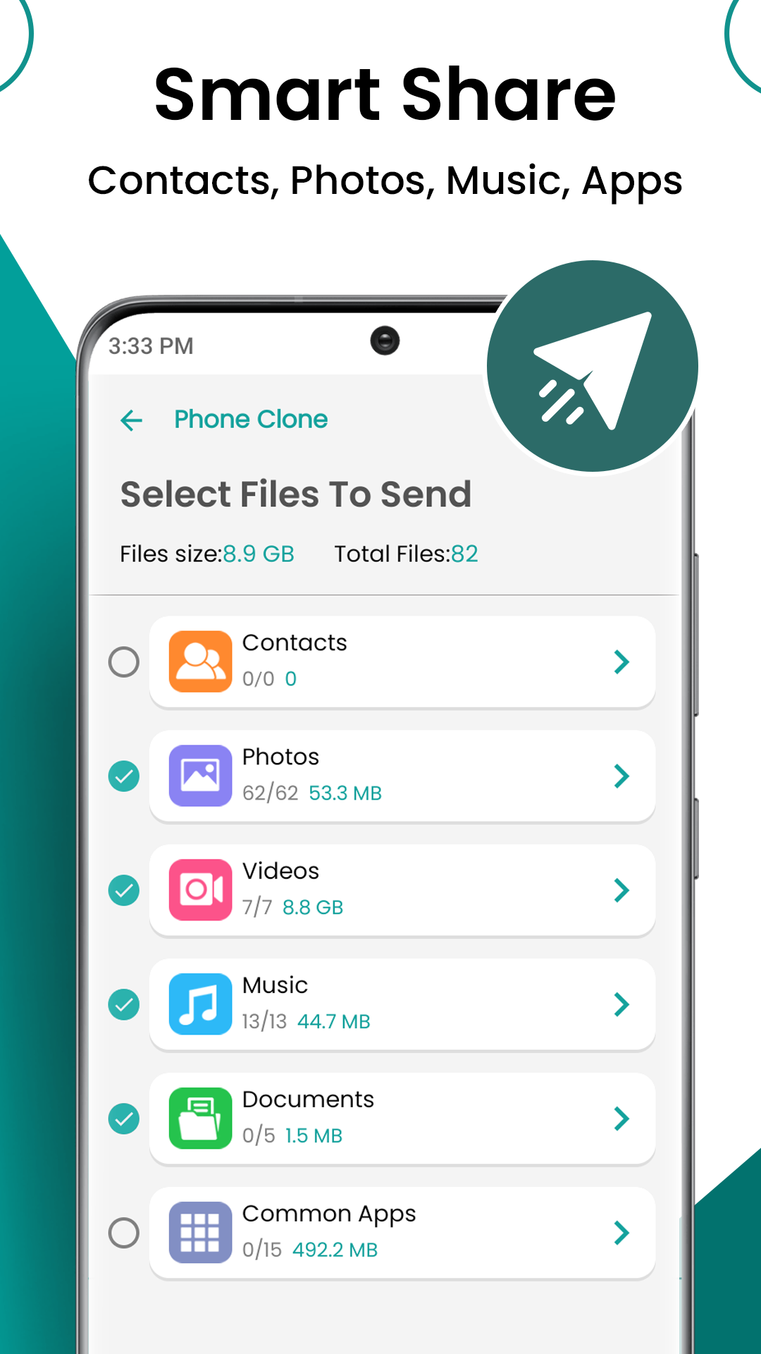 Phone Clone è un'app per il trasferimento dati gratuita progettata in modo intuitivo. Fornisce un modo rapido e semplice per condividere file inclusi foto, video, musica, contatti, docx, apk e altri file di grandi dimensioni sul tuo nuovo dispositivo. Tutte le app di condivisione dati per il trasferimento di file ti consentono di condividere i tuoi dati importanti in pochi istanti dal vecchio telefono al nuovo telefono. Eppure questo moderno telefono clone migra i dati rapidamente. Ora selezioni qualsiasi cosa a tua scelta, esegui il passaggio intelligente senza dati da telefono a telefono tramite il miglior strumento di trasferimento Android condividi l'app di clonazione del telefono.