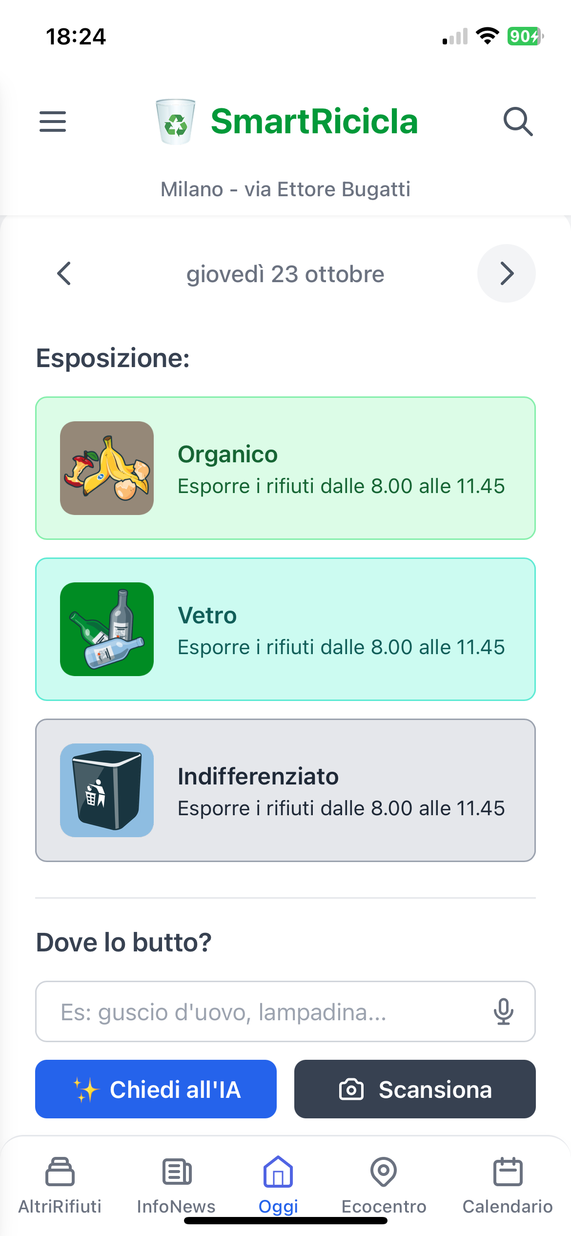 Hai mai avuto un dubbio su dove gettare un contenitore o un imballaggio? Ti sei mai dimenticato di esporre il bidone giusto nel giorno corretto? SmartRicicla è la soluzione definitiva che mette fine a ogni incertezza, aiutandoti a riciclare correttamente e a contribuire a un pianeta più pulito.