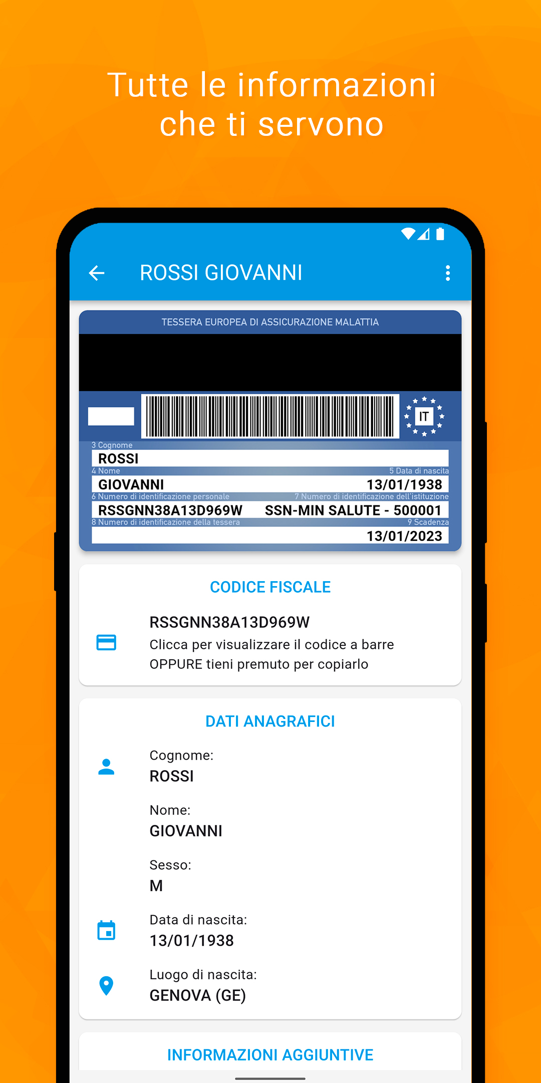 Accedi velocemente al codice a barre di ogni Tessera Sanitaria o Carta d'identità Elettronica e fallo scannerizzare quando necessario, ad esempio in farmacia.