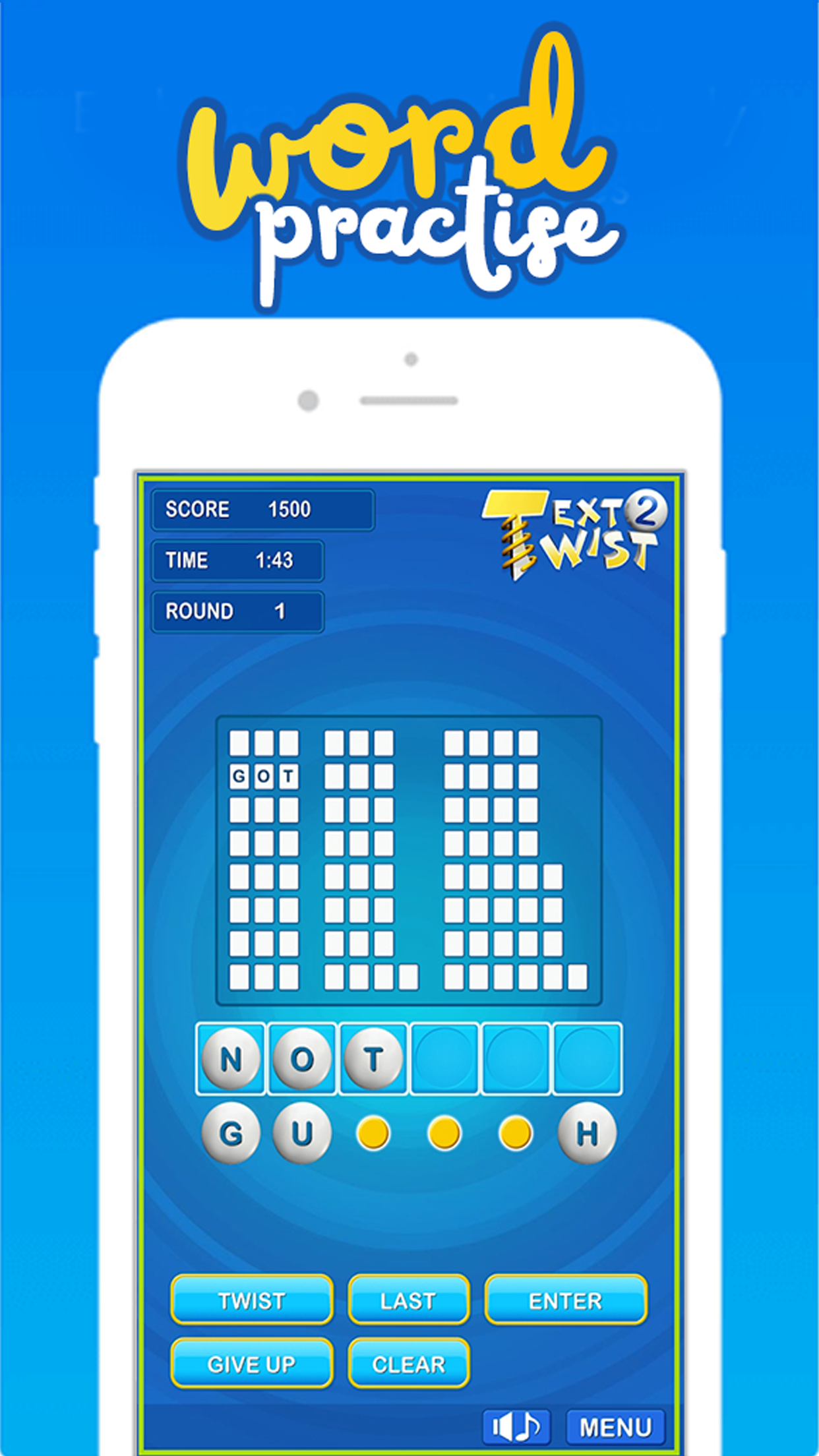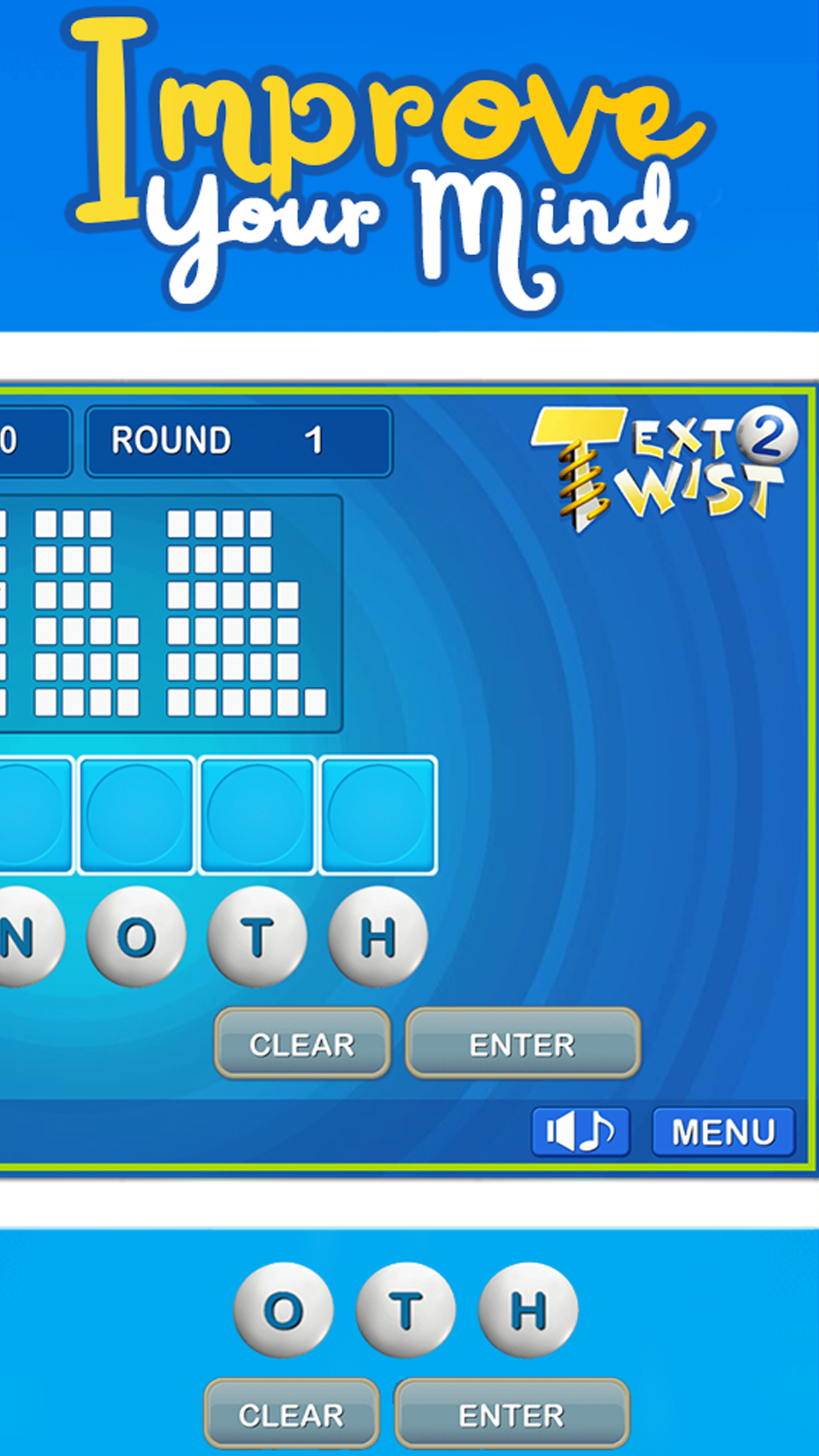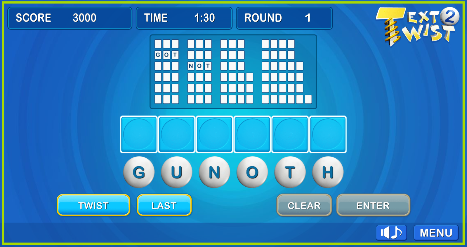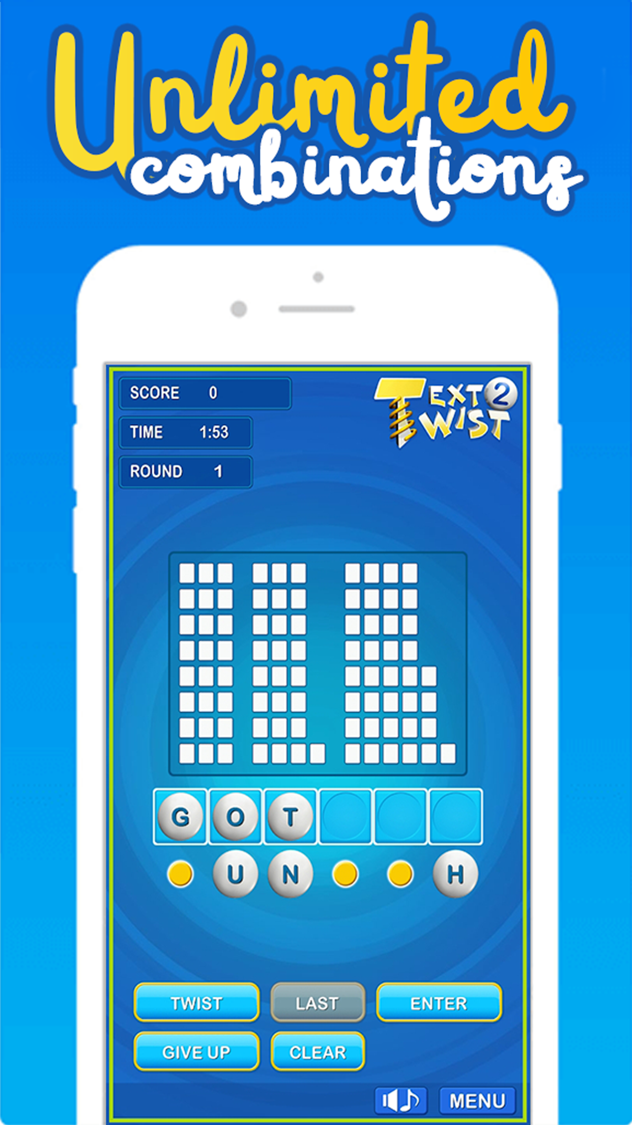 Giriamo! Preparati al divertimento di trovare parole in Text Twist 2! Guarda le lettere miste e trova tutte le combinazioni di parole. Hai bisogno di almeno una parola di sei lettere per passare al turno successivo. Usa il pulsante Ruota per riorganizzare le lettere e trovare più combinazioni. Metti alla prova le tue abilità di vocabolario e prova a segnare il maggior numero di punti possibile. Quanti round puoi vincere? Preparati per il miglior gioco di parole.