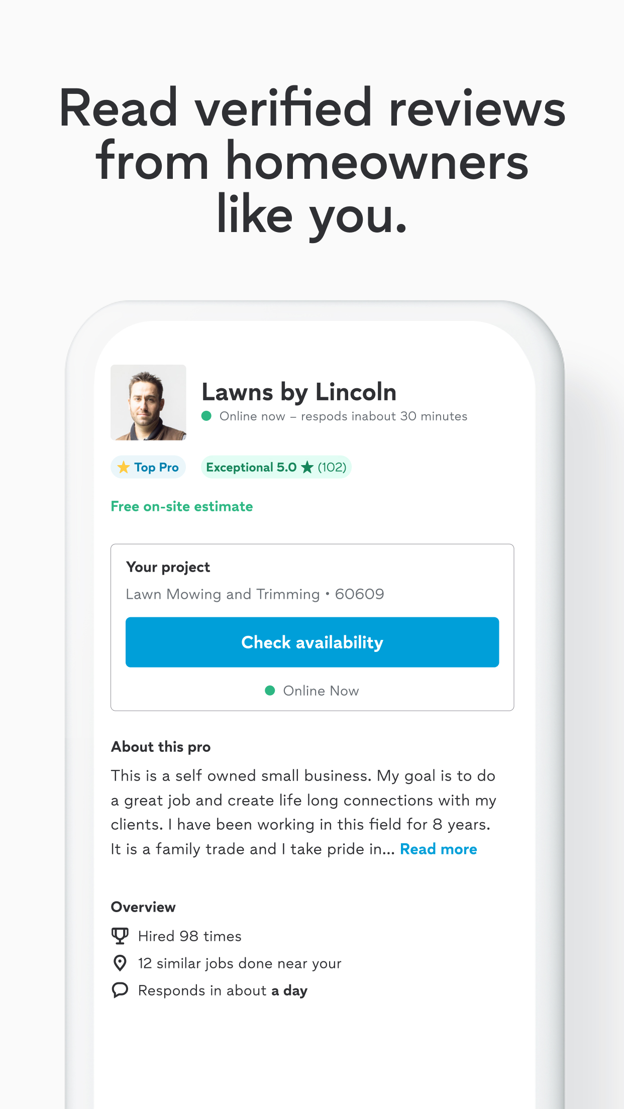 Thumbtack ti fa risparmiare tempo cercando tra centinaia di profili, così puoi trovare professionisti locali adatti al tuo progetto. Da talentuosi esperti di progettazione d'interni a tuttofare, con Thumbtack puoi scoprire e prenotare servizi per qualsiasi progetto domestico o personale nell'app.