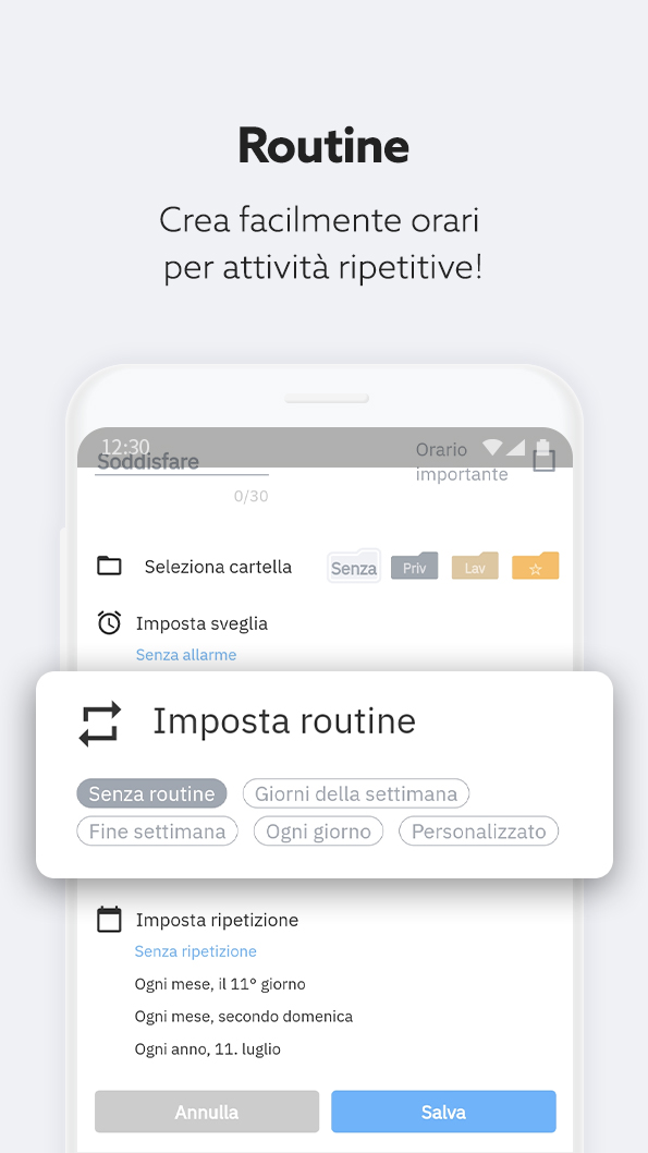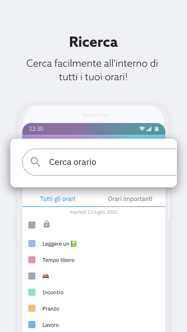 - Crea facilmente orari per attività ripetitive come sport, lavoro, scuola, ecc.