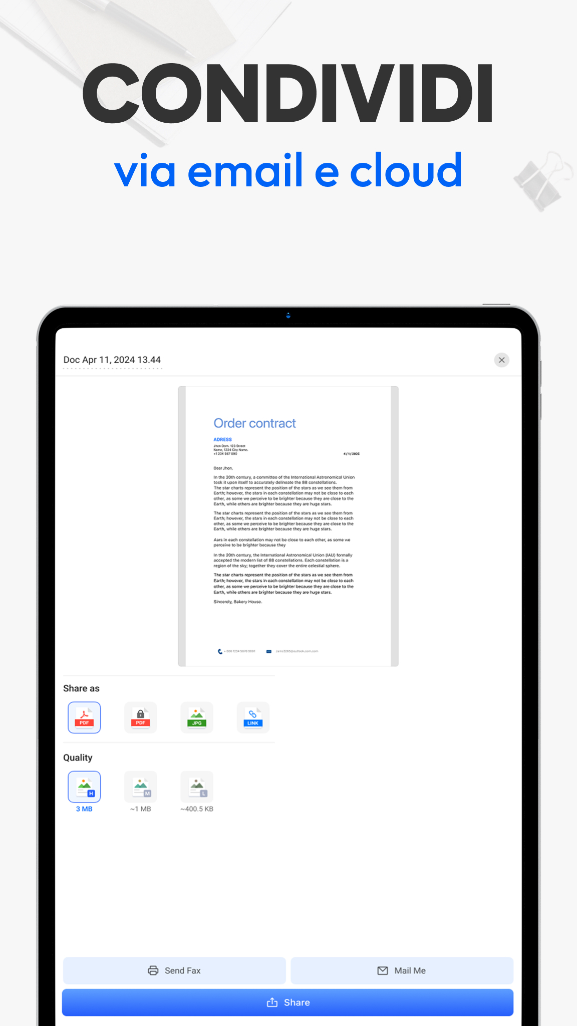 Invia PDF o immagini scansionati tramite email, app di messaggistica o cloud. Stampa o invia fax direttamente dal telefono. Condividi facilmente un contratto firmato con colleghi, invia compiti a un insegnante o itinerari di viaggio a un amico.