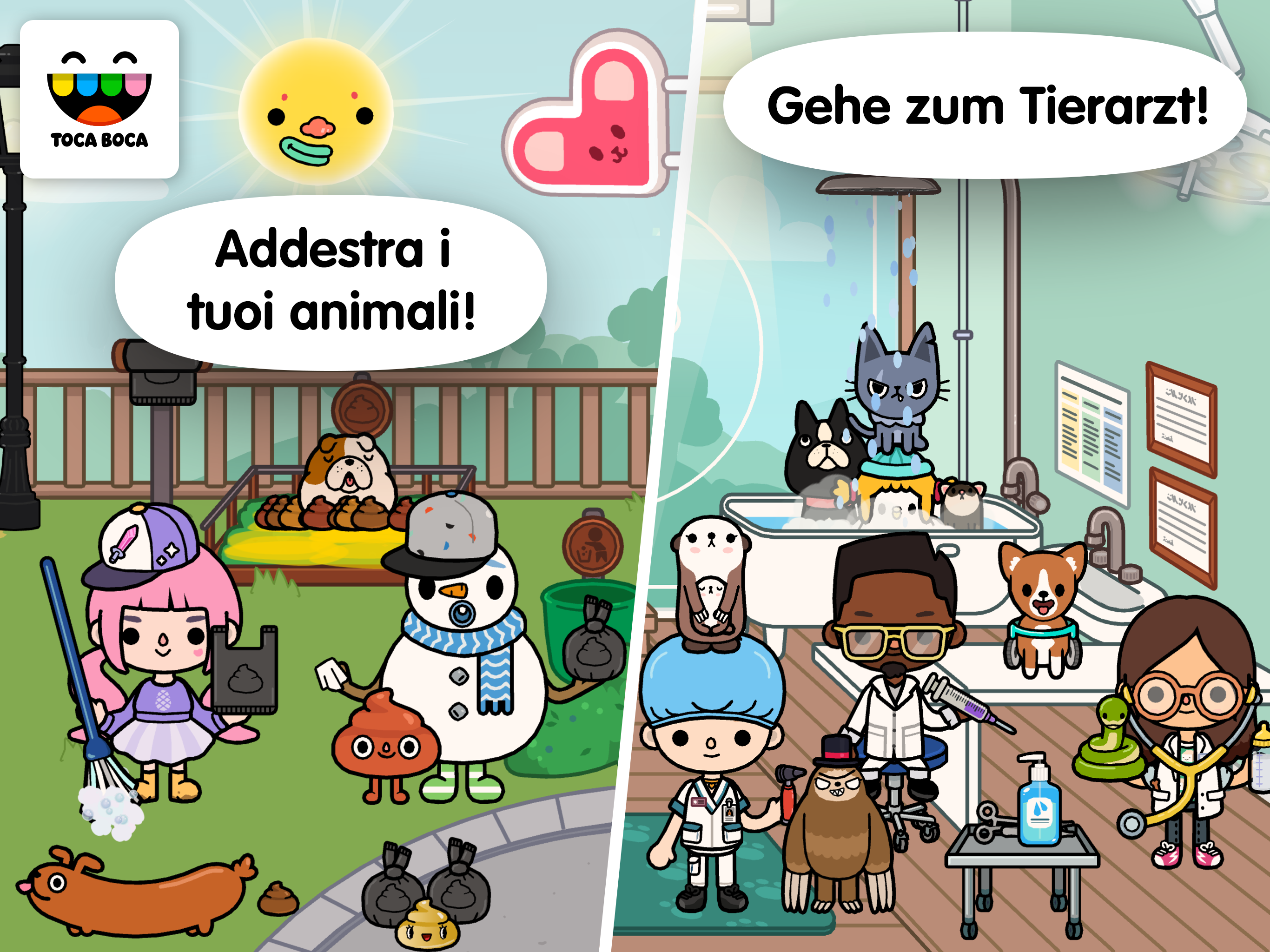 Benvenuti a Toca Life: Pets, dove tu e i tuoi amici animali siete padroni di casa! Come è il tuo animale preferito? Peloso e veloce? Bagnato e scodinzolante? Un po' strano? Con più di 120 animali, Toca Life: Pets ha ogni tipo di animale che puoi immaginare. ESPLORA CINQUE LUOGHI PARCO DEGLI ANIMALI: Goditi l'aria aperta con gli animali! Tuffati nel fiume, fai un picnic sull'erba, fai un gioco o scopri una caverna nascosta. Oppure costruisci un percorso di agilità per addestrare i tuoi animali e mettere alla prova le loro capacità. Guarda un po' in giro, esplora l'albero — potresti trovare alcune sorprese per espandere la tua famiglia di animali! HOTEL DEGLI ANIMALI: A volte le famiglie fanno viaggi senza i loro animali, ma grazie all'hotel degli animali, anche loro possono fare la loro vacanza! Con tanti spazi comodi, un acquario e spazio all'aperto, ogni animale trova un bell'angolino dove giocare o rilassarsi — cane o gatto, uccellino o bradipo-pipistrello! VETERINARIO: Il veterinario può aiutare gli animali malati a sentirsi meglio e aiutare quelli sani a restare sani! Troverai pillole, gocce e gli strumenti necessari per operare su animali malati o feriti. Gli animali possono giocare fuori o aspettare nei comodi lettini fino a che il veterinario non è pronto per visitarli. NEGOZIO DI ANIMALI: Trova tutto quelli che ti serve per curare, nutrire e giocare con i tuoi animali al negozio degli animali. Dopo aver fatto acquisti, mangia un boccone al ristorante del negozio, dove anche gli animali hanno un tavolo! CASETTA DELL'ALLEVATORE: Qui è dove l'allevatore inizia e finisce la sua giornata. La casetta è, naturalmente, piena di animali — si nascondono nella serra e giocano nel giardino e si schizzano nel fango. Non preoccuparti, la vasca da bagno gigante pulirà tutti quanti! CARATTERISTICHE - Gioca in 5 luoghi: parco degli animali, hotel degli animali, veterinario, negozio di animali e casetta dell'allevatore. - Incontra 23 nuovi personaggi. - Gioca e cura 124 animali veri o di fantasia. - Fai il bagno ad animali fangosi e puliscili! - Fingi di essere un veterinario e di curare animali malati o feriti. - Vesti i tuoi animali con buffi cappelli — accumula cappello su cappello! - Costruisci un percorso di agilità per addestrare gli animali e aiutarli a fare l'esercizio di cui hanno bisogno. - Togli i rami nel parco degli animali per scoprire una sorpresa! Chi siamo: Presso Toca Boca crediamo fermamente che il gioco scateni la fantasia dei bambini e li aiuti a conoscere il mondo. Progettiamo i nostri prodotti dal punto di vista dei bambini per consentire loro di divertirsi, essere creativi ed essere chi desiderano essere. I nostri prodotti includono app pluripremiate che sono state scaricate più di 200 milioni di volte in 215 Paesi e offrono esperienze di gioco divertenti, sicure e senza limiti di tempo. Scopri di più su Toca Boca e sui nostri prodotti all'indirizzo tocaboca.com. Informativa sulla privacy: La privacy è una questione che prendiamo molto seriamente. Per maggiori informazioni sul modo in cui trattiamo queste tematiche, leggere la nostra informativa sulla privacy all'indirizzo http://tocaboca.com/privacy
