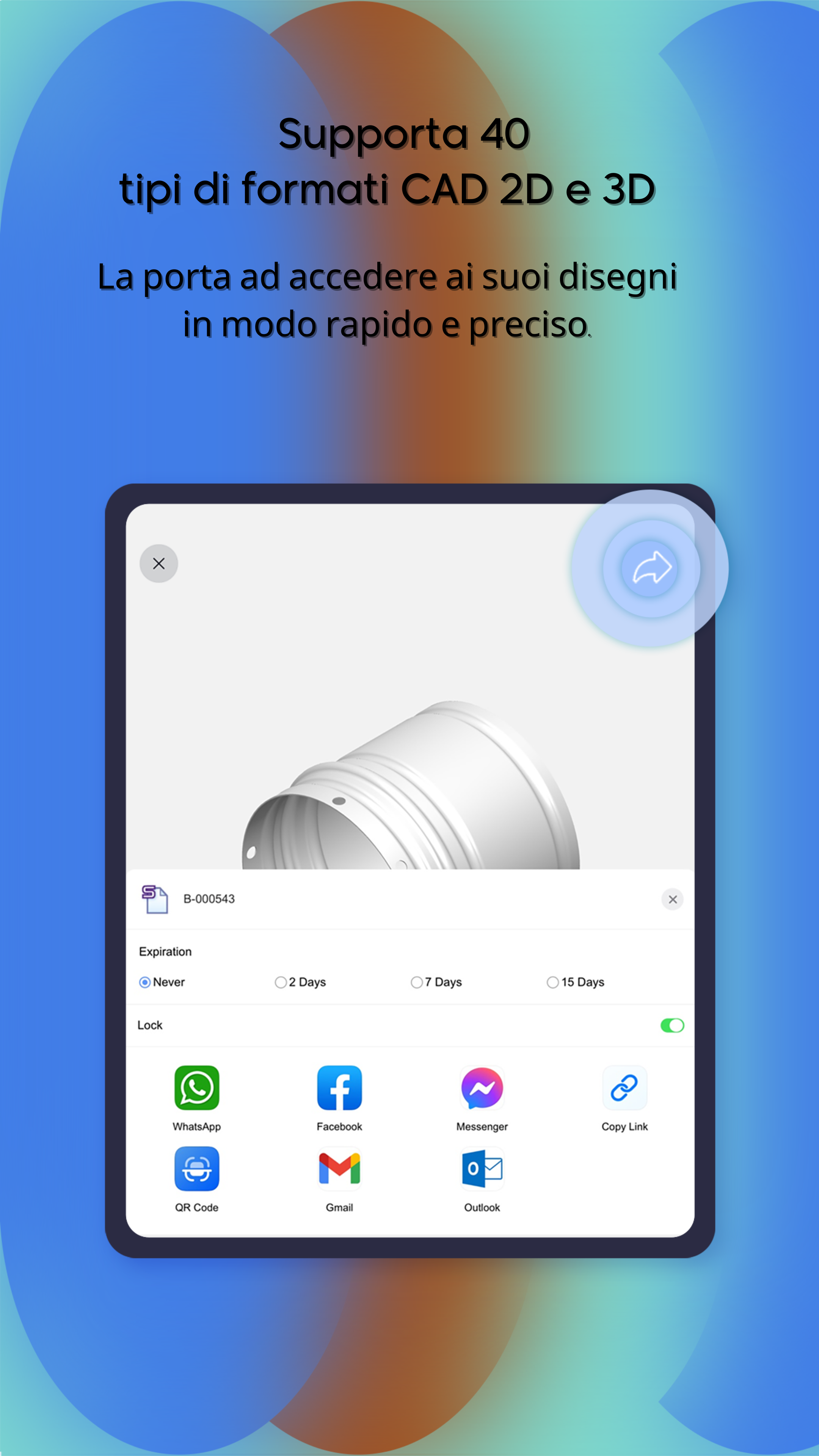 Condividi modelli 3D e disegni CAD archiviati su telefoni cellulari e computer con altri con un clic e fornisci [condivisione pubblica] e [condivisione crittografata]. La condivisione crittografata può impostare password di accesso, periodo di validità, tempi di accesso, autorità di visualizzazione, ecc., in modo da realizzare una condivisione sicura.