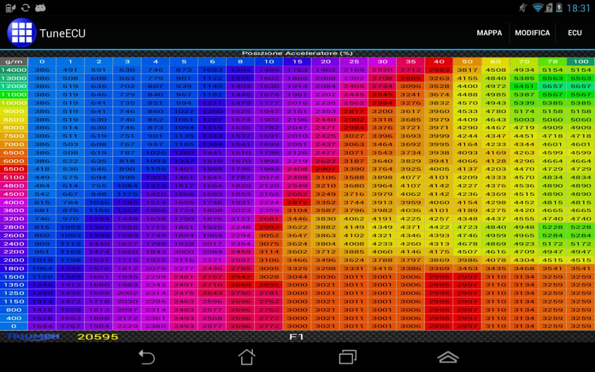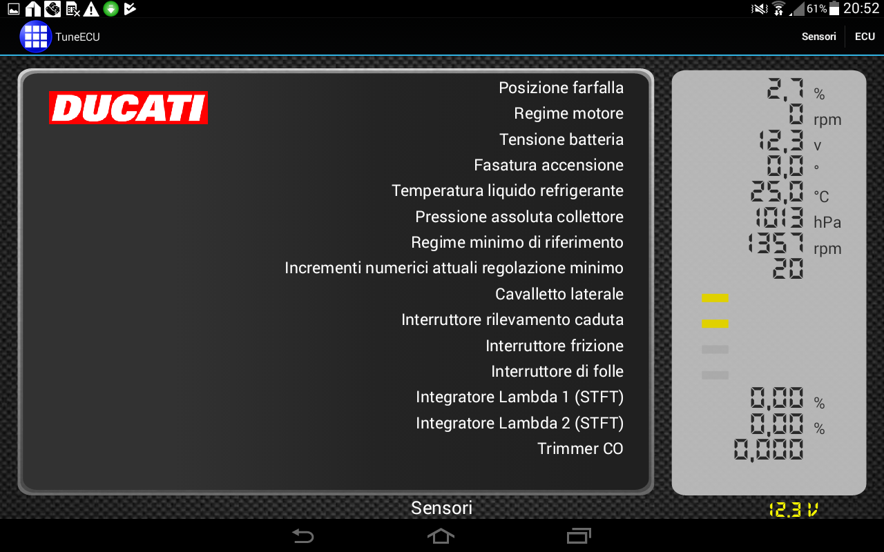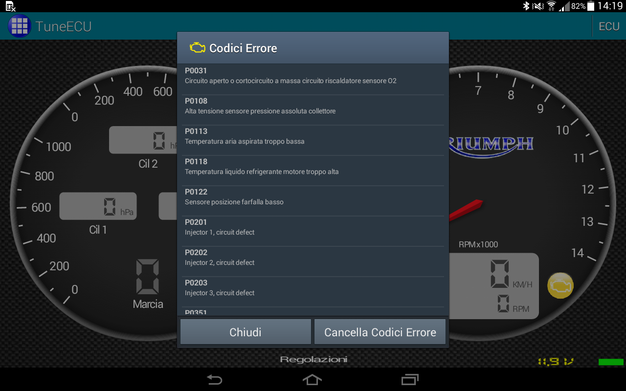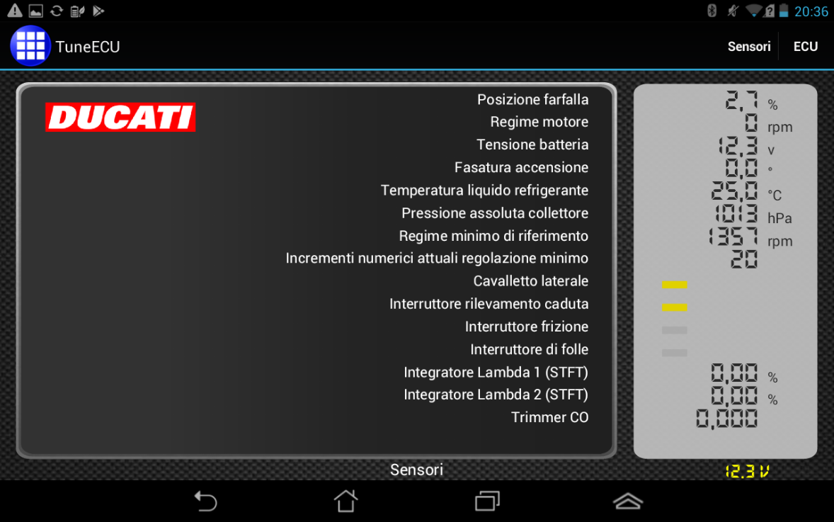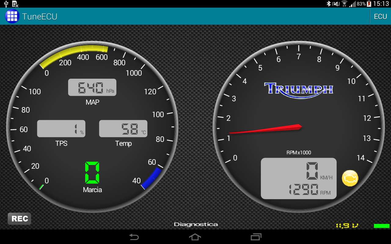 TuneECU è un'applicazione che permette la riprogrammazione (1), diagnosi e collaudo della centralina (ECU) per motociclette Triumph, KTM, Aprilia, Benelli, Ducati e Moto Guzzi. Questa applicazione richiede un cavo USB/OBD2 con chipset FTDI o un adattatore Bluetooth ELM327. *Attenzione* Non ci sono un sacco di clone ELM327 adattatori circolante che non stanno lavorando con TuneECU, è necessario utilizzare gli adattatori consigliati per TuneECU. (1) https://tuneecu.boards.net/thread/493/bikes-list-compatibility (2) https://tuneecu.boards.net/thread/494/bluetooth-adapter E' altamente raccomandato visitare il sito http://tuneecu.boards.net prima di usare questa applicazione.
