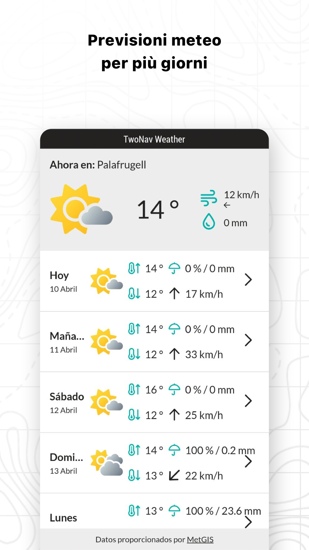 TRASFORMA IL TUO SMARTPHONE IN UN POTENTE SISTEMA DI NAVIGAZIONE Esplora l’ambiente circostante con le migliori mappe, percorri i percorsi più spettacolari, migliora le tue prestazioni e, soprattutto, pratica le tue attività all’aperto in totale sicurezza. Porta le tue uscite a un livello superiore. _______________________ ADATTA L’APP AL TUO SPORT TwoNav si adatta a diversi sport come escursionismo, ciclismo, motori, volo, sport acquatici... Crea il tuo profilo e l’app adatterà la configurazione in base a quello sport. Pratichi altri sport? Crea profili diversi così l’app si adatta alle necessità di ogni momento. _______________________ NAVIGA IN SICUREZZA Segui il tuo percorso controllando la distanza, il tempo e la salita per raggiungere il tuo obiettivo. Naviga su percorsi creati da te, scaricati o calcolati automaticamente. L’app ti avviserà se ti allontani o se ti imbatti in un imprevisto. _______________________ NAVIGAZIONE GPS SEMPLICE E INTUITIVA Dimentica le vecchie annotazioni su carta. Il tuo roadbook ora è digitale, tutto quello che devi sapere è sullo schermo del tuo smartphone. L’app ti indicherà passo dopo passo quale strada seguire. _______________________ STRUMENTI PER L’ALLENAMENTO Decidi se allenarti per tempo, distanza… o se competere con te stesso tramite TrackAttack™. Migliora le prestazioni di un allenamento precedente, l’app ti dirà se stai migliorando o se devi fare di più. _______________________ CREA I TUOI PERCORSI E WAYPOINT Crea percorsi e waypoint toccando direttamente sullo schermo, organizzali in cartelle e collezioni. Inoltre, puoi arricchire i tuoi riferimenti aggiungendo foto e video. _______________________ OTTIMIZZA LE TUE PRESTAZIONI Monitora sempre i dati chiave della tua attività, come distanze, velocità, tempi e altitudini, sia ciò che hai già percorso che quello che ti resta da fare. _______________________ ALLARMI VISIBILI E ACUSTICI Imposta fino a dove vuoi arrivare, programma gli allarmi per farti avvisare quando superi i limiti che hai fissato (battito cardiaco, velocità, altezza, deviazione dal percorso...). _______________________ TRASMETTI LA TUA POSIZIONE IN TEMPO REALE Con l’esclusiva funzione Amigos™ puoi condividere la tua posizione in tempo reale ovunque tu sia. Così garantirai la tua sicurezza e quella dei tuoi cari. _______________________ ANALISI DETTAGLIATA DEI TUOI PERCORSI Tornato a casa, analizza i tuoi itinerari con il massimo dettaglio e precisione. Rivivi ogni tappa delle tue avventure con grafici, sezioni e oltre 120 campi di dati... _______________________ CONNETTITI CON IL MONDO La connessione al Cloud GO (30 MB gratuiti) ti permetterà di conservare tutte le tue attività in un luogo sicuro e accessibile da qualsiasi parte. Connettiti anche ad altri servizi come Strava, TrainingPeaks, Komoot, UtagawaVTT o OpenRunner, sincronizza le tue attività o scarica i tuoi percorsi migliori. _______________________ PREVISIONI METEO Ricevi report meteo da qualsiasi parte del mondo per i prossimi giorni e per fascia oraria. Controlla dati come temperatura, nuvolosità, pioggia, neve e probabilità di temporali. _______________________ ALZA IL LIVELLO DELLE TUE USCITE Non accontentarti della versione GRATUITA dell’app TwoNav, scopri i piani di abbonamento e accedi alle funzionalità avanzate secondo le tue necessità: - MOBILE: Crea i tuoi percorsi nell’app TwoNav con strumenti semplici. Controlla la distanza rimanente. Ricevi avvisi di deviazione e trova sempre la strada di ritorno. - PREMIUM: Crea i migliori percorsi automaticamente nell’app e aggiungi Land sul tuo computer. Consulta le previsioni meteo. Scarica mappe dettagliate da tutto il mondo. Goditi la vista 3D. - - PRO: Crea le tue mappe personalizzate in Land. Apri mappe di altre fonti in formati speciali. Consulta mappe meteo con l’evoluzione per i prossimi giorni.