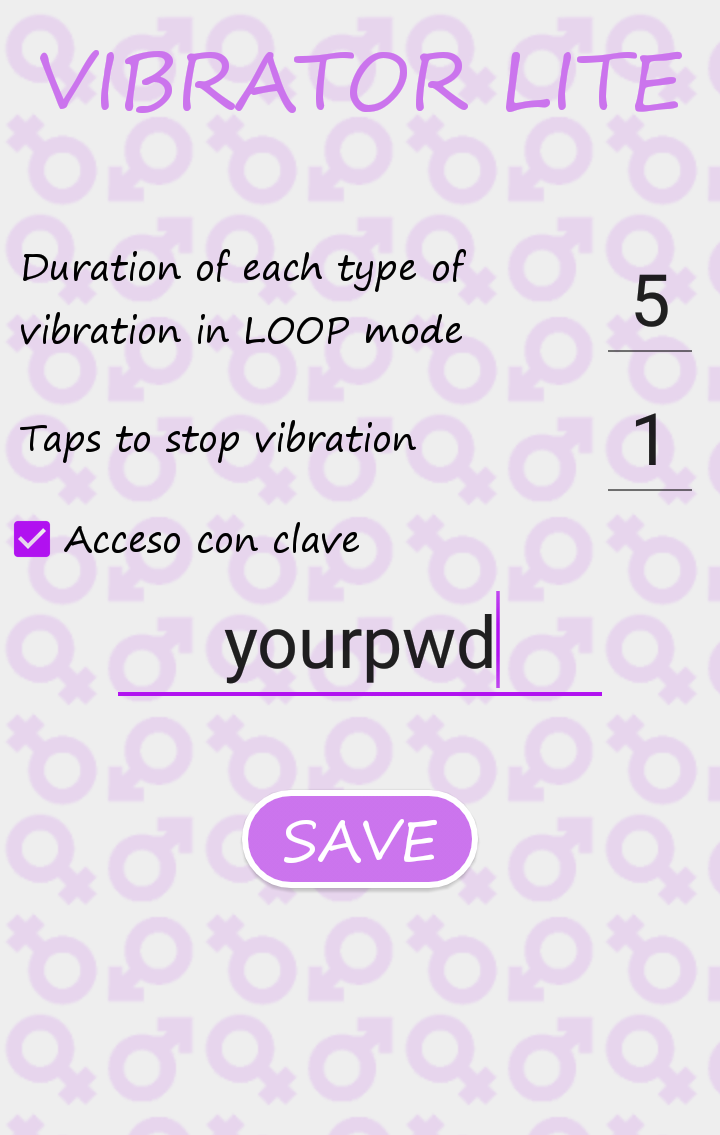 Simple relax app. You can choose from one of the predefined vibration modes or choose your own vibration. In the configuration section, you can change how many times you need to press the STOP button to stop the vibration not unintentionally, set an access password...