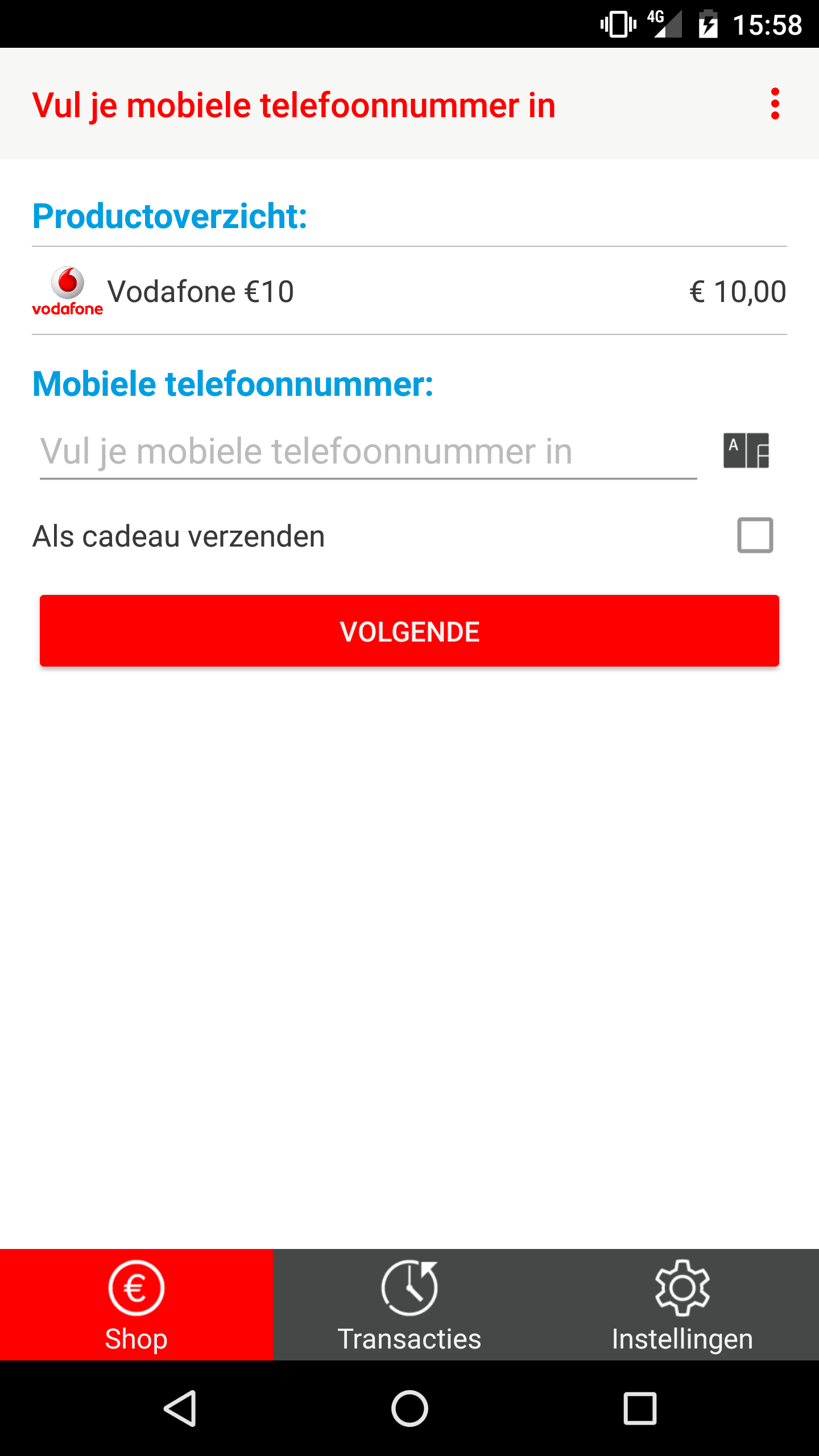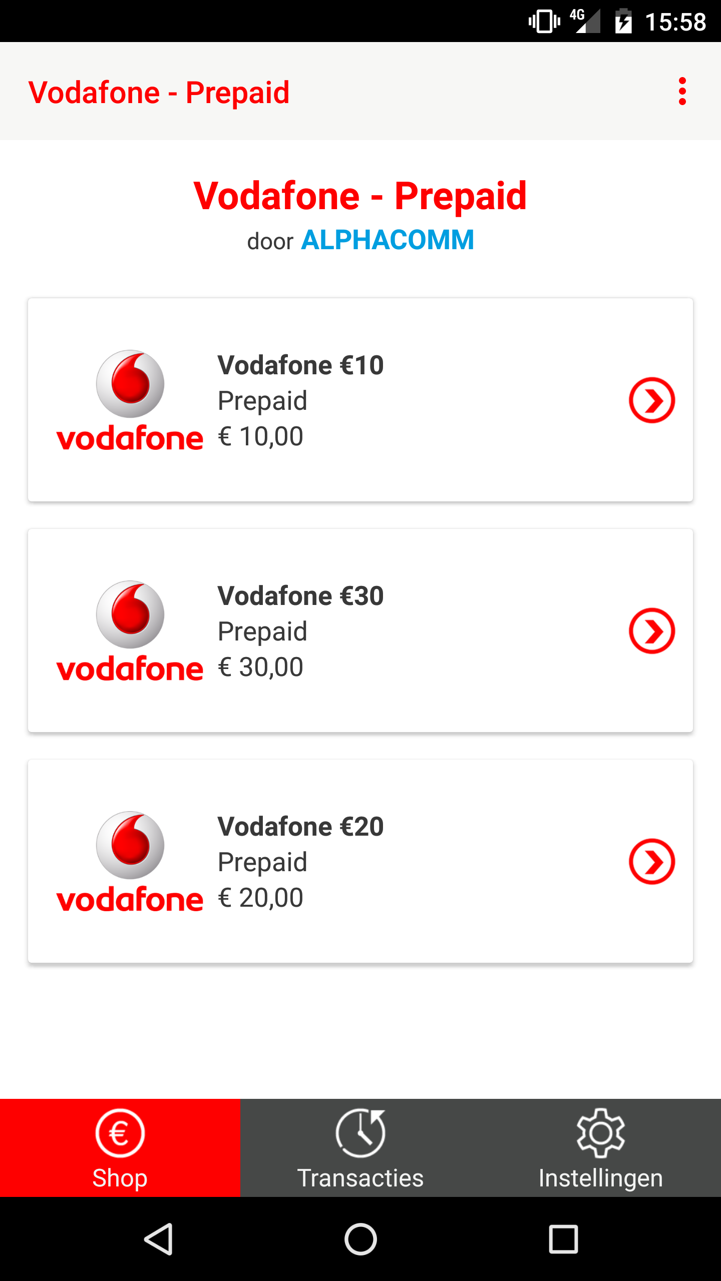 Prepaid beltegoed opwaarderen doe je snel en gemakkelijk en snel met de Vodafone beltegoed app. Direct je beltegoed, bundel of internet opwaarderen en eenvoudig betalen met o.a. PayPal, iDeal, Creditcard of via overboeking. Binnen één minuut krijg je een e-mail met code toegestuurd. Klantvriendelijkheid en gemak staan bovenaan het lijstje. De Vodafone beltegoed app wordt regelmatig vernieuwd en biedt nieuwe functionaliteiten zoals: - Registratie binnen de Vodafone Beltegoed App. - Het automatisch invullen van je gegevens, zodat jij als klant tijd kan besparen bij het kopen van je gewenste product - Wachtwoord wijzigen binnen de Beltegoed App. - Accountgegevens wijzigen binnen de Beltegoed App. - Mogelijkheid om vragen te stellen aan de klantenservice. - Het toevoegen van een creditcard of PayPal account als geregistreerde klant. Hierdoor bespaar jij als klant tijd en ben je één klik verwijderd van bestellen. - Meer informatie over de Beltegoed App updates. - Het ontvangen van pushberichten met daarin acties gecommuniceerd. - Een supersnel bestelproces waarmee je binnen 1 minuut je beltegoed hebt opgewaardeerd Hoe werkt de app? 1) Selecteer het gewenste Vodafone beltegoed, bundel of databundel. 2) Vul je telefoonnummer en e-mailadres in. 3) In de Vodafone App afrekenen via iDeal, overboeking, creditcard en PayPal. 4) Je ontvangt de opwaardeercode in de app en per email Waarom moet je deze app beslist downloaden? - Je kan altijd en overal veilig opwaarderen over Wifi, 3G en 4G; - Bestellen zonder in te loggen. Blijf anoniem!; - Altijd je laatste opwaardeercodes bij de hand in het transactie overzicht; - Eenvoudig herhaalopdrachten uitvoeren via het transactie overzicht; - Verstuur eenvoudig opwaardeercodes naar vrienden en familie; - In-app support, zo kan je altijd contact met ons opnemen. Deze app is gemaakt door Alphacomm Digital Commerce