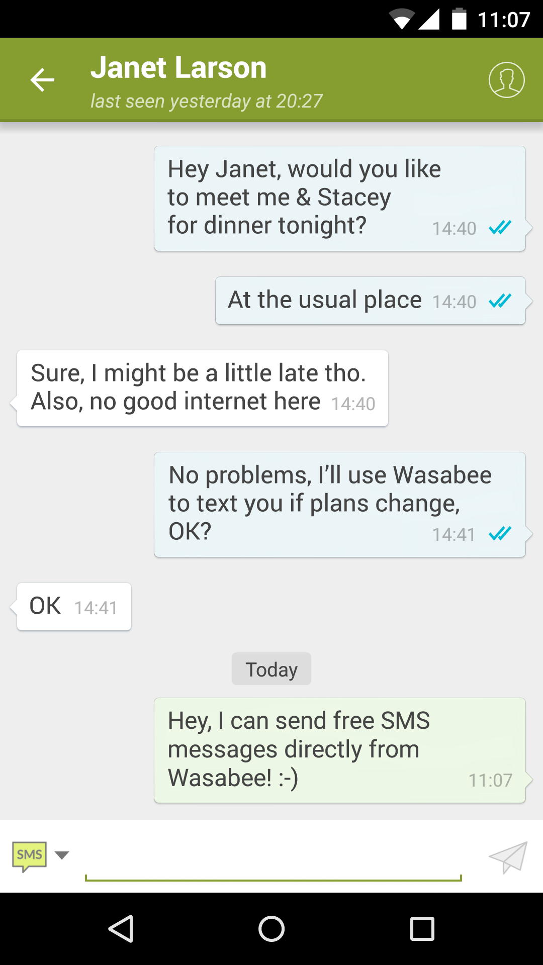 The new way to call & message your contacts! Combine instant messages with free SMS messages and free calls. ★ CALL YOUR CONTACTS FOR FREE Call them directly on their mobile lines, with caller ID, no need for them to install Wasabee. ★ SEND FREE SMS Send free SMS messages to your friends who don’t have Wasabee installed. They’ll appear as if they were sent directly from you! ★ SEND INSTANT MESSAGES Chat with your friends who have Wasabee installed. It’s instant and free and they’ll be notified immediately. ★ SEND FREE ANONYMOUS SMS Have fun and surprise your friends! Send them free anonymous SMS messages, they’ll have no idea they came from you. ★ NO REGISTRATION No usernames, no passwords. Wasabee works with your phone number and integrates flawlessly with your existing phone address book!