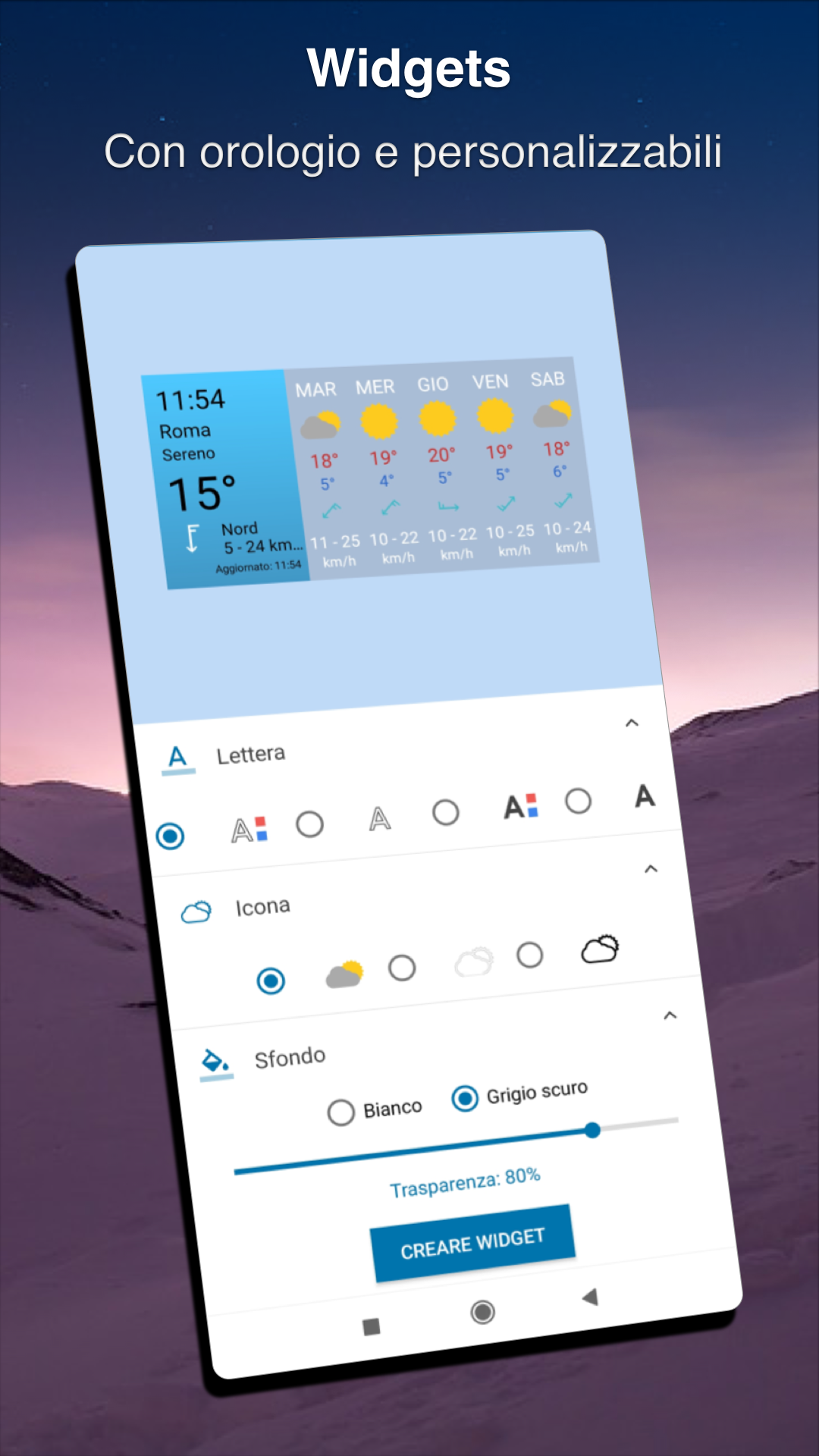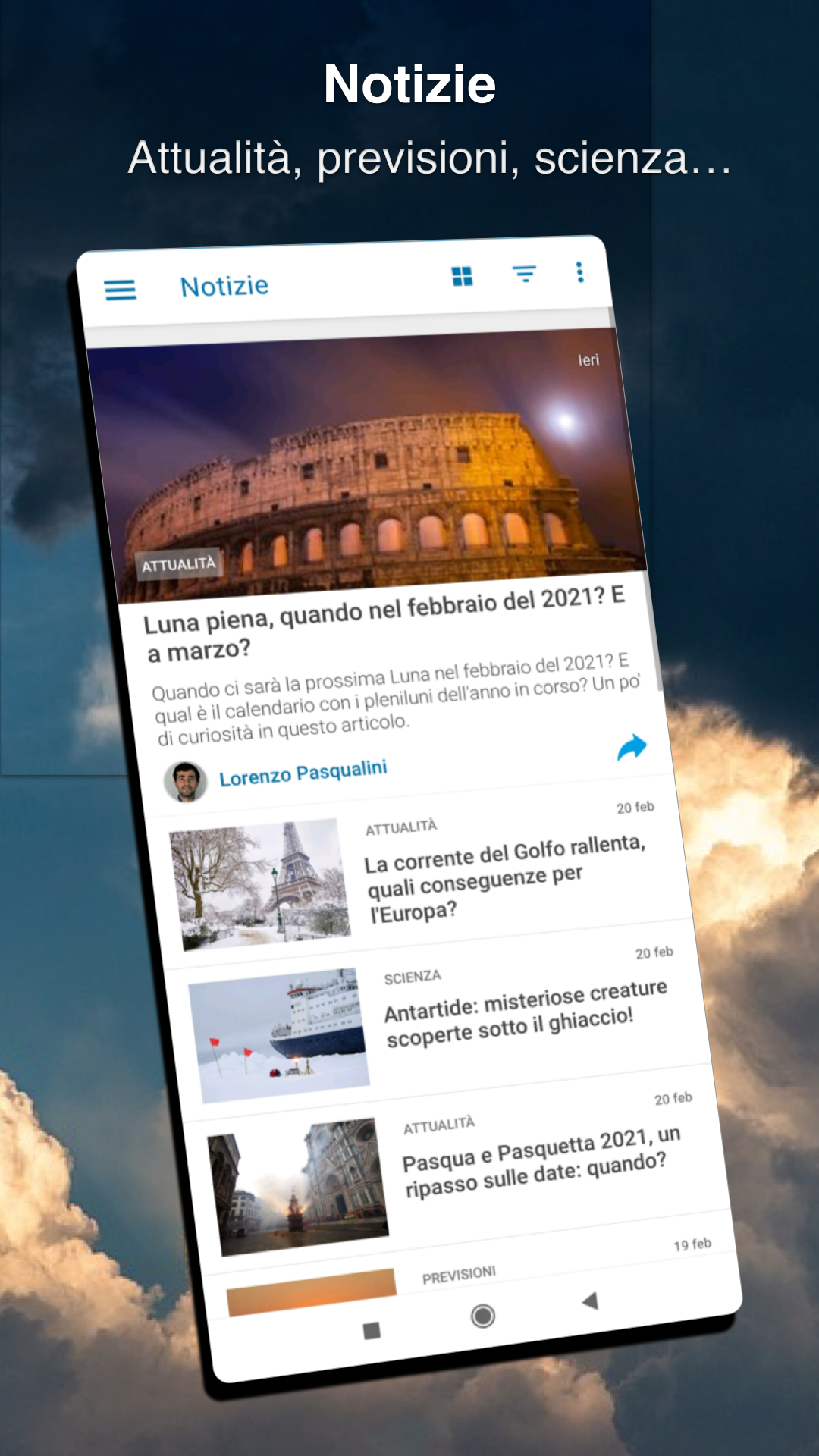 Meteored - Versione Pro Avrai tutto quello che avevi con la versione gratis e inoltre: ✅ Senza pubblicità. ✅ App indipendente. Paga solo una volta e mantienila per sempre. ✅ Scegli che informazioni vuoi vedere nella schermata principale. ✅ Temi di colore sbloccati. ✅ Salva fino al doppio di località. 📱 PERSONALIZZAZIONE Ottieni nuovi Temi di colore completando i nostri Obiettivi, che inoltre ti aiuteranno a scoprire tutte le caratteristiche disponibili. Ricorda! La app cambia colore automáticamente in base alla temperature. Otterrai colori diversi a seconda delle previsioni del tempo. ⚠️ ALLERTE METEO E NOTIFICHE Ricevi le allerte ufficiali per la tua provincia ottenute da MeteoAlarm en fonti ufficiali del paese. Ottieni notifiche di temporali, venti forti e altri fenomeni avversi previsti per le prossime ore. Inoltre, questo Assistente ti indicherà cambiamenti importante del tempo per il giorno successivo o per il weekend. ☔ MAPPE, RADAR INTERATTIVO E SATELLITI - E ora anche una nuova mappa mondiale animata basata sul Modello Europeo (ECMWF) con previsioni per i prossimi giorni. Accedi all’animazione del radar meteo delle ultime ore fornito dalla Protezione Civile e visualizza immagini del satellite visibile, infrarossi e vapore acqueo. 📰 NOTIZIE METEO Consulta la nuova sezione di Notizie per mantenerti aggiornato su tutto quello che succede. Informati sulle notizie d'ultima ora e sulle previsioni meteo più recenti, inoltre ti sorprenderanno i video degli ultimi fenomeni meteorologici estremi e, come se non bastasse, avrai la possibilità di imparare cose nuove grazie ai nostri articoli su scienza e divulgazione, tutto realizzato dai migliori esperti di meteorologia. ⛈ PREVISIONI DEL TEMPO Consulta il meteo in tempo reale così come le previsioni per i prossimi 14 giorni semplicemente scorrendo con il dito. Seleziona un giorno per vedere l’informazioni dettagliata ora per ora, per esempio la pressione atmosférica, la temperatura, la direzione e velocità del vento, la pioggia, la temperatura percepita, l’umidità, l’alba e il tramonto e anche le fasi lunari. Inoltre, gira il tuo smartphone e controlla l’evoluzione del meteo con i nostri grafici. 🌐 WIDGET DEL TEMPO Dopo aver installato l'applicazione, puoi personalizzare il tuo desktop con i widget meteo più recenti. Avrai 8 widget di diverse dimensioni e con diverse informazioni per poter vedere le condizioni meteorologiche attuali. ★ CONDIVIDERE ★ Condividi le previsioni delle tue località preferite con i tuoi amici in ogni momento e in qualsiasi programma di messaggistica o social network che usi sul tuo Smartphone, come ad esempio WhatsApp, Twitter o Facebook. 🗺 DISPONIBILITÀ Trova la località più vicina alla tua posizione attuale o cerca le tue città preferite: Roma, Milano, Venezia, Napoli... e altre località straniere come Madrid, Parigi, Amsterdam... Disponiamo di più di 30.000 località in Italia e più di 6.000.000 località in tutto il mondo! Utilizzando quest'applicazione, accetti la politica sulla privacy e i termini e condizioni di Meteored. Politica sulla privacy https://www.ilmeteo.net/privacy.html Nota legale https://www.ilmeteo.net/nota_legale.html