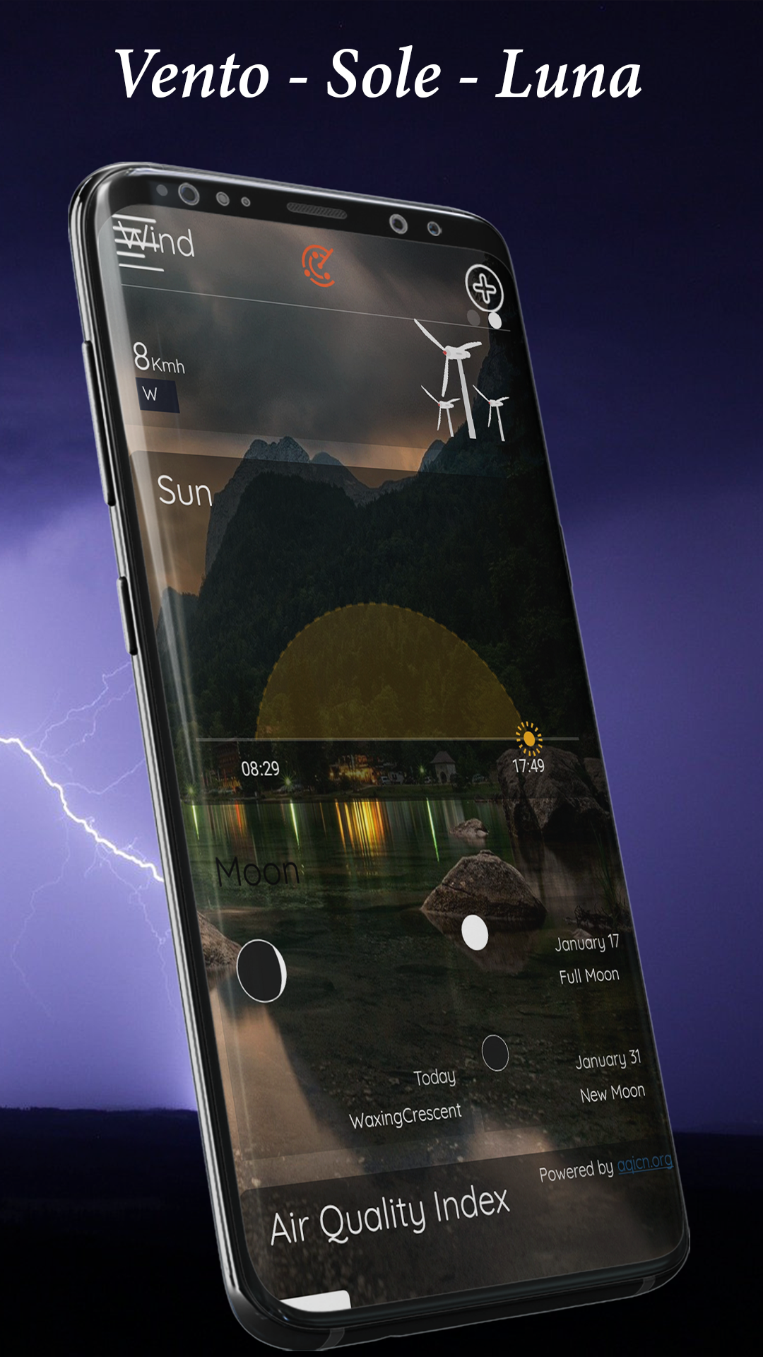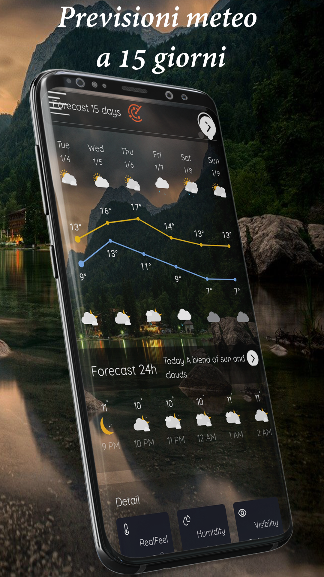 Un'informazione meteo completa è pronta in qualsiasi momento: temperatura in tempo reale, probabilità di precipitazioni, alba e tramonto, fasi lunari, qualità dell'aria, velocità del vento, umidità, distanza di visibilità, mappa radar.