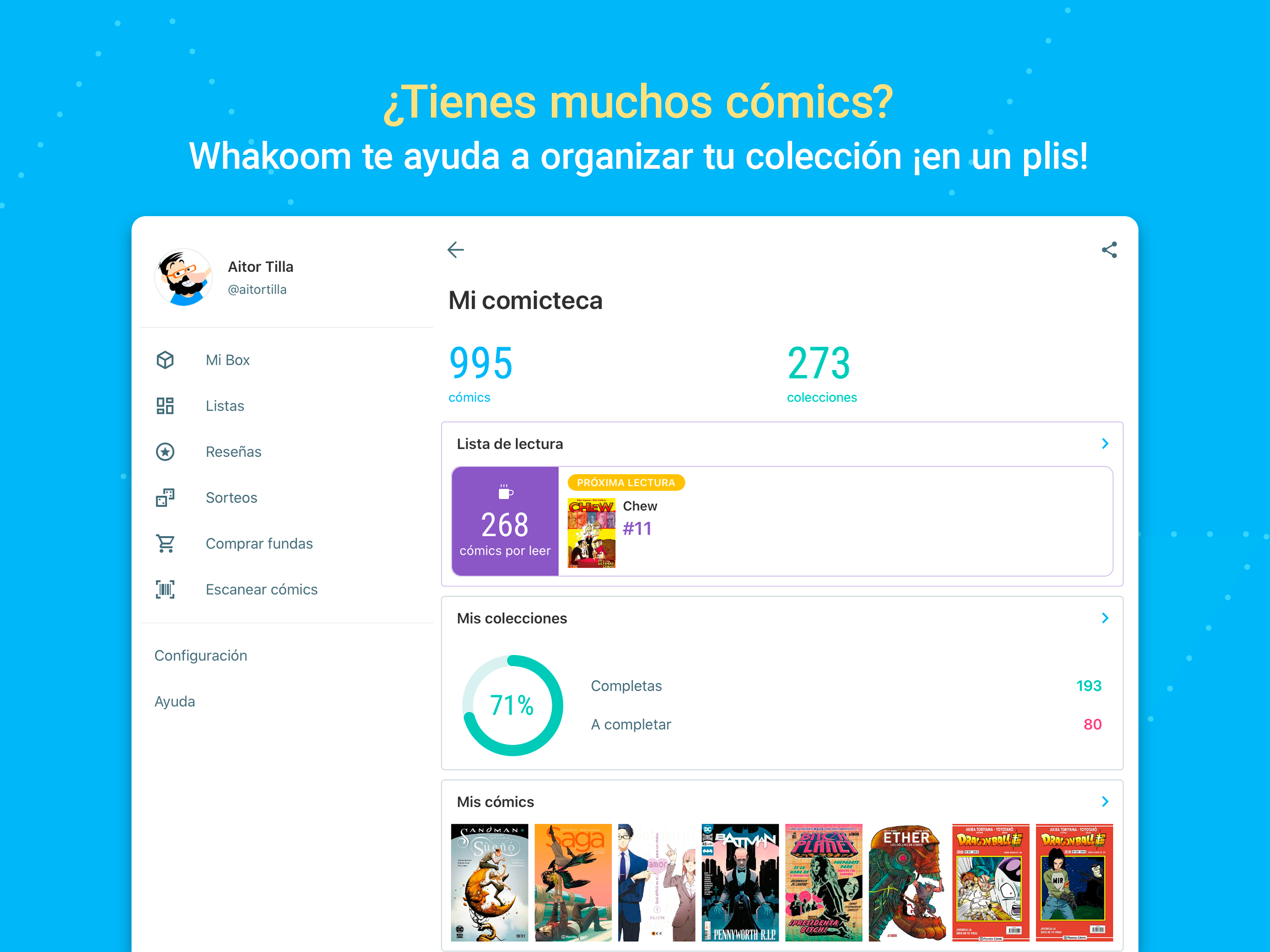 Hai molti fumetti? Whakoom ti aiuta a organizzare la tua collezione di fumetti in modo che tu possa sapere esattamente quali fumetti hai, quali desideri e quali ti servono per completare le tue collezioni.
