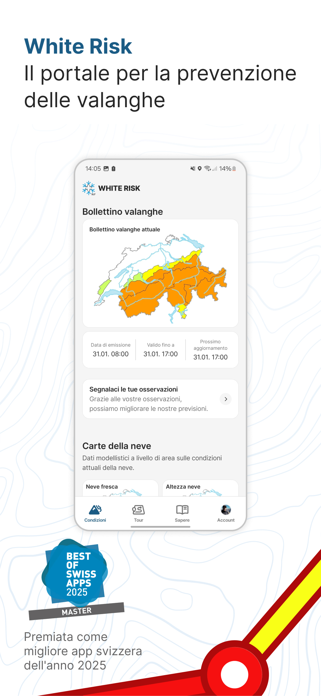 White Risk e la piattaforma svizzera per la prevenzione delle valanghe ed e stata premiata come migliore app svizzera nel 2025. Viene concepita e sviluppata presso l WSL Istituto per lo studio della neve e delle valanghe SLF ed e rivolta a tutte le persone che si muovono in montagna invernale al di fuori delle piste sicure. Oltre al bollettino valanghe e ai dati aggiornati su neve e misurazioni, White Risk include uno strumento di pianificazione dell itinerario specializzato per sci alpinismo, percorsi con le racchette da neve e freeride. Disegna i tuoi itinerari, analizza il terreno con le carte del terreno valanghivo e i punti chiave automatici e pianifica alternative. Con l e learning, White Risk trasmette le conoscenze sulle valanghe e le approfondisce con lezioni ed esercizi interattivi. Pianificazione dell itinerario: Disegna itinerari con supporto intelligente lungo sentieri o percorsi sciistici oppure liberamente nel terreno e salva tutte le informazioni rilevanti della tua uscita in un unico posto. Punti chiave automatici: White Risk analizza il tuo itinerario, contrassegna automaticamente i punti chiave potenzialmente critici e li completa con informazioni rilevanti su valanghe e terreno. Utilizzare le carte offline: Scarica il materiale cartografico con carte topografiche e layer come la pendenza e il terreno valanghivo per la pianificazione e la navigazione durante l uscita. Sincronizzazione su tutte le piattaforme: Tutte le uscite pianificate sono salvate nel conto personale e sono accessibili e modificabili in qualsiasi momento tramite app e web. Bollettino valanghe: Il bollettino valanghe permette di informarsi sulla situazione valanghiva attuale. Offre una previsione regionale del pericolo di valanghe ed e una base importante per la pianificazione dell itinerario. Carte della neve, valori di misura e osservazioni: Rappresentazione delle quantita attuali e previste di neve fresca e dell altezza della neve per la Svizzera, integrate con i valori delle stazioni di misura e con osservazioni attuali come valanghe e profili di neve. E learning: White Risk trasmette le conoscenze sulle valanghe con grafici, video e animazioni e le approfondisce in lezioni interattive con esercizi e test di conoscenza.